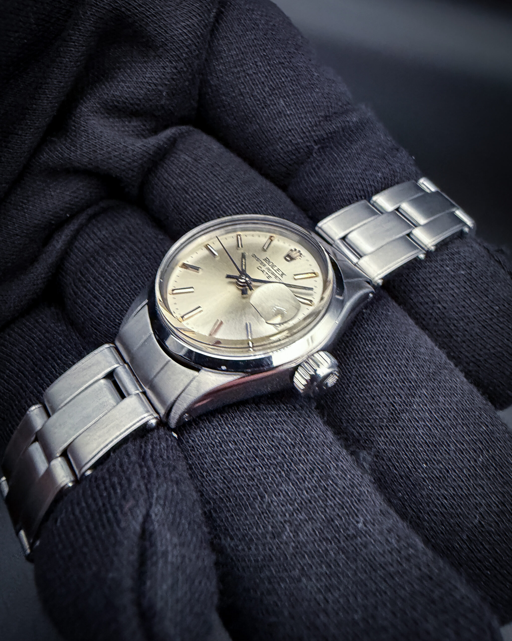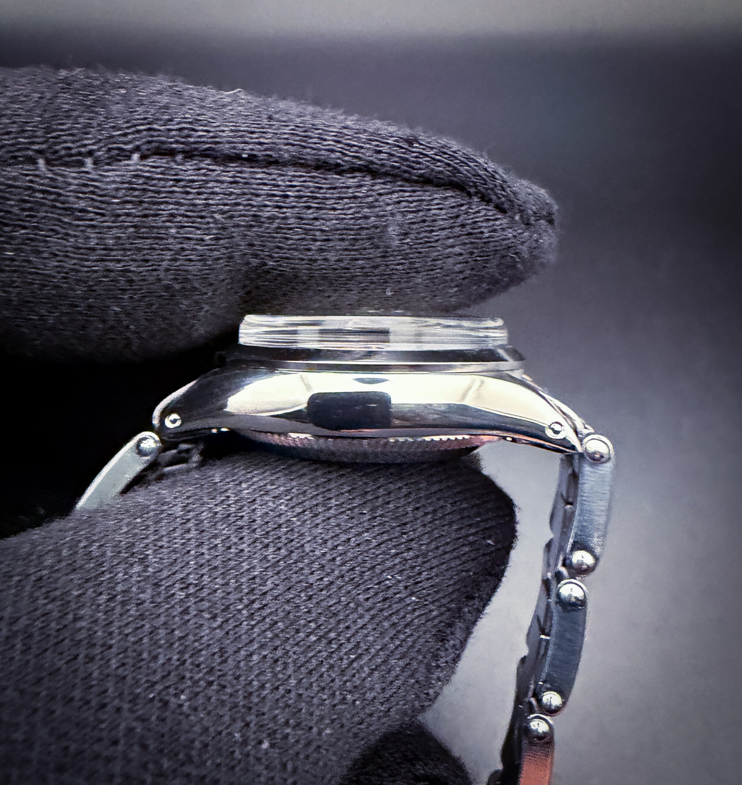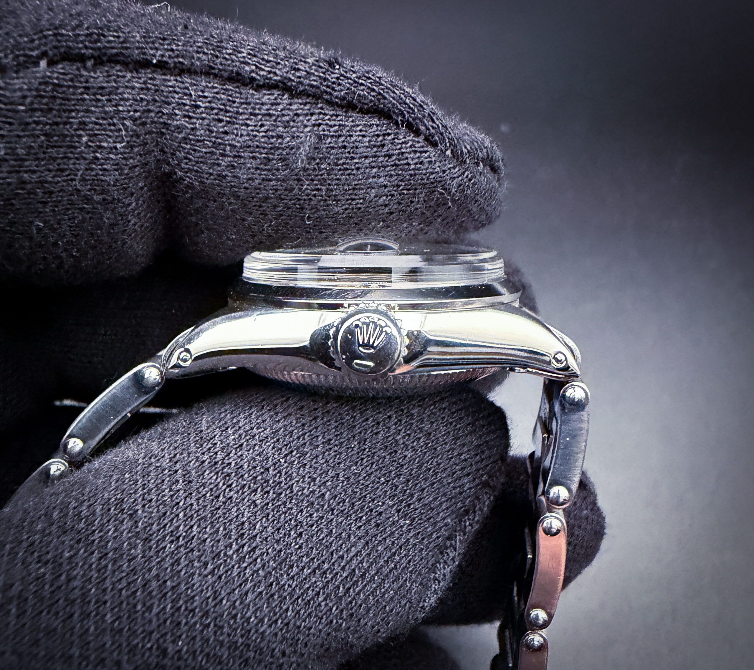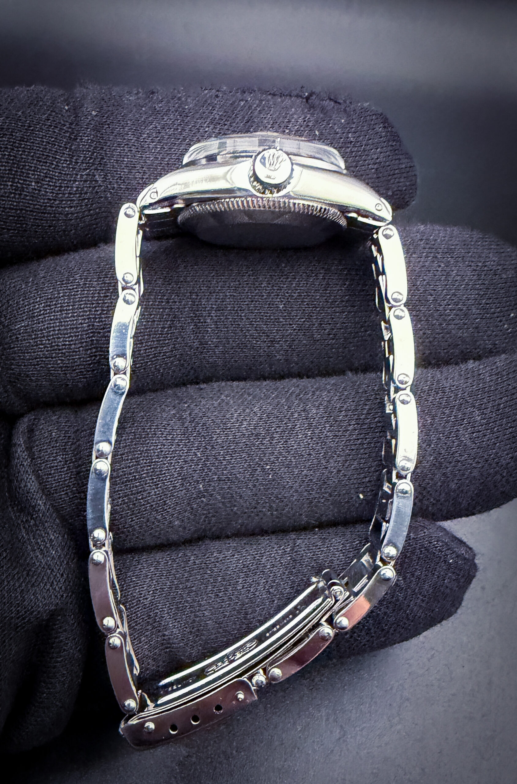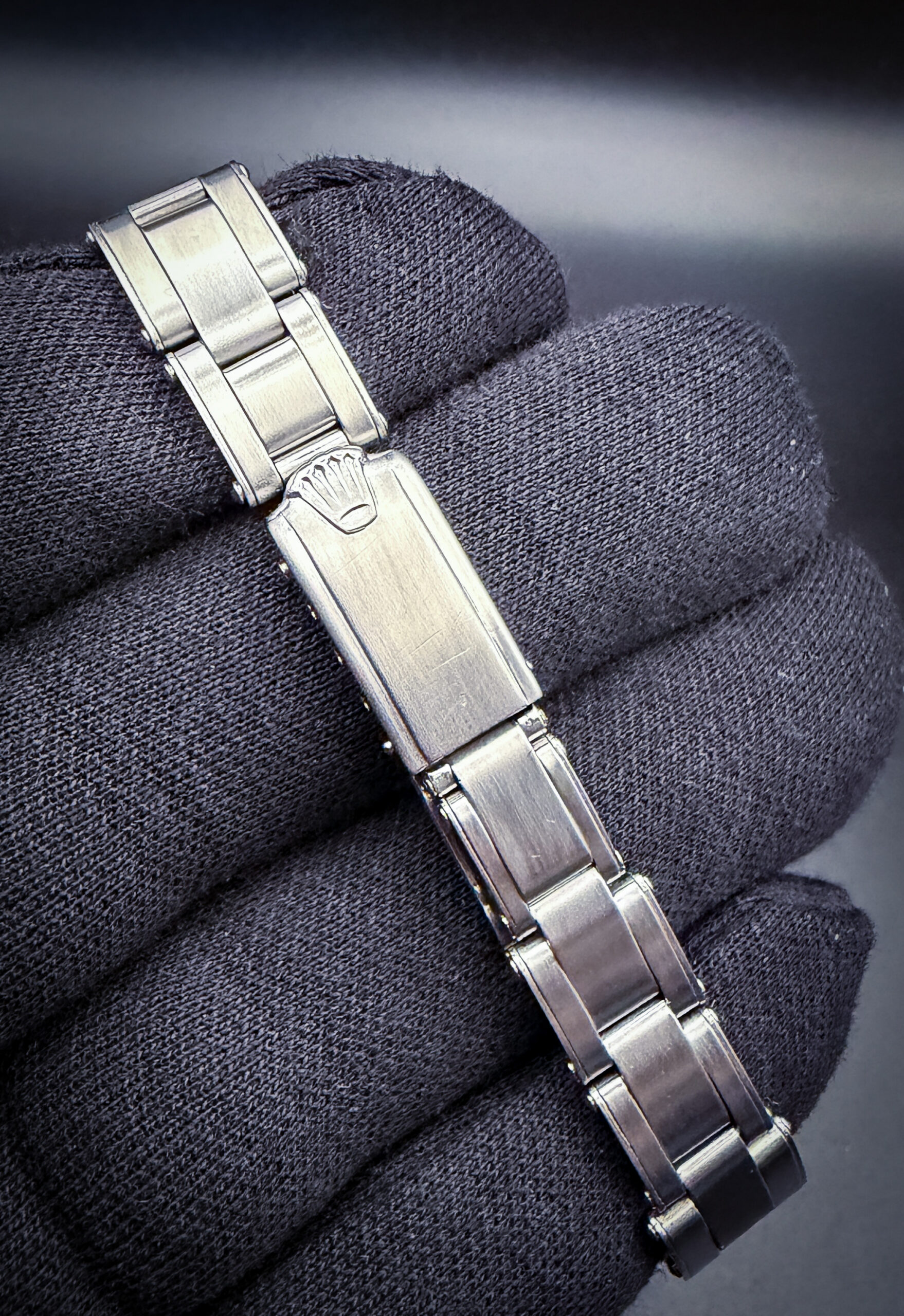 This Rolex is paired with the original stainless steel rivet bracelet, reference 7204 with 66 end links. The bracelet is currently sized to fit approximately a 6.5-inch wrist, with one (1) additional link included in the case for adjustment.