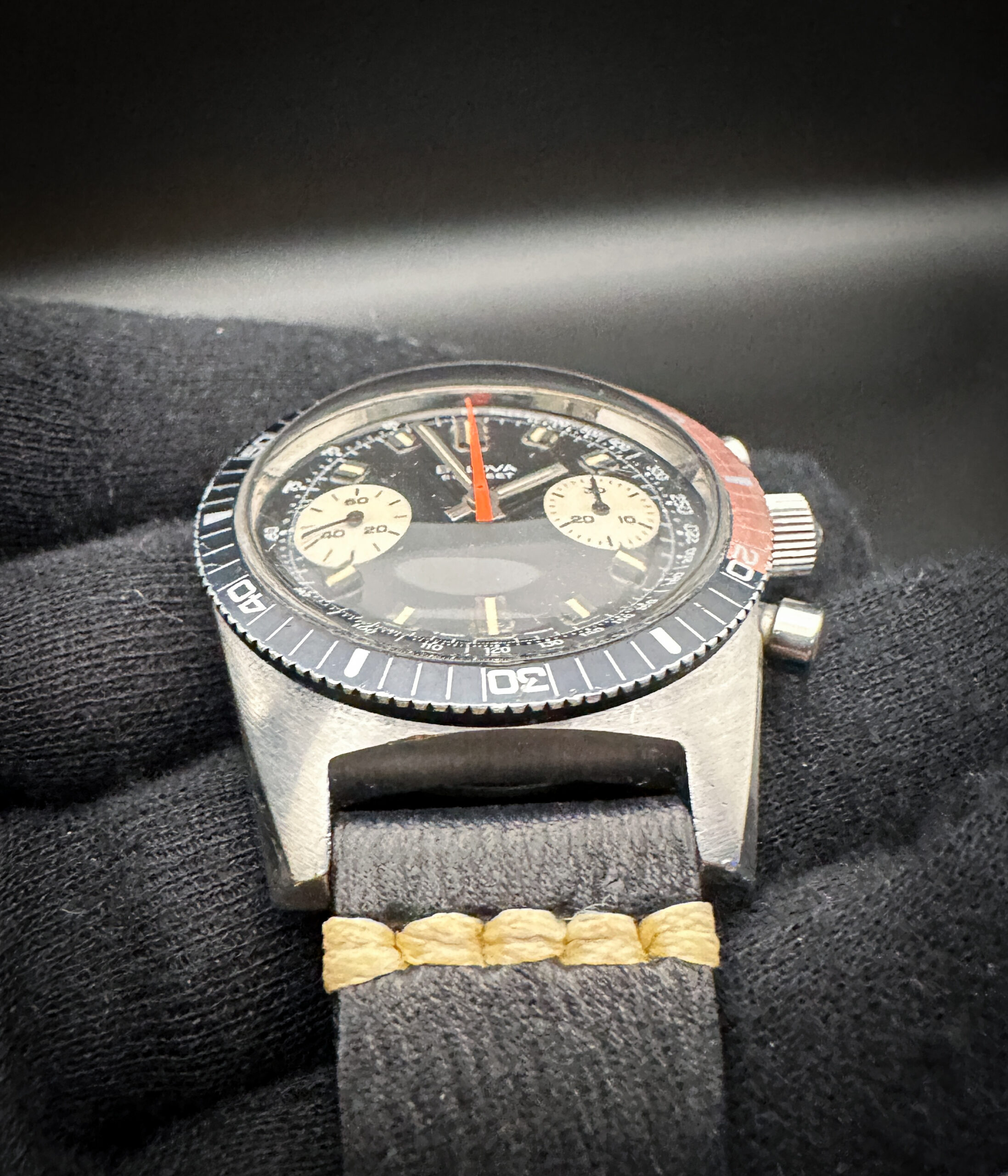 This Devil Diver is paired with a new black leather, hand-stitched strap with stainless steel buckle.