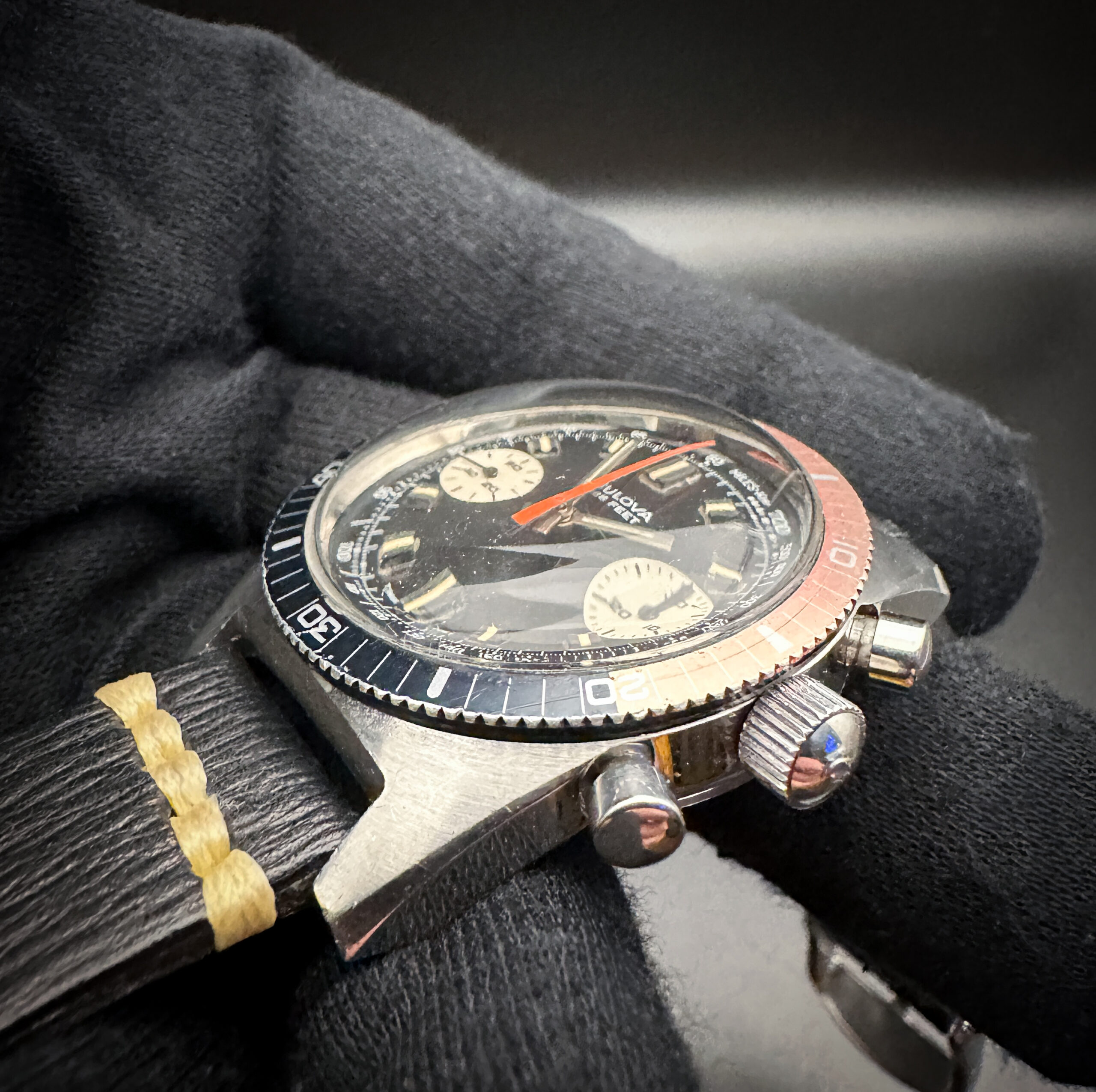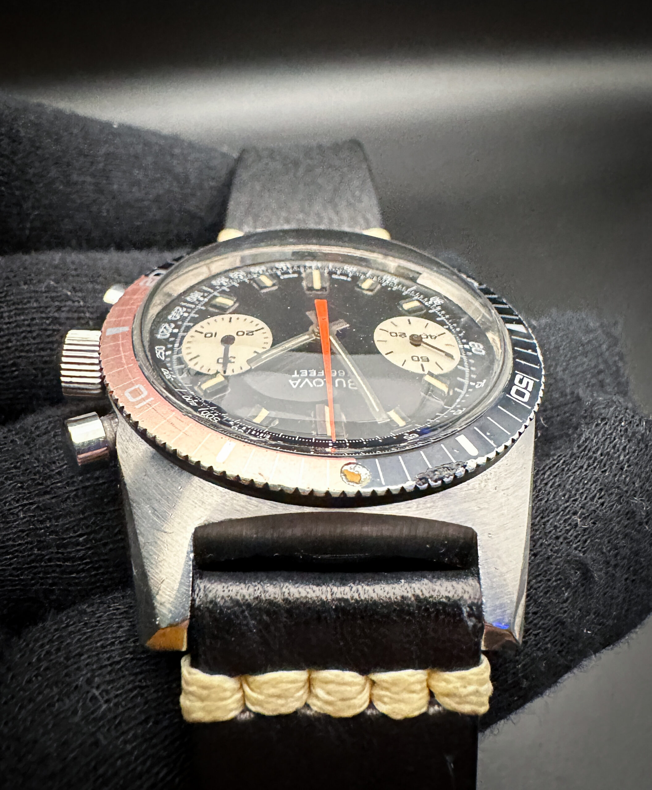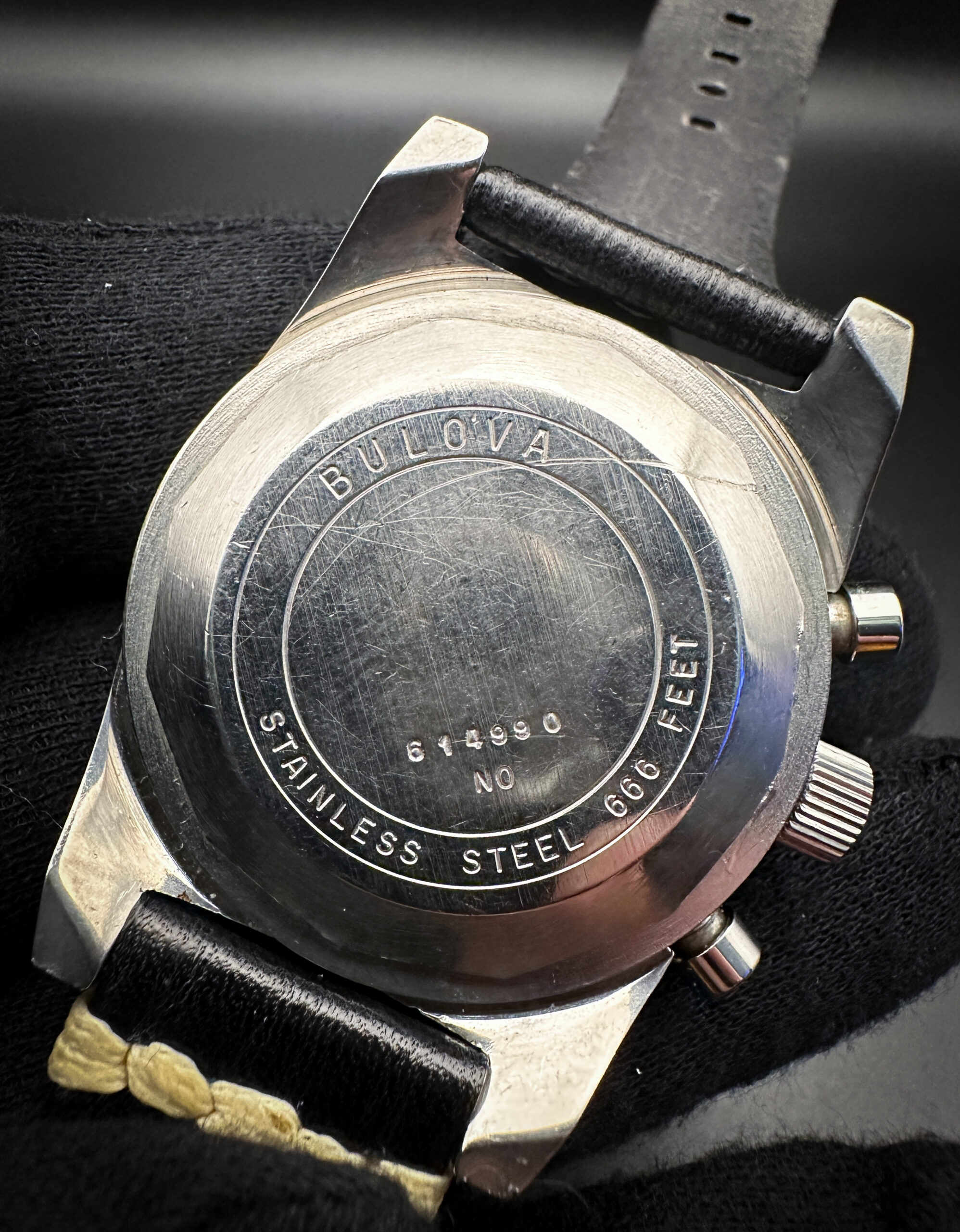 1970 (N0) Bulova “Devil Diver” Deep Sea “B” Chronograph 31003 in a 38mm stainless steel case, powered by the Bulova 14EB (Valjoux 7733) hand-wound movement. This Bulova has been tested in good working order with the chronograph resetting to zero. Please note that it may take two presses of the start/stop/reset buttons to center the hands at zero. Includes a new Wrist Wraith travel case and TLC authentication card.