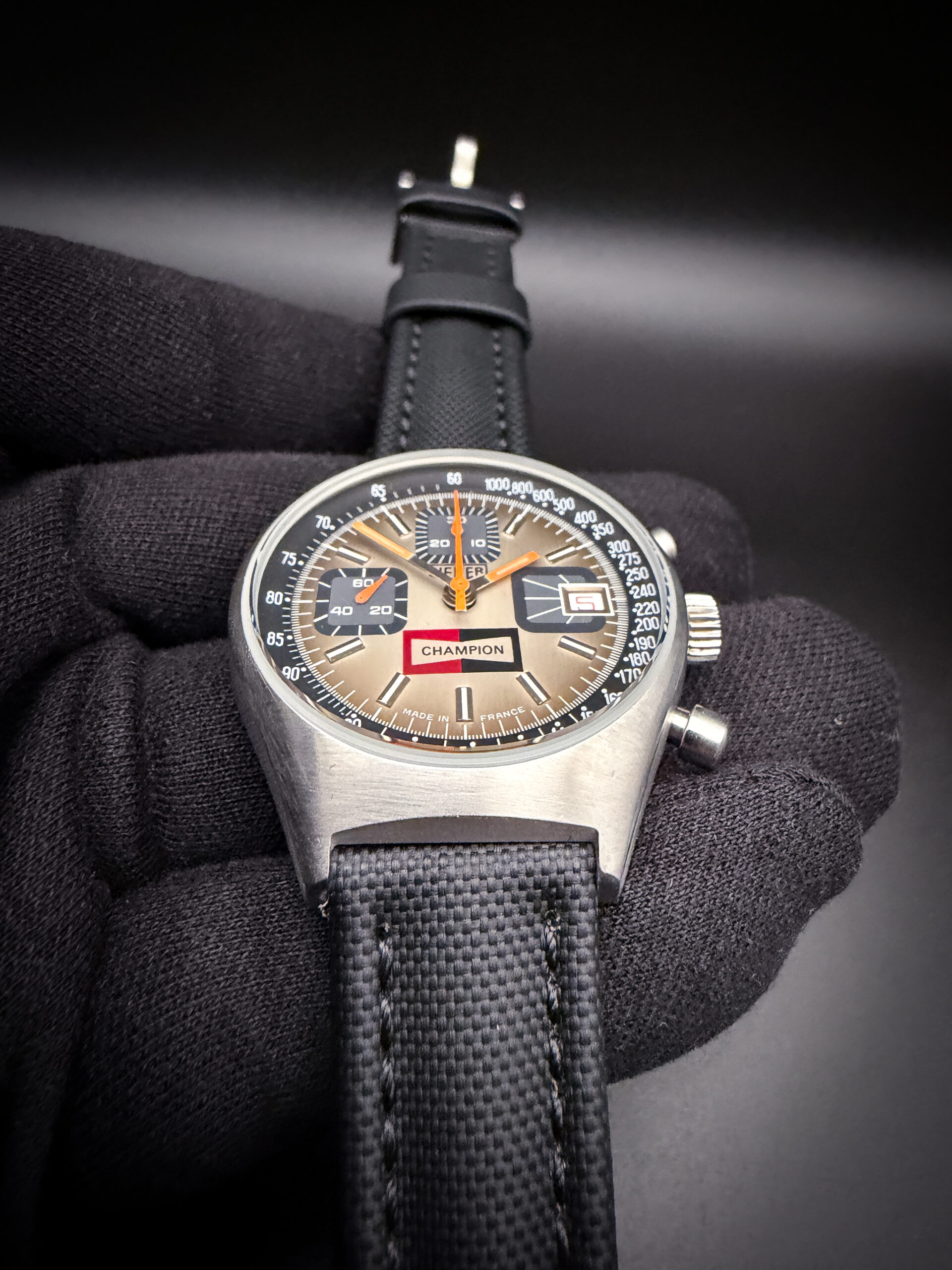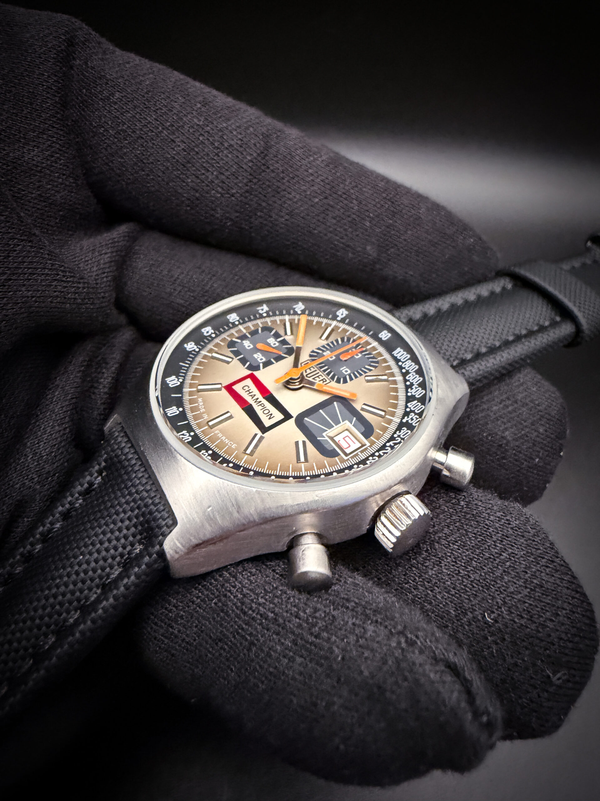 Known as the French Heuer, the case was manufactured by Monnin and cosigned Heuer-Leonidas/ G. Monnin. This particular example has a dual signed dial Heuer / Champion as a very limited quantity were made for Champion spark plugs to be gifted within distribution and sales for high performers. Reference 1614 features a Valjoux 7765 manual winding movement with quick set date. The dial shows Made in France at 6pm.