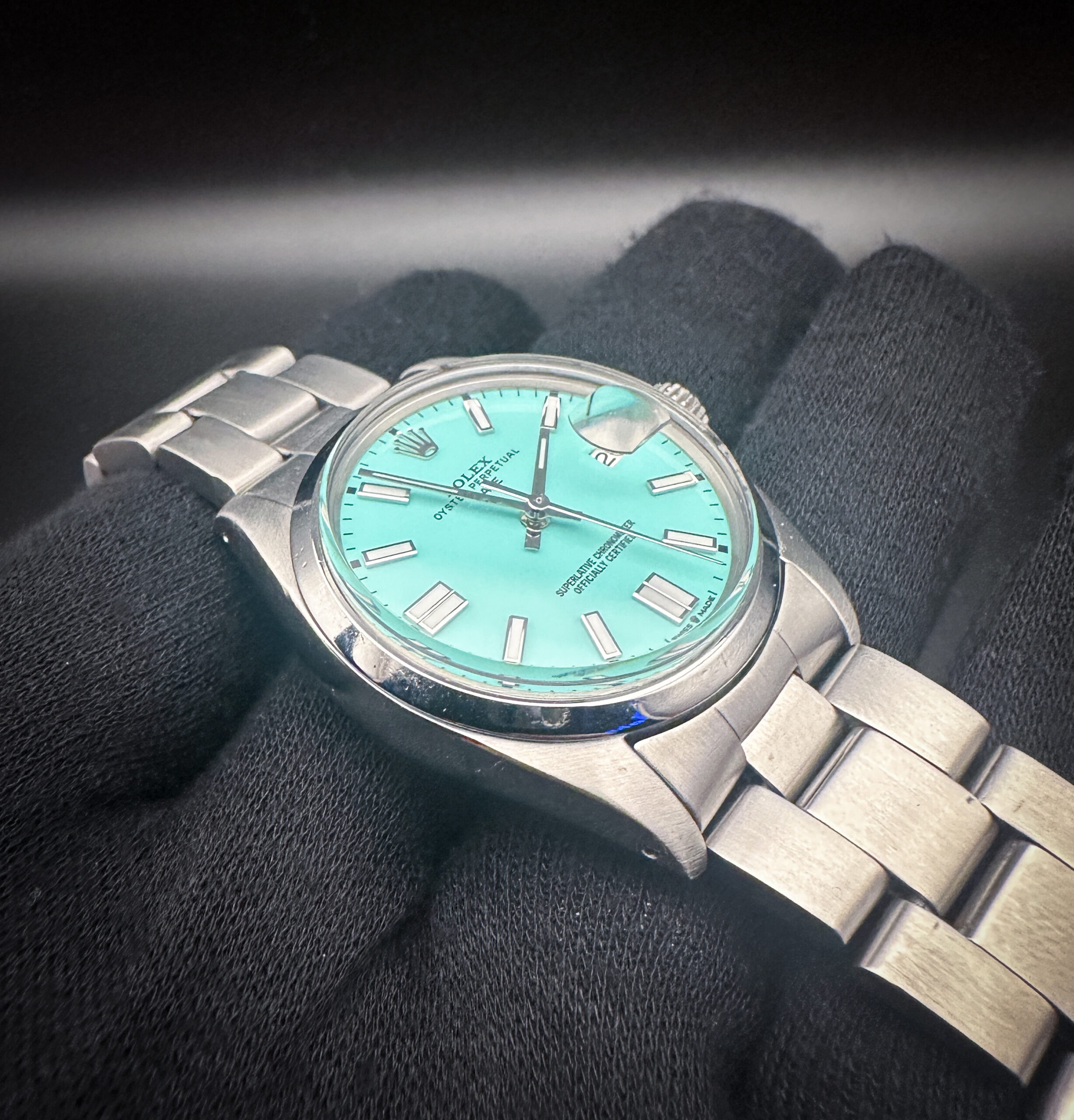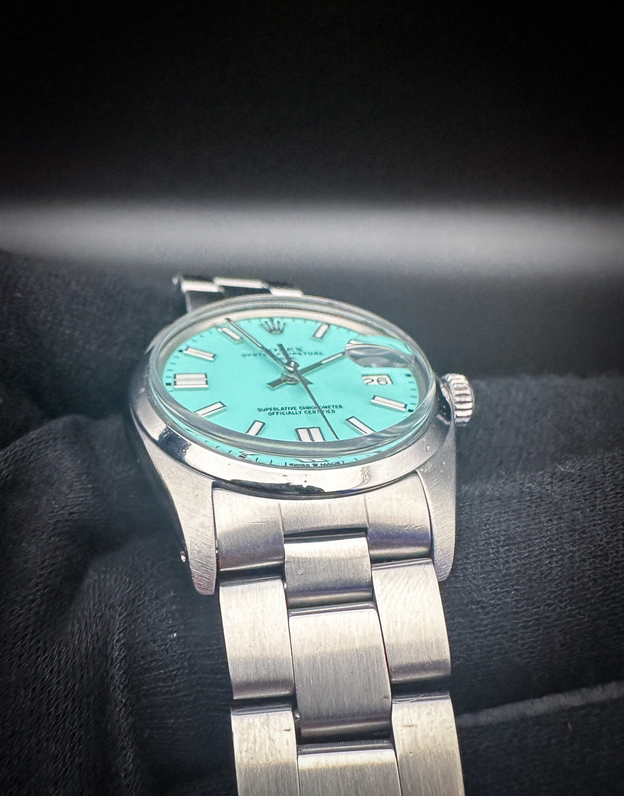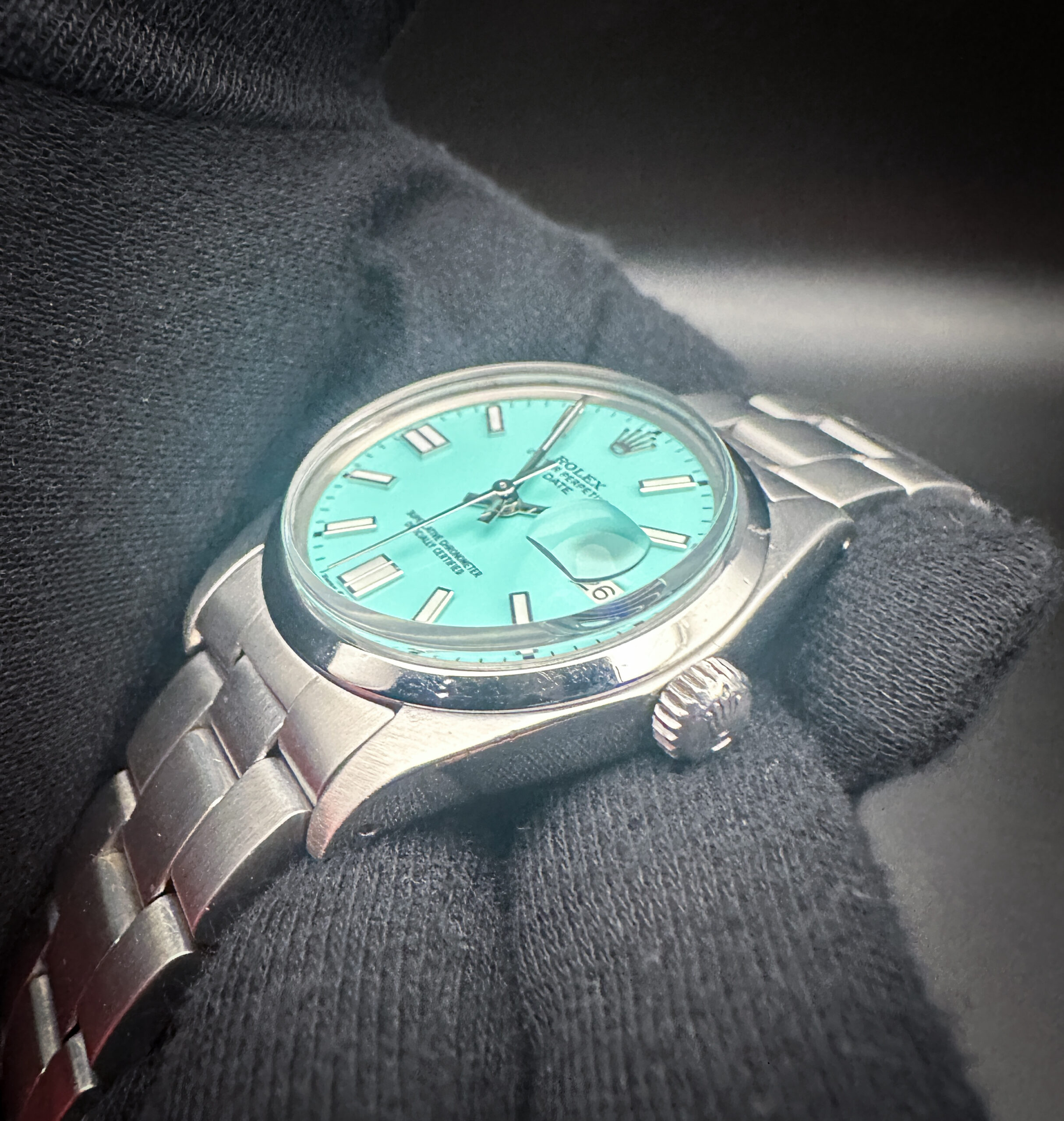 Vintage 1978 Rolex 1500 Oyster Perpetual Date in a 34mm stainless steel case, featuring a custom Tiffany-Blue dial, powered by the Rolex calibre 1570 automatic movement. The caseback interior features four distinct service marks and this Rolex has been tested in good working order. Includes a new Wrist Wraith travel case, as well as the TLC Warranty and Authentication card.