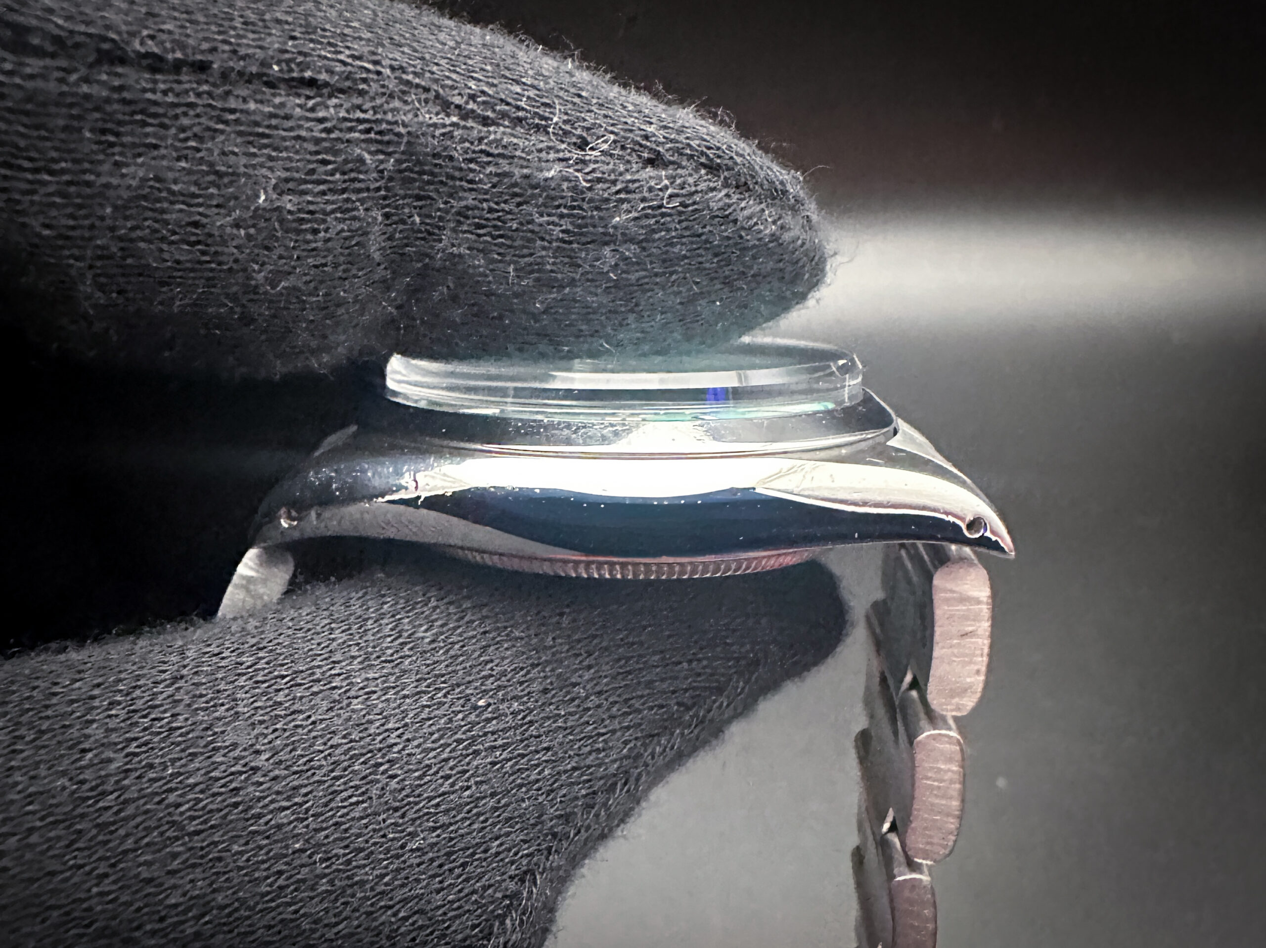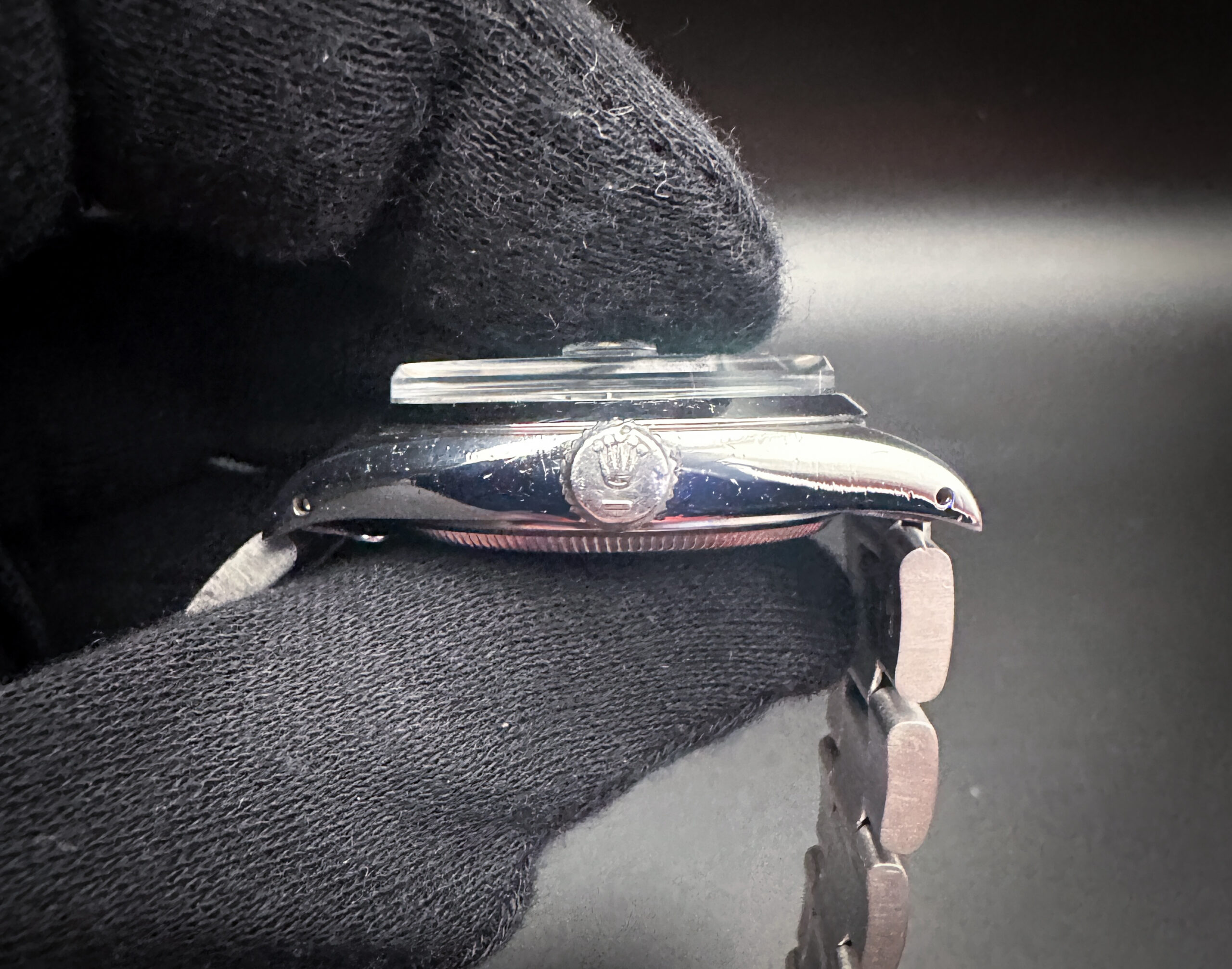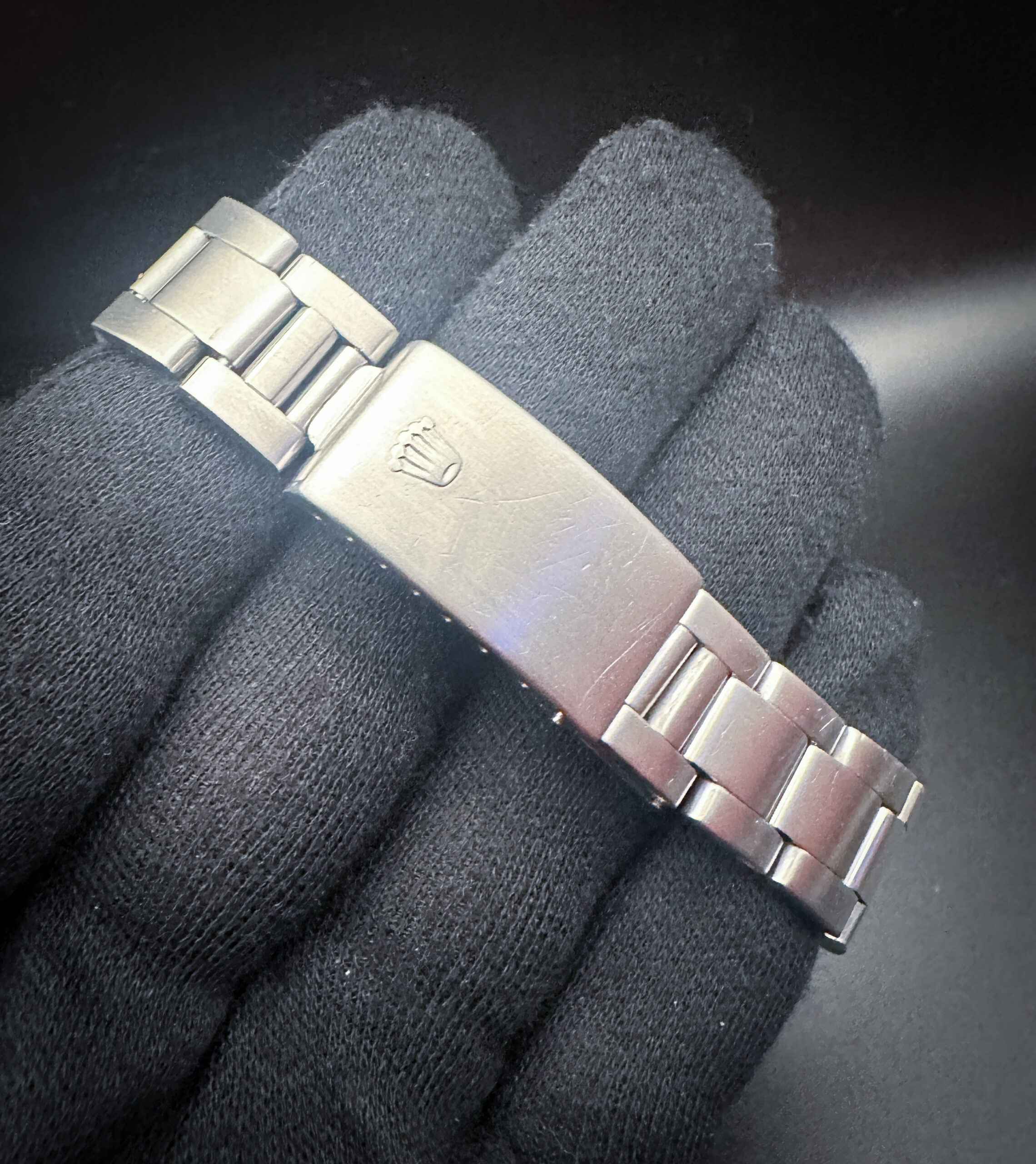 The crystal is clear and free of scratches, mars, or edge-chips. The custom Tiffany-Blue dial is pristine. Overall the case is in fair condition with the directionally brushed uppers and lowers and bright sides. The case and bracelet show light lines and marks consistent with age.