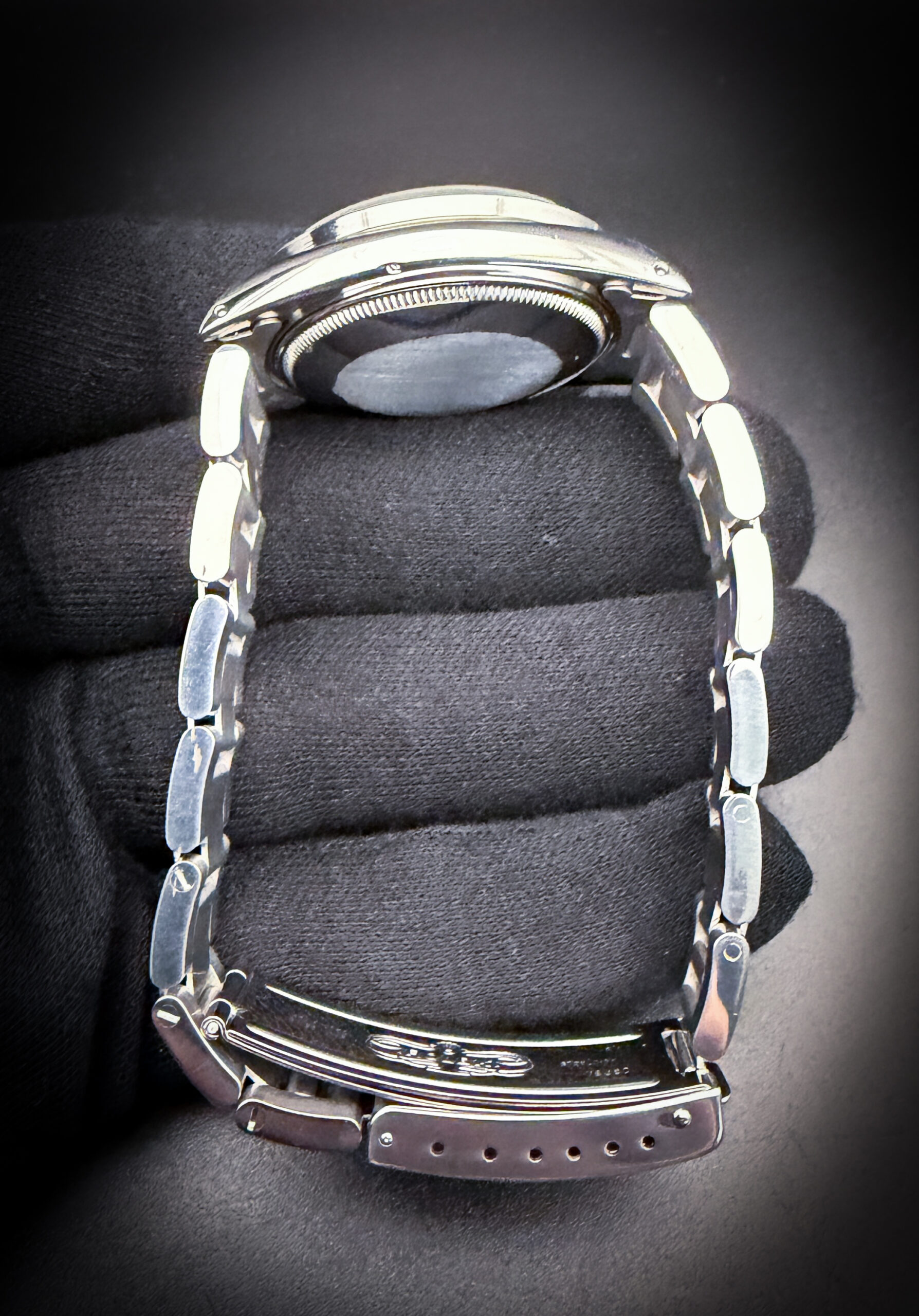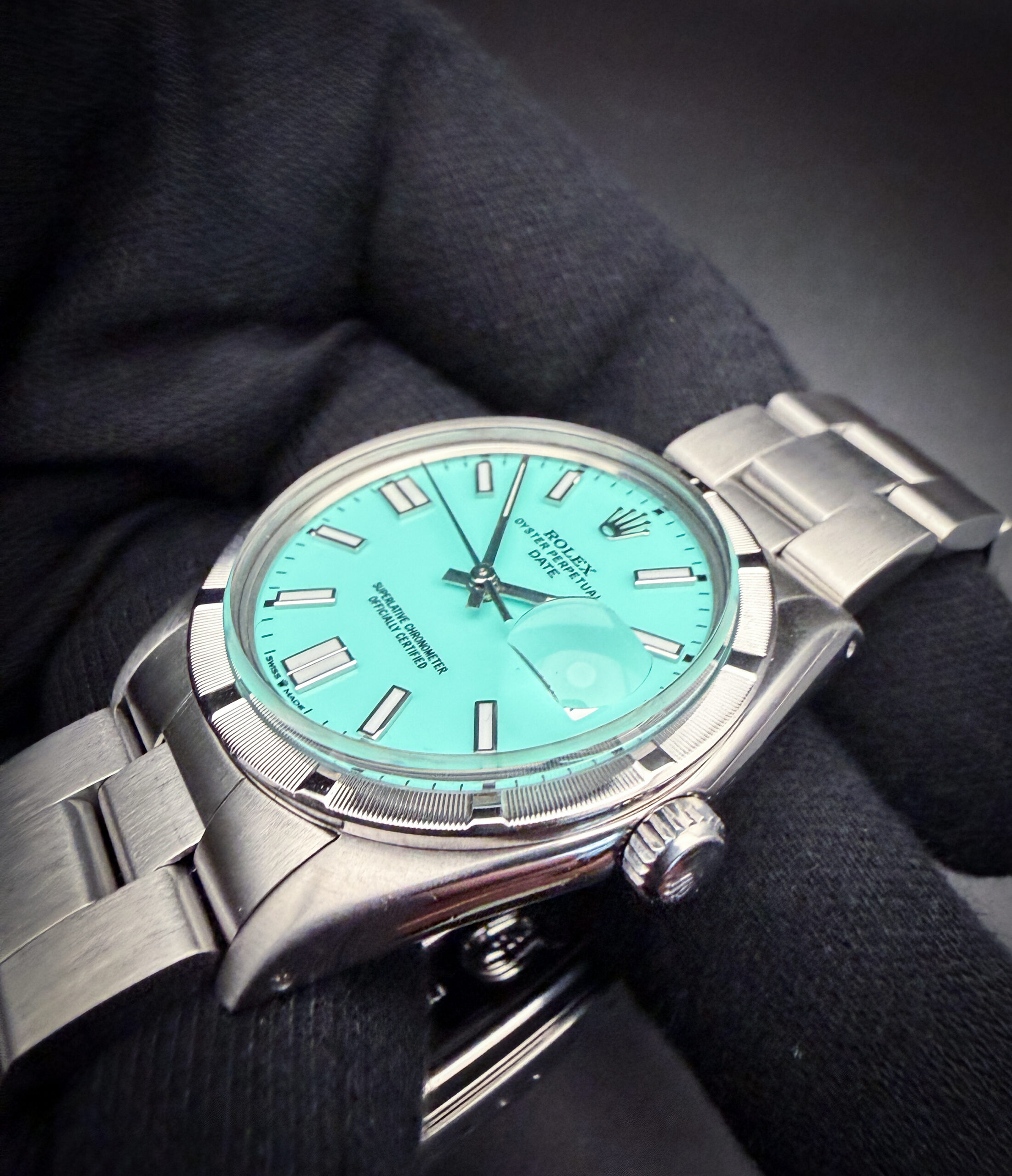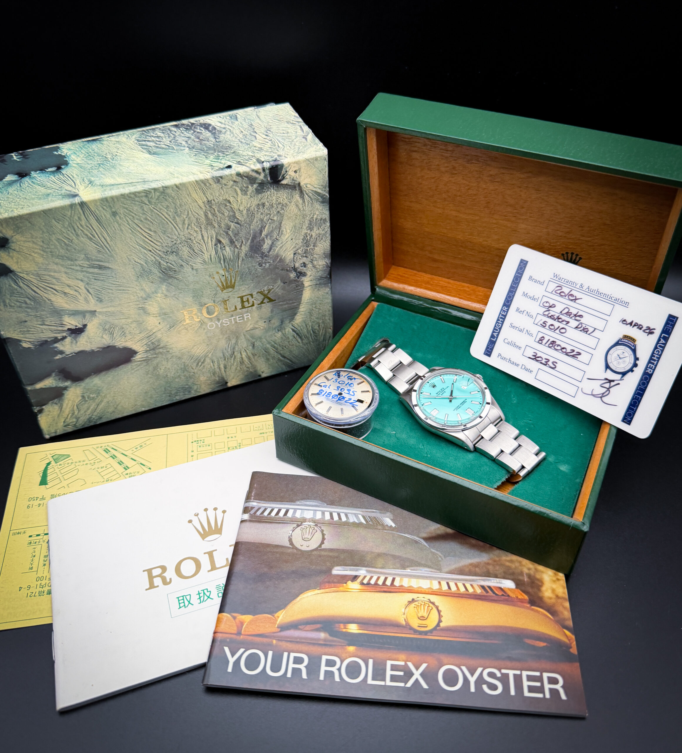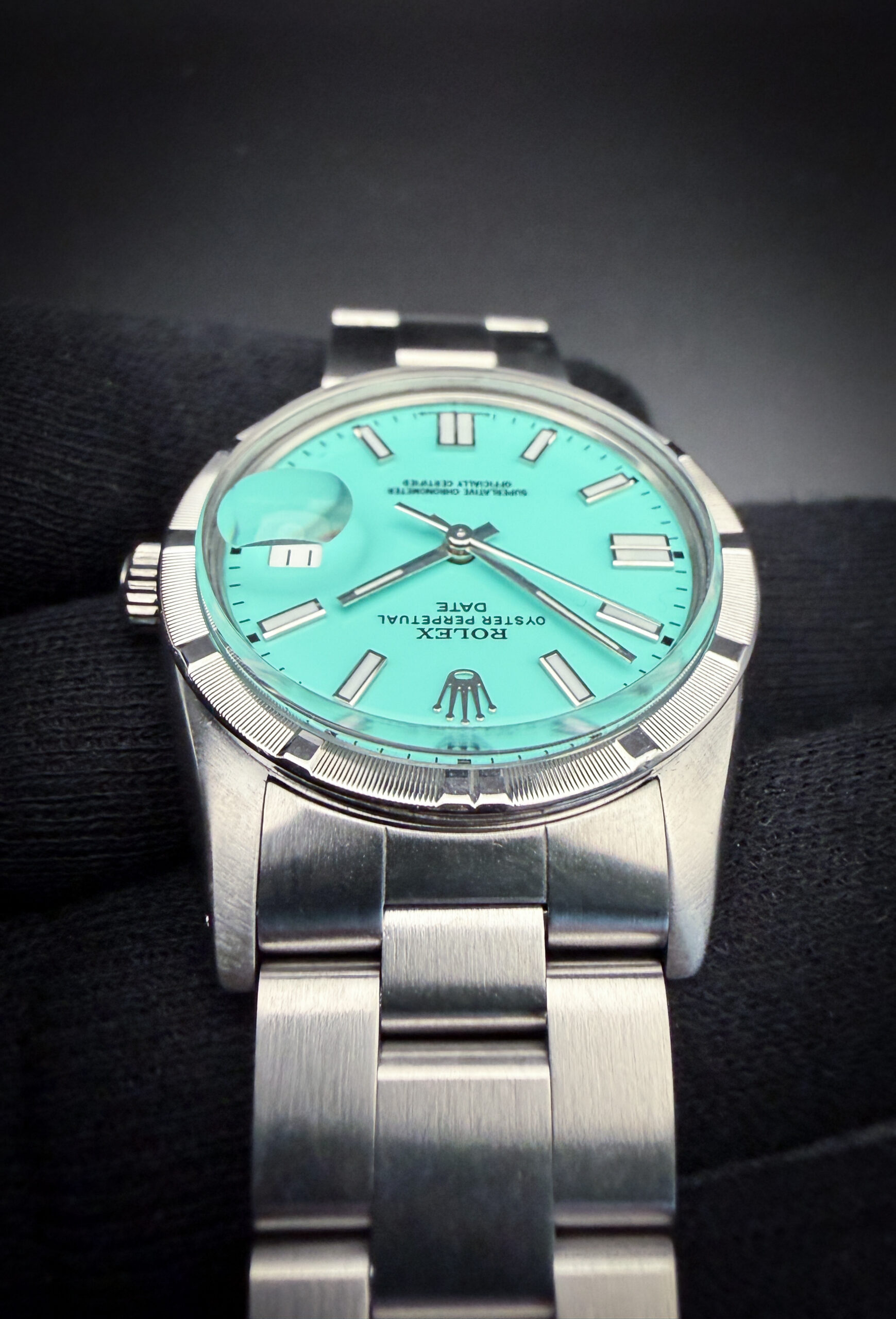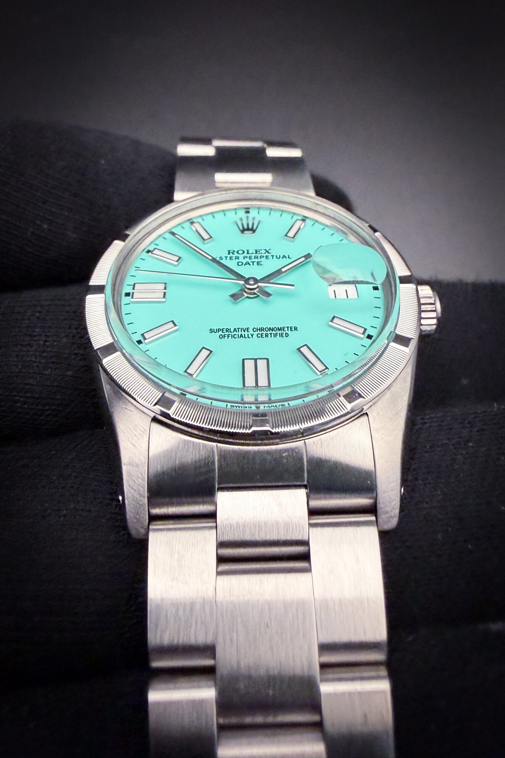 1984 Rolex Oyster Perpetual Date 15010 in a 34mm stainless steel case, powered by the Rolex 3035 automatic movement. This watch is paired with a new customized Tiffany-Blue dial. Includes the original outer box, inner case, Oyster Booklet, Instruction booklet, TLC Warranty/Authentication card, as well as the original Rolex silver stick dial.