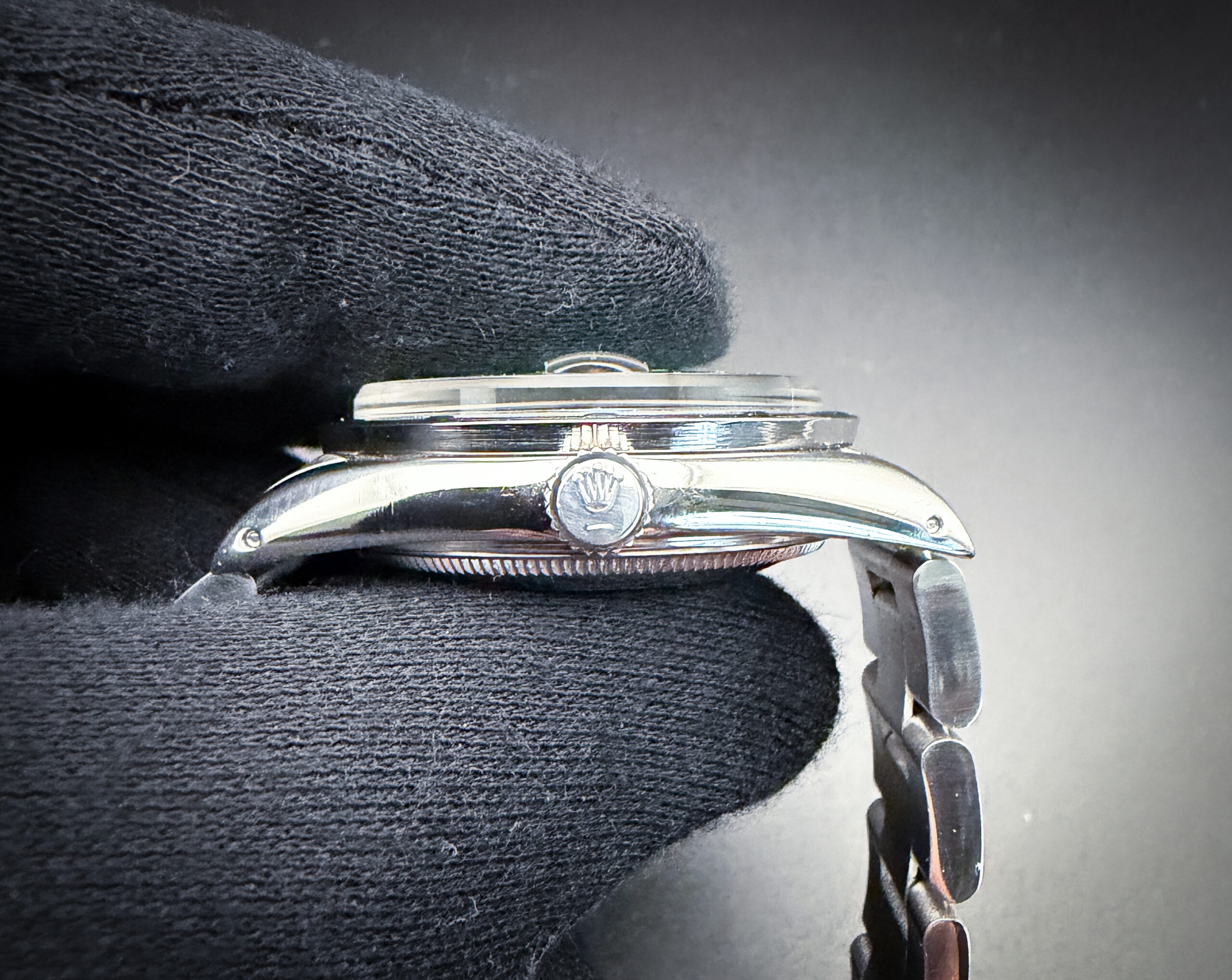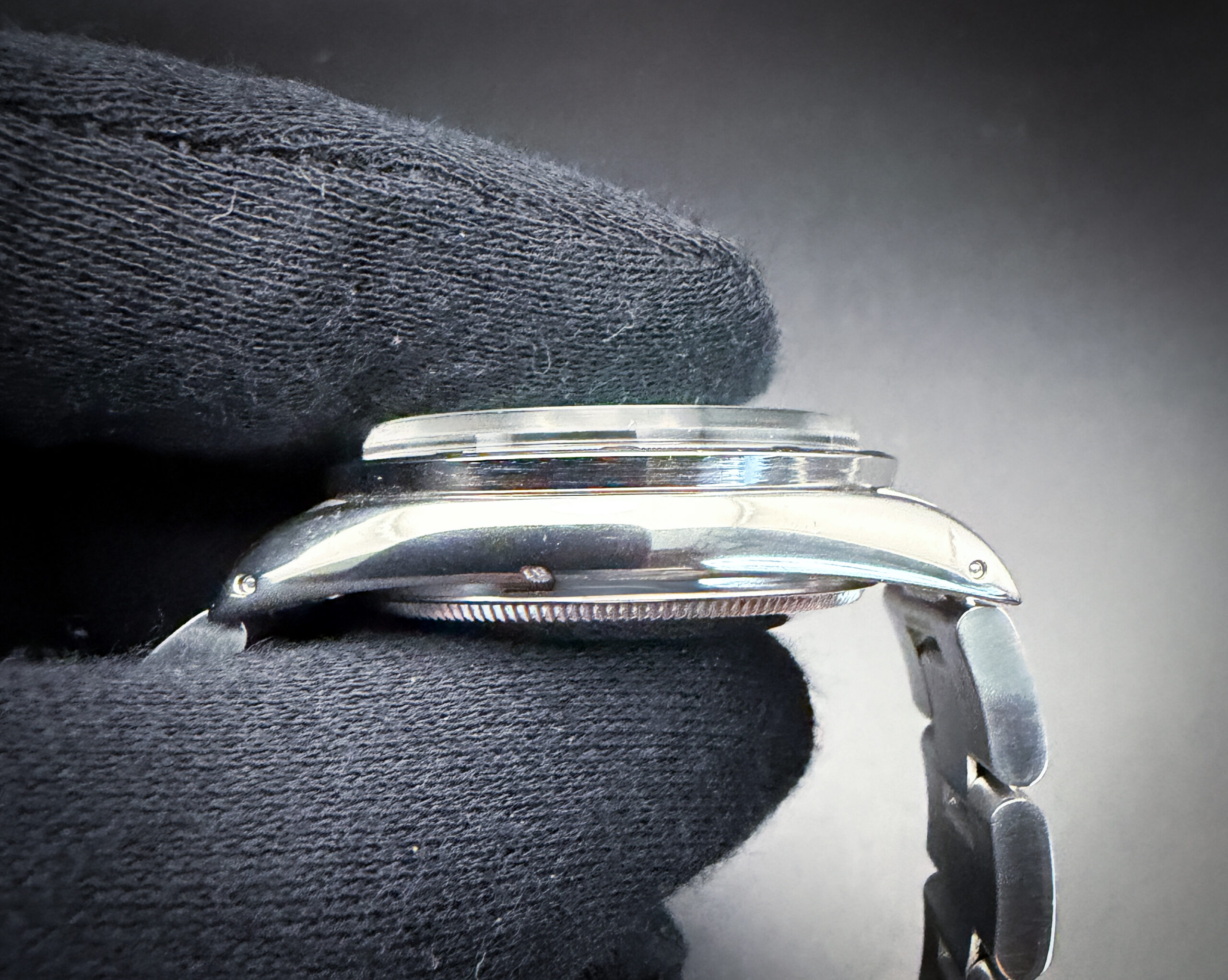 The crystal is clear and free of scratches or mars. The new dial is pristine with bright colors and crisp-white markets. Overall the case is in good condition with light lines consistent with age. There is a small mark on the bottom edge of the case at the 9 o’clock position (see photos).