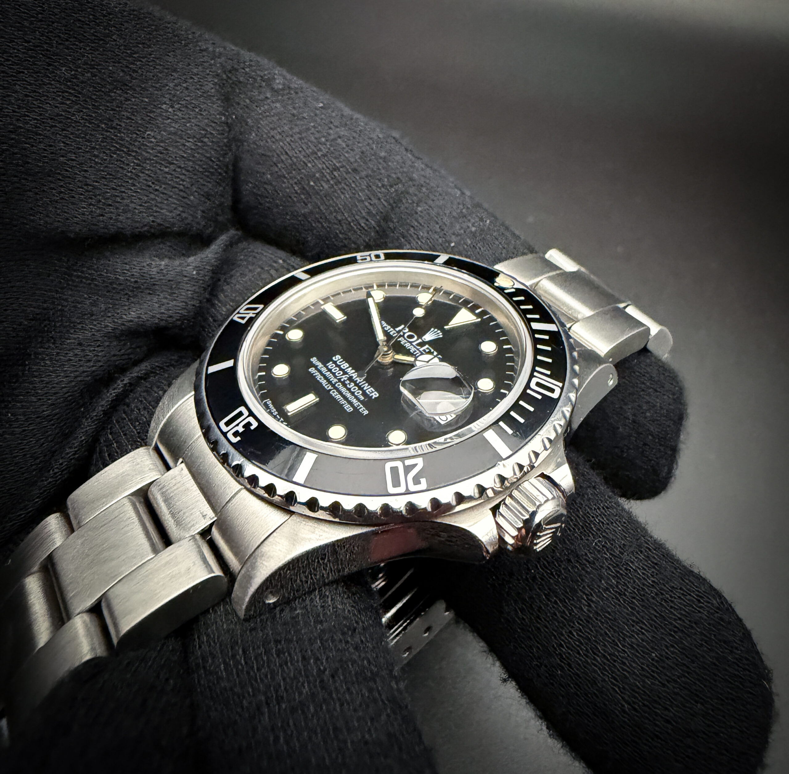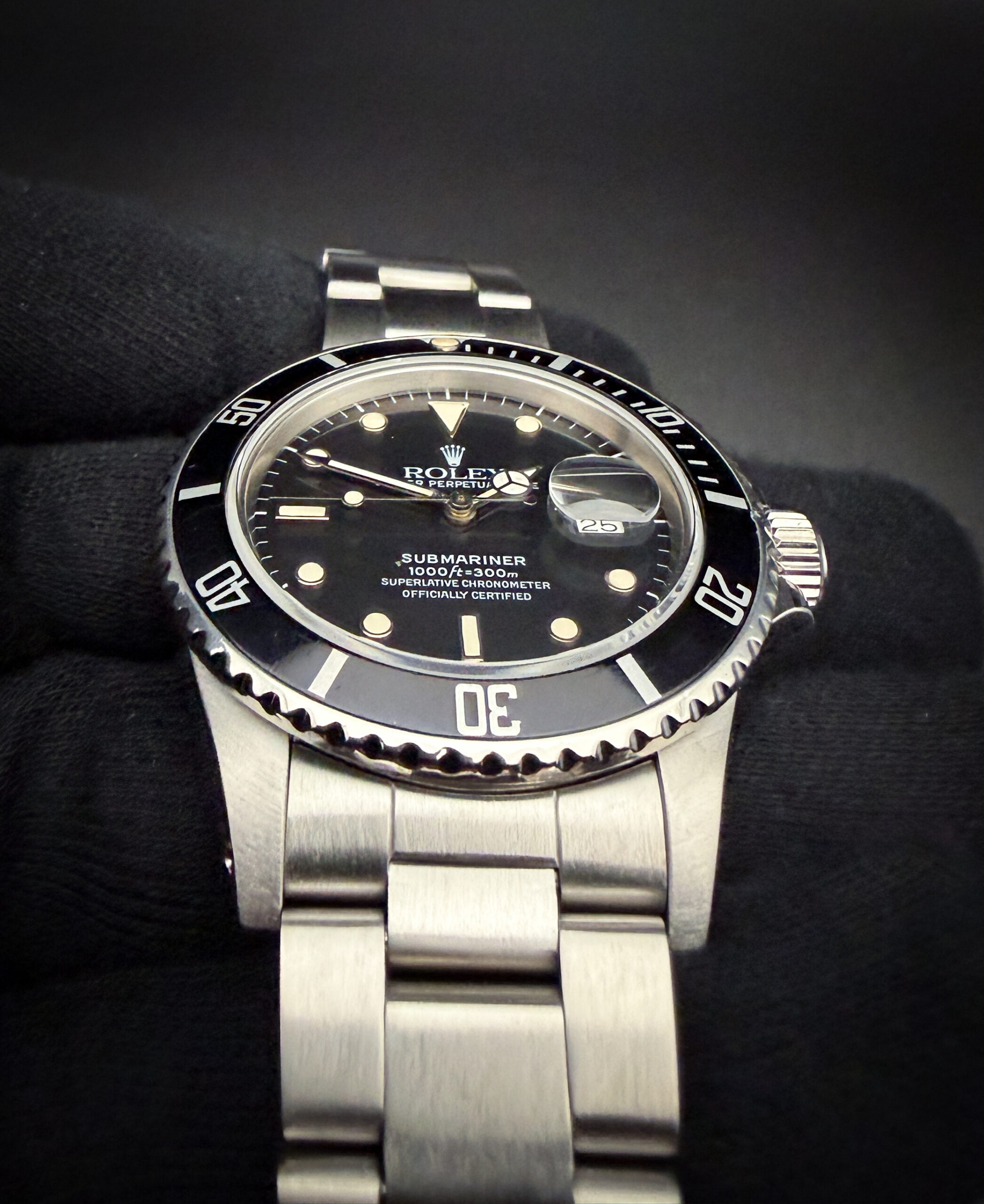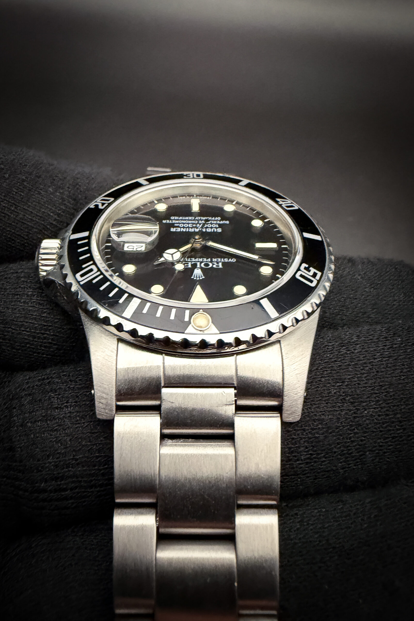 1986 Rolex Submariner Date 16800 featuring a beautiful “Feet-First” tropical dial, in a 40mm stainless steel case, powered by the Rolex 3035 automatic movement. This Submariner has been texted in excellent working order and is ready for daily wear or to be added to a collection.