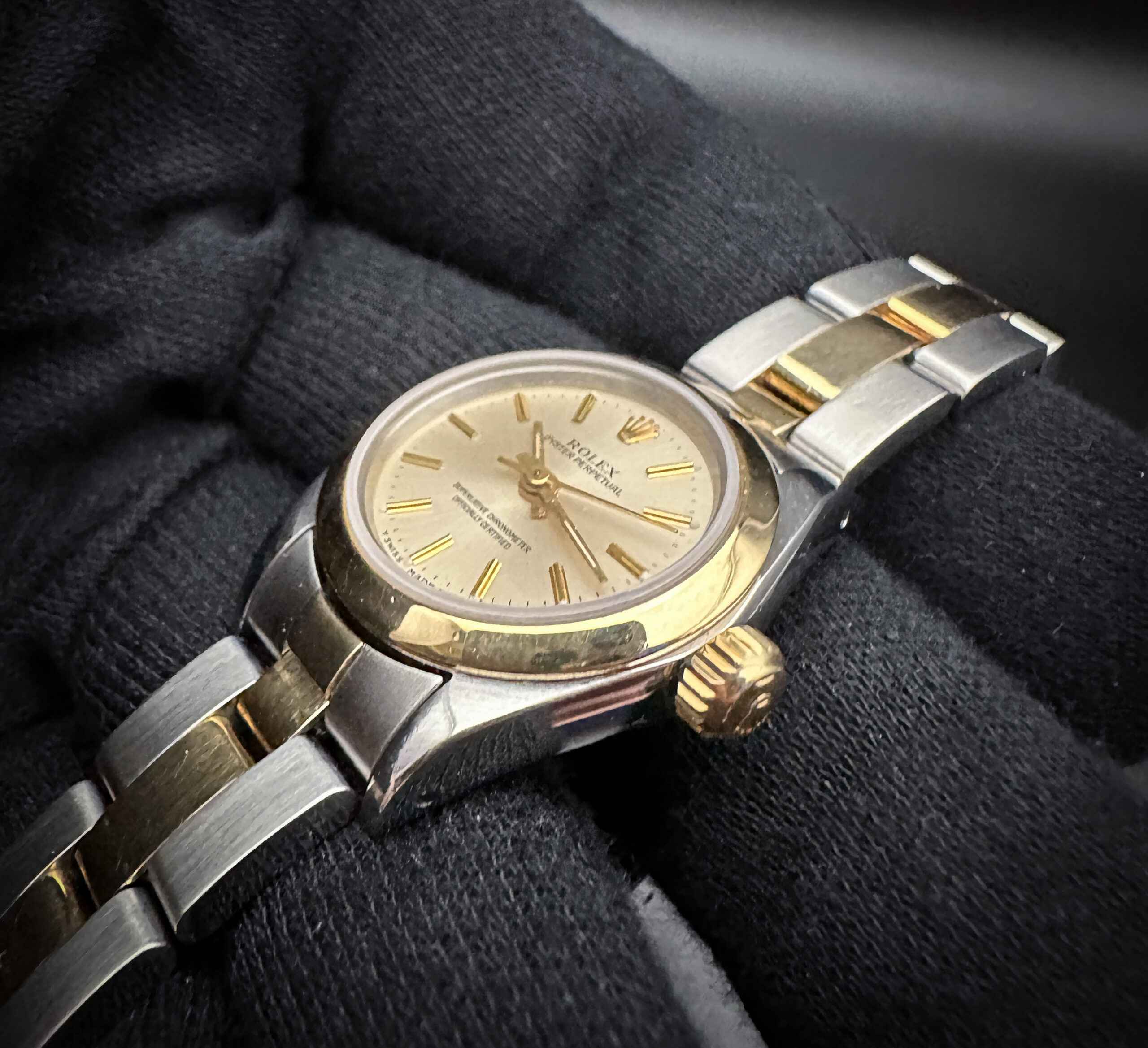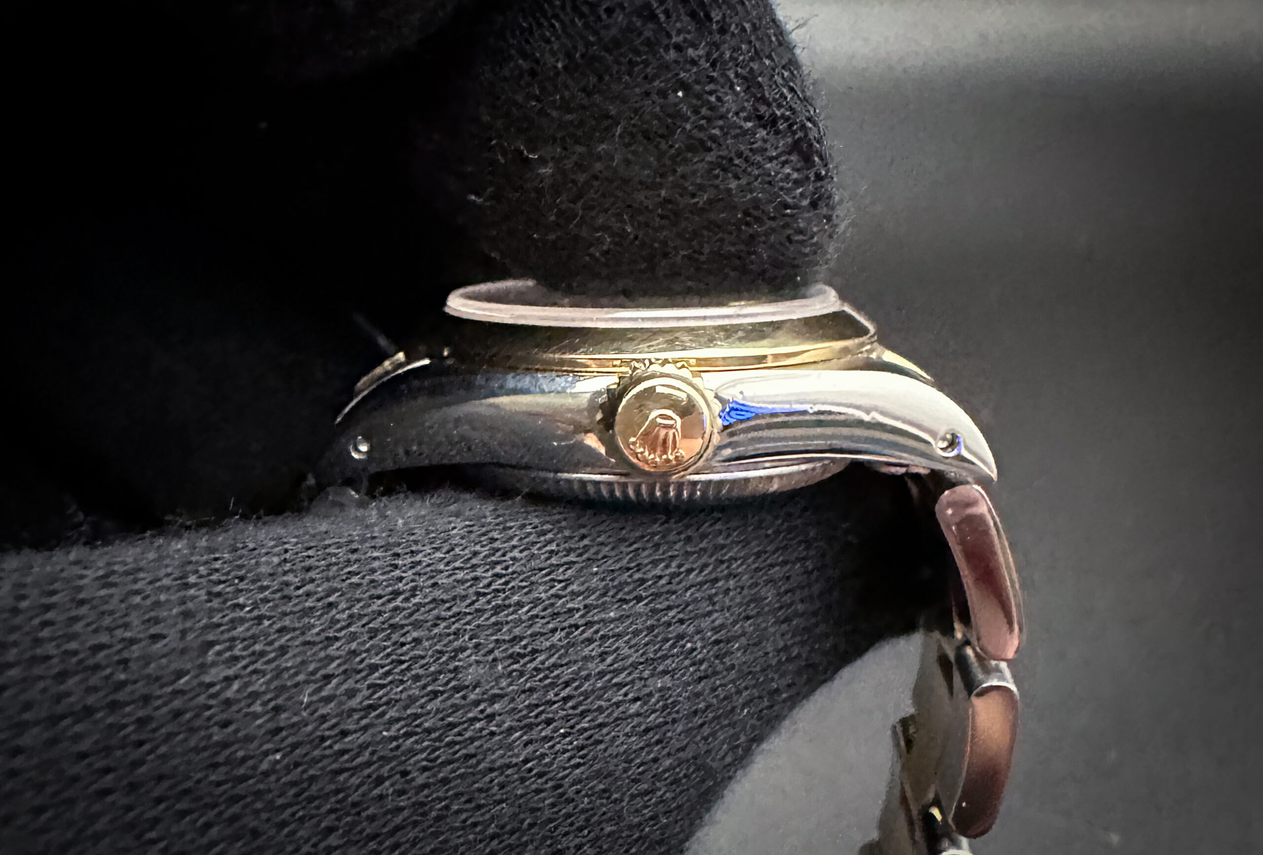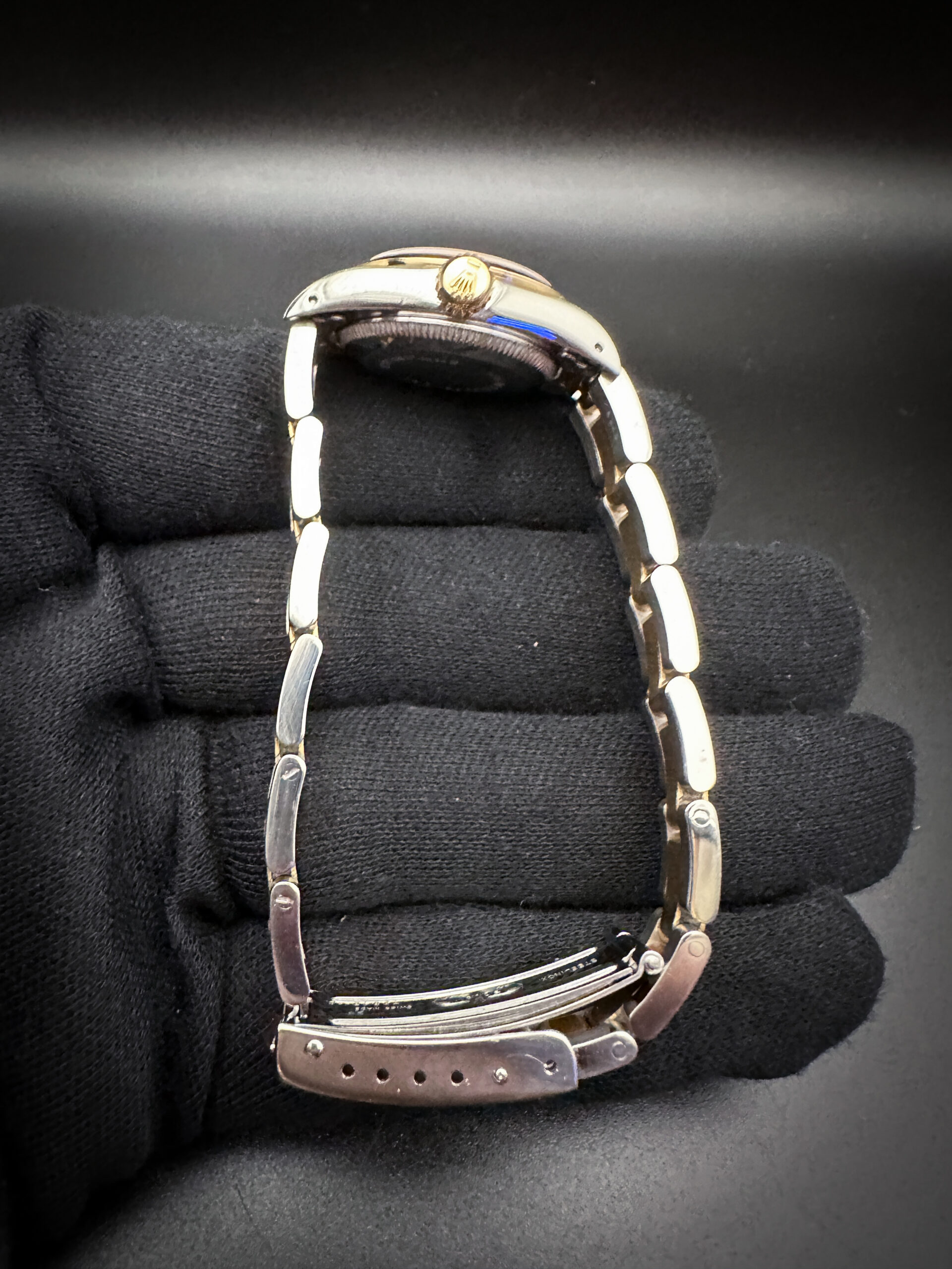 1990 Rolex Oyster Perpetual 67183 in a 26mm yellow gold and stainless steel case, powered by the Rolex 2130 automatic movement. This Rolex has been tested in excellent working order and is ready for wear. Includes a new black travel case, and TLC warranty/authentication card.