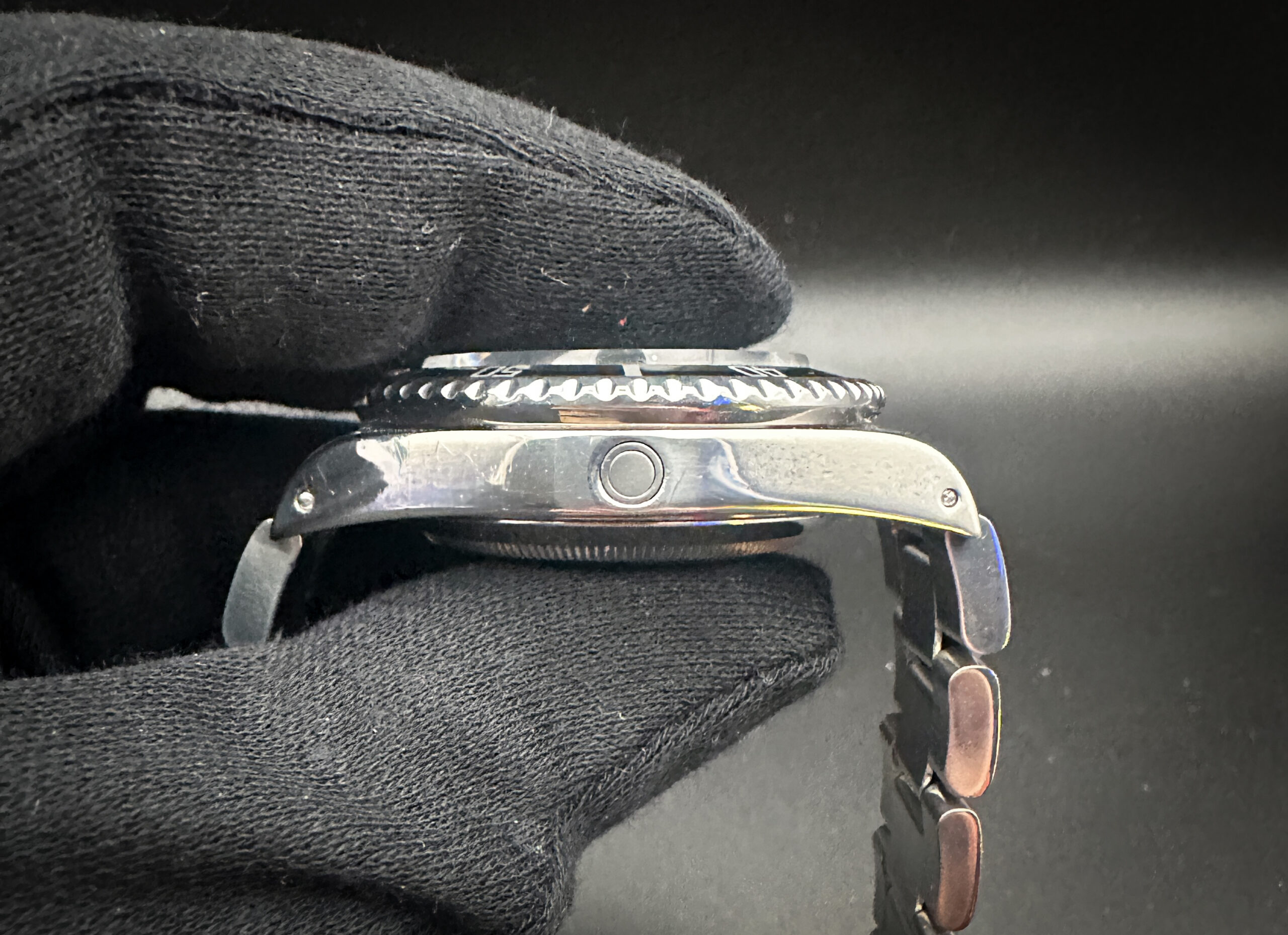 The sapphire crystal is clear and free of scratches or edge-chips. The original dial and hands are beautiful, with no stains or discoloration. The original bezel insert shows a light period-correct patina to the pearl pip, with a few faint marks, but no significant damage or scratches. Overall the case is in good condition, with light spider-lines consistent with age and careful use.