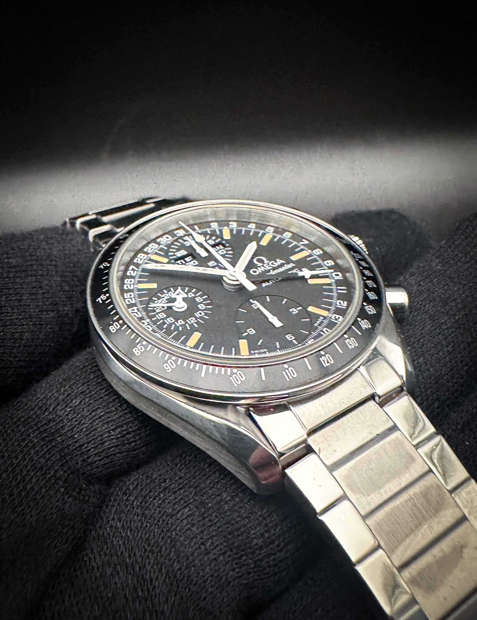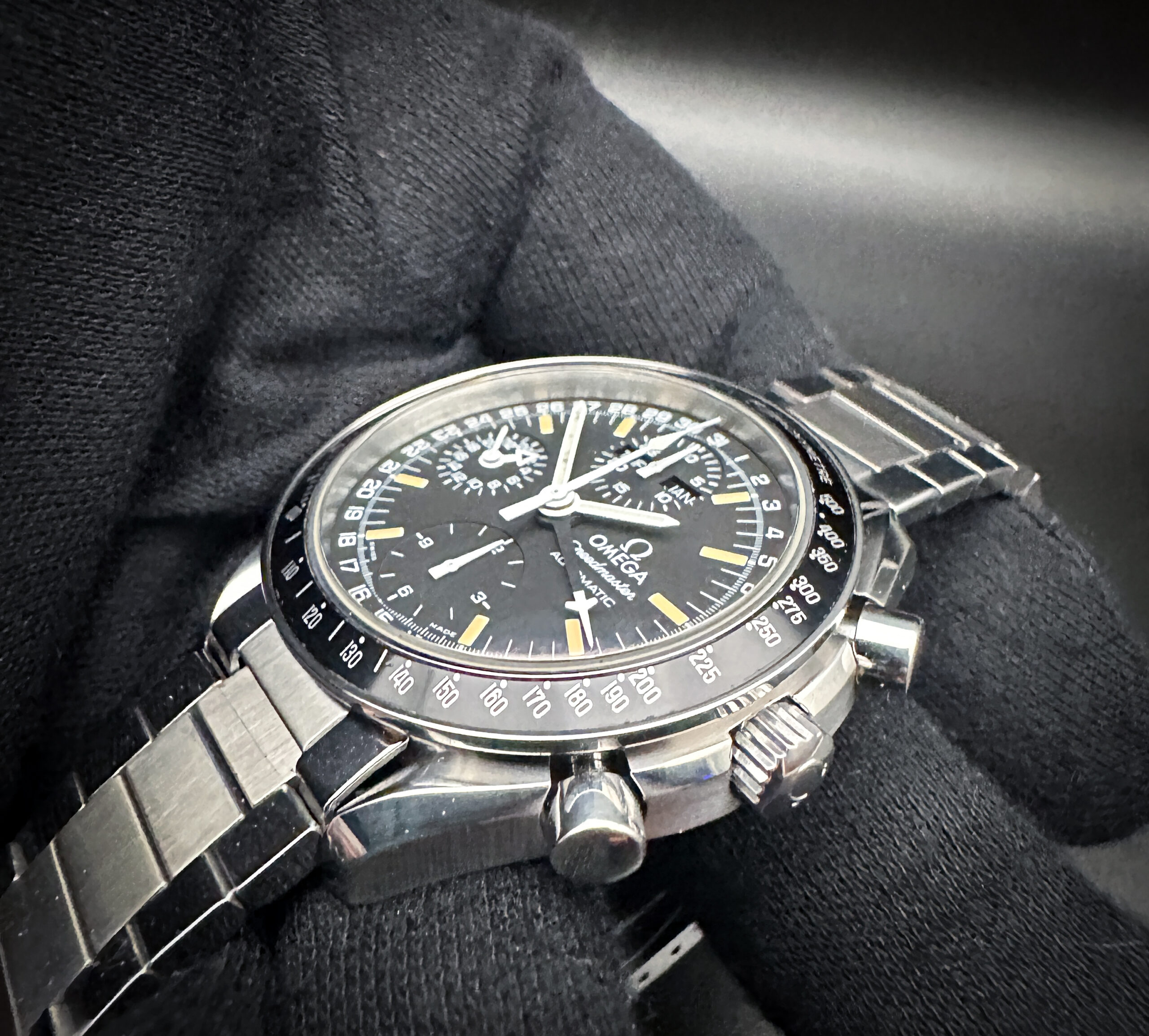 1995 c. Omega Speedmaster Day-Date Triple Calendar 3820.50.21 in a 39mm stainless steel case, featuring the Omega caliber 1151 automatic movement. This Speedmaster has been tested in excellent working order and is ready for wear or to be added to a collection. Includes the original Omega: outer box; inner case; leatherette wallet; service centres booklet; instruction book; hang tag (matching serial); and warranty card.