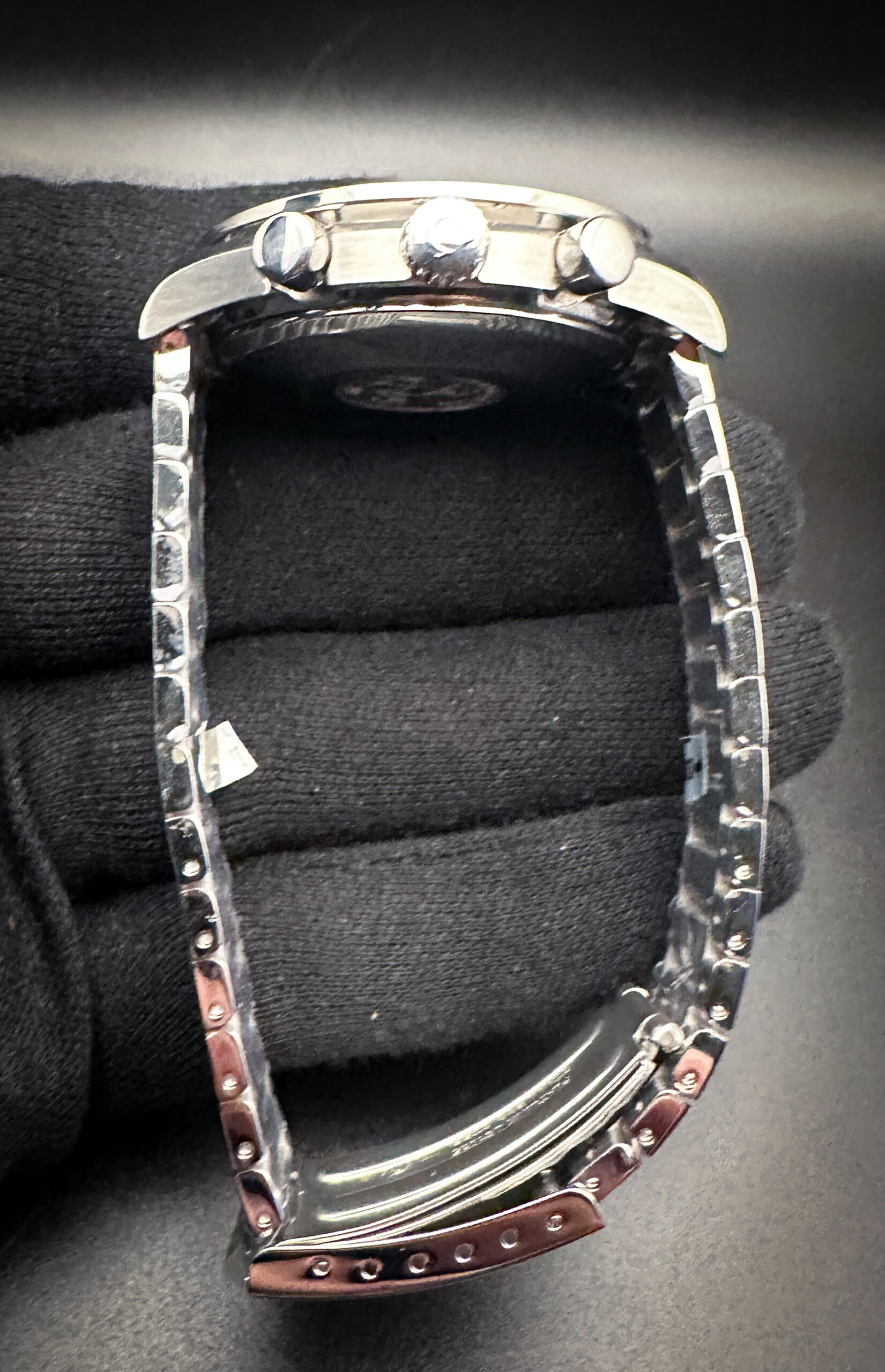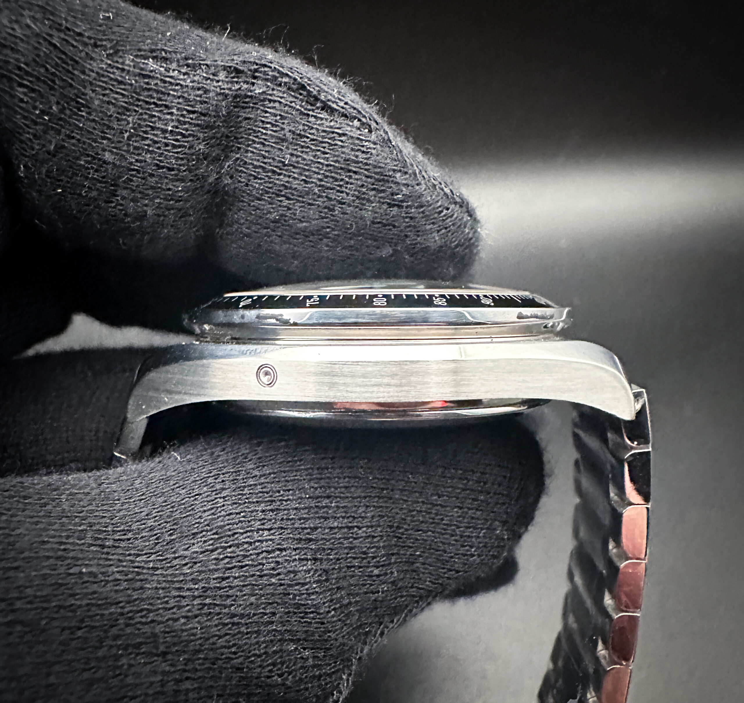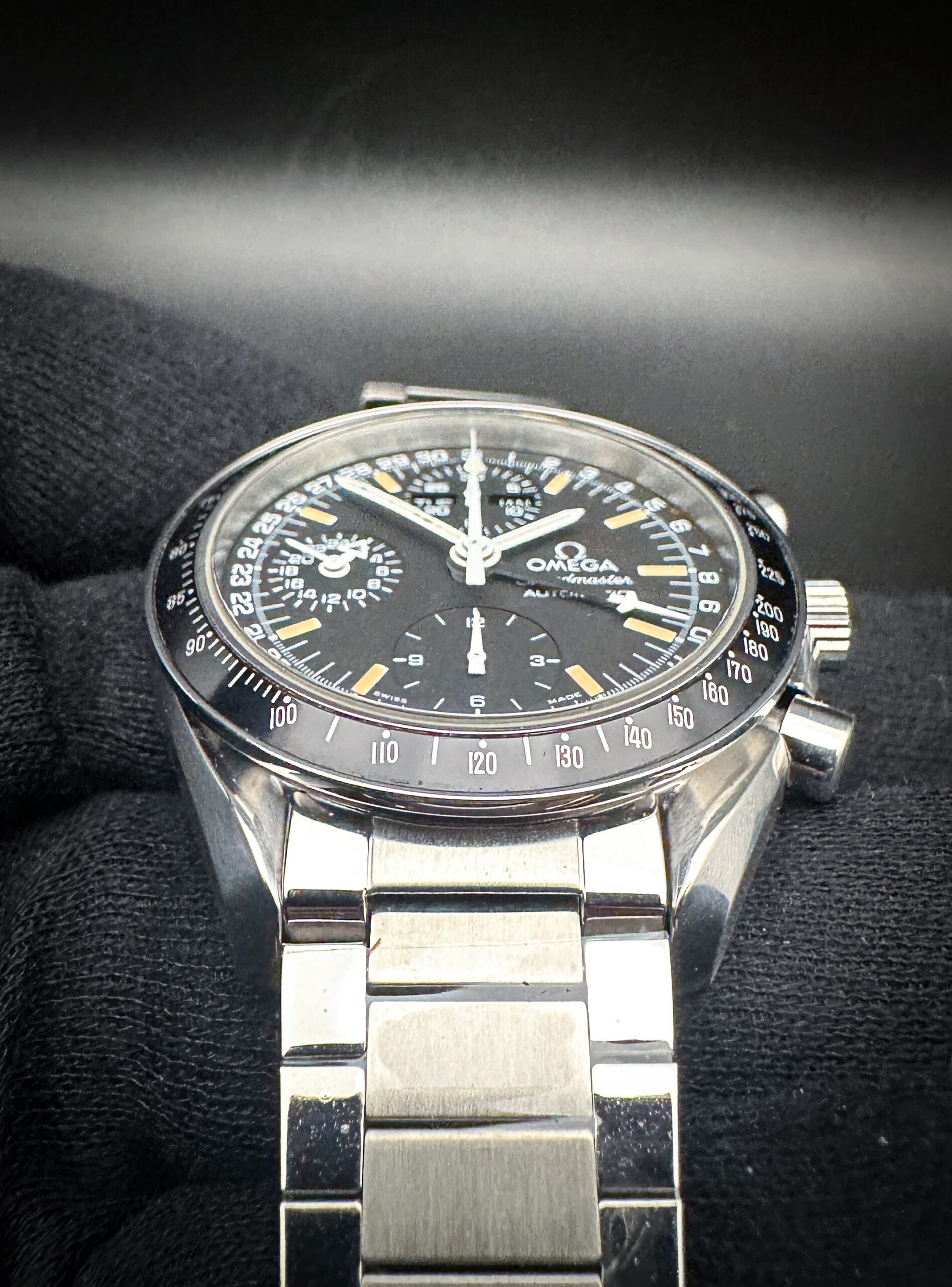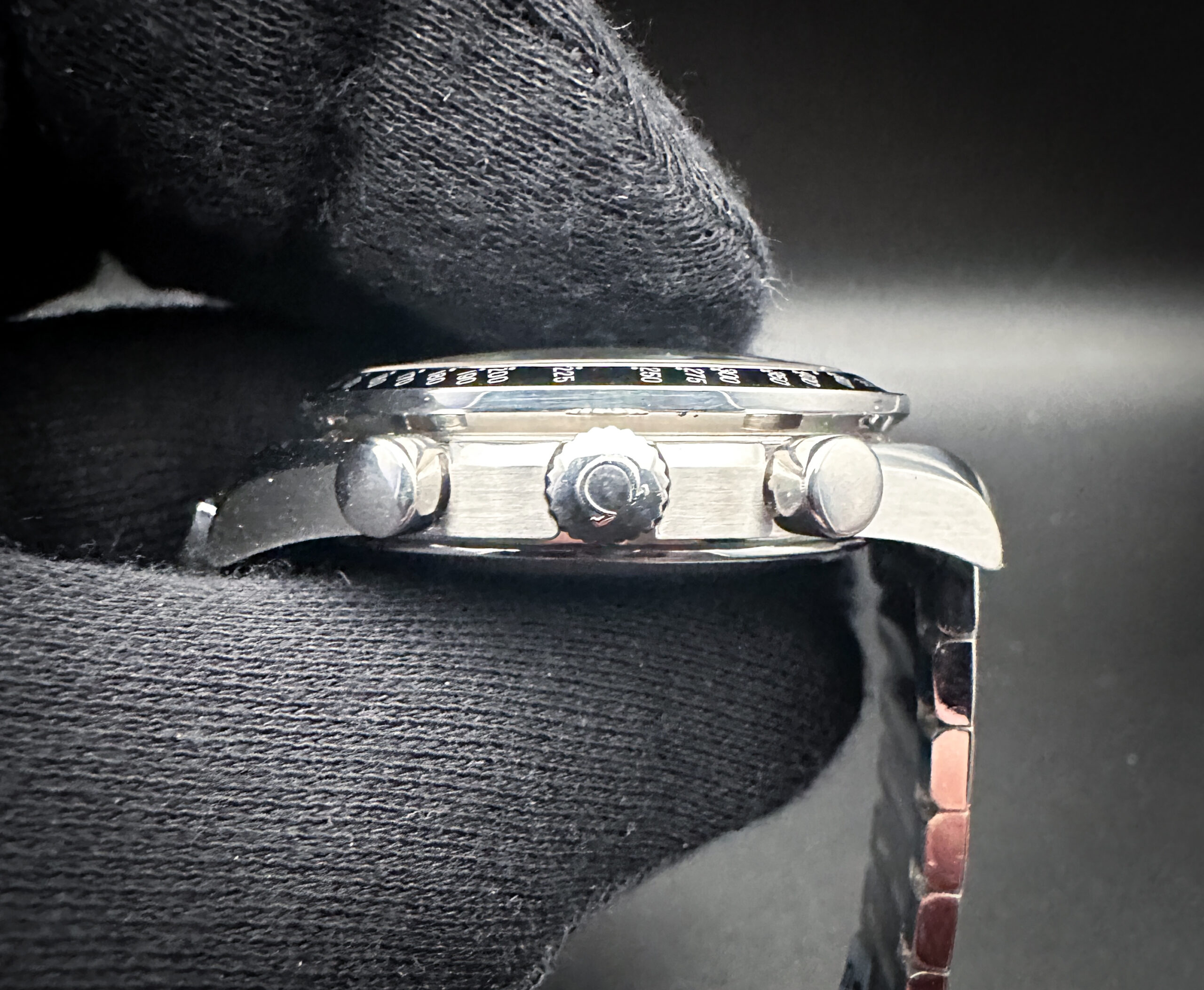 The crystal is clear and free of scratches or edge-chips. The original dial is clean, crisp, with stunning patina markers and numerals. The Tachymetre bezel is clean with crisp text, and a light patina to the inner edge. Overall the case is in good condition with faint lines consistent with age, and a few small marks on the bottom case edges.