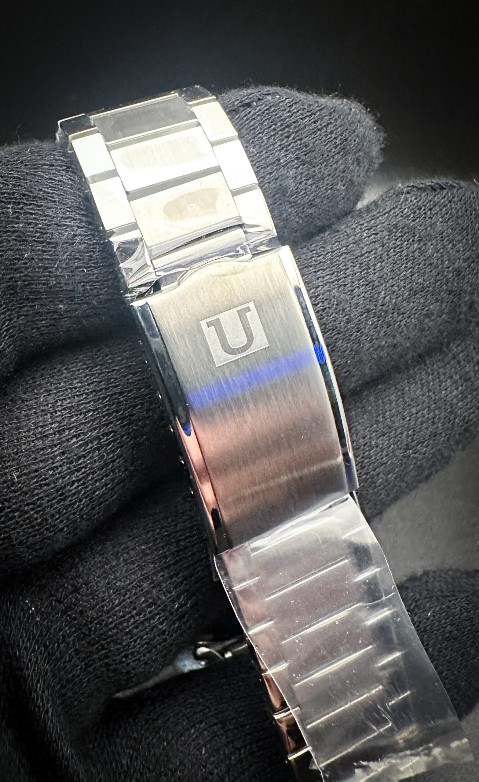 This Omega is paired with a new, unworn UNCLE Flat-Link US1035 stainless steel bracelet. The bracelet has 12 removable links currently installed and will currently fit an 8.25 inch wrist. The protective plastic is still attached to the bracelet.