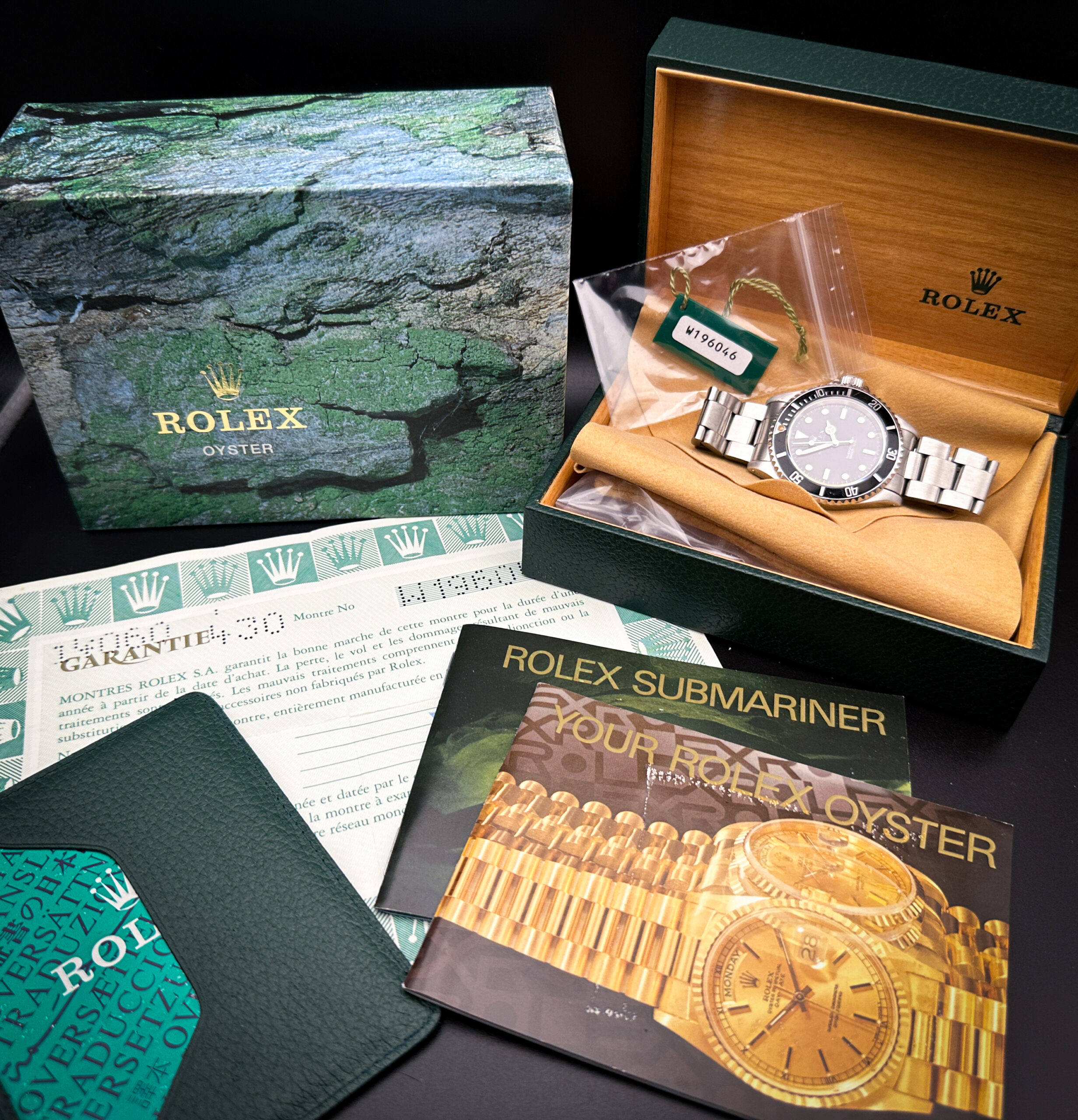 1995 (W-Serial) Rolex Submariner 14060 in a 40mm stainless steel case, featuring an original Blue-Ghosted bezel. This watch includes a new Wrist Wraith watch roll, and a TLC warranty/authentication card.