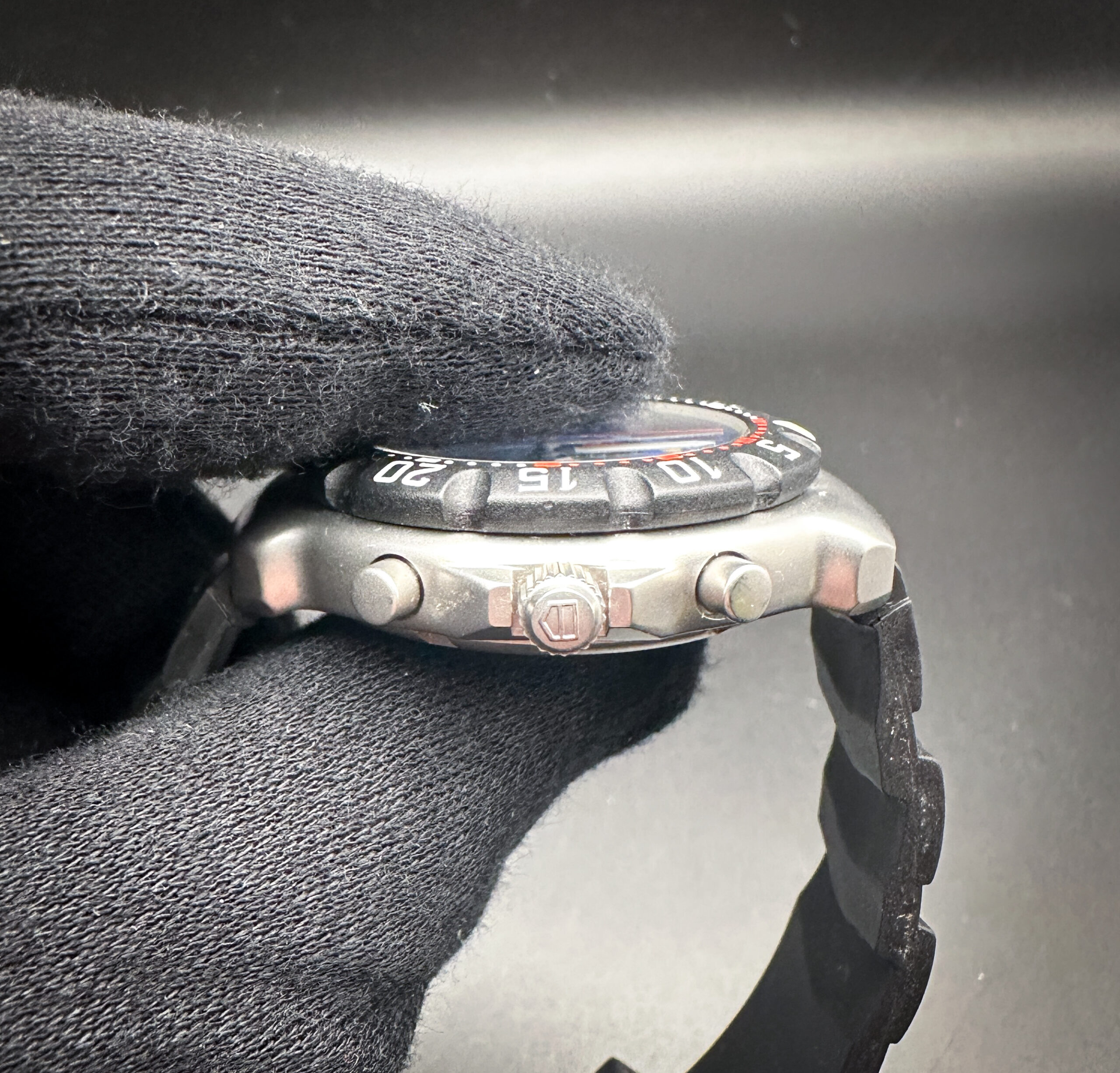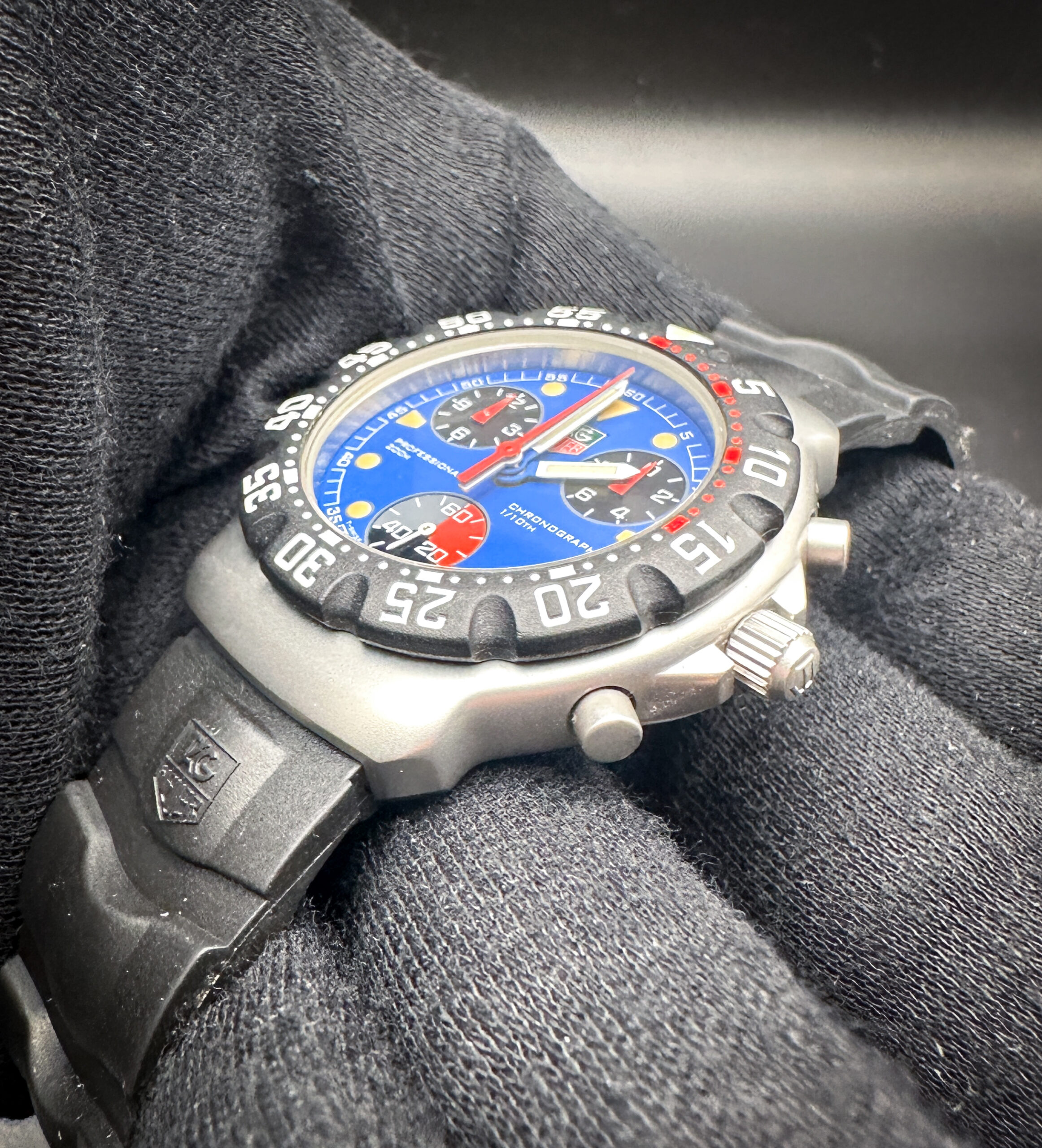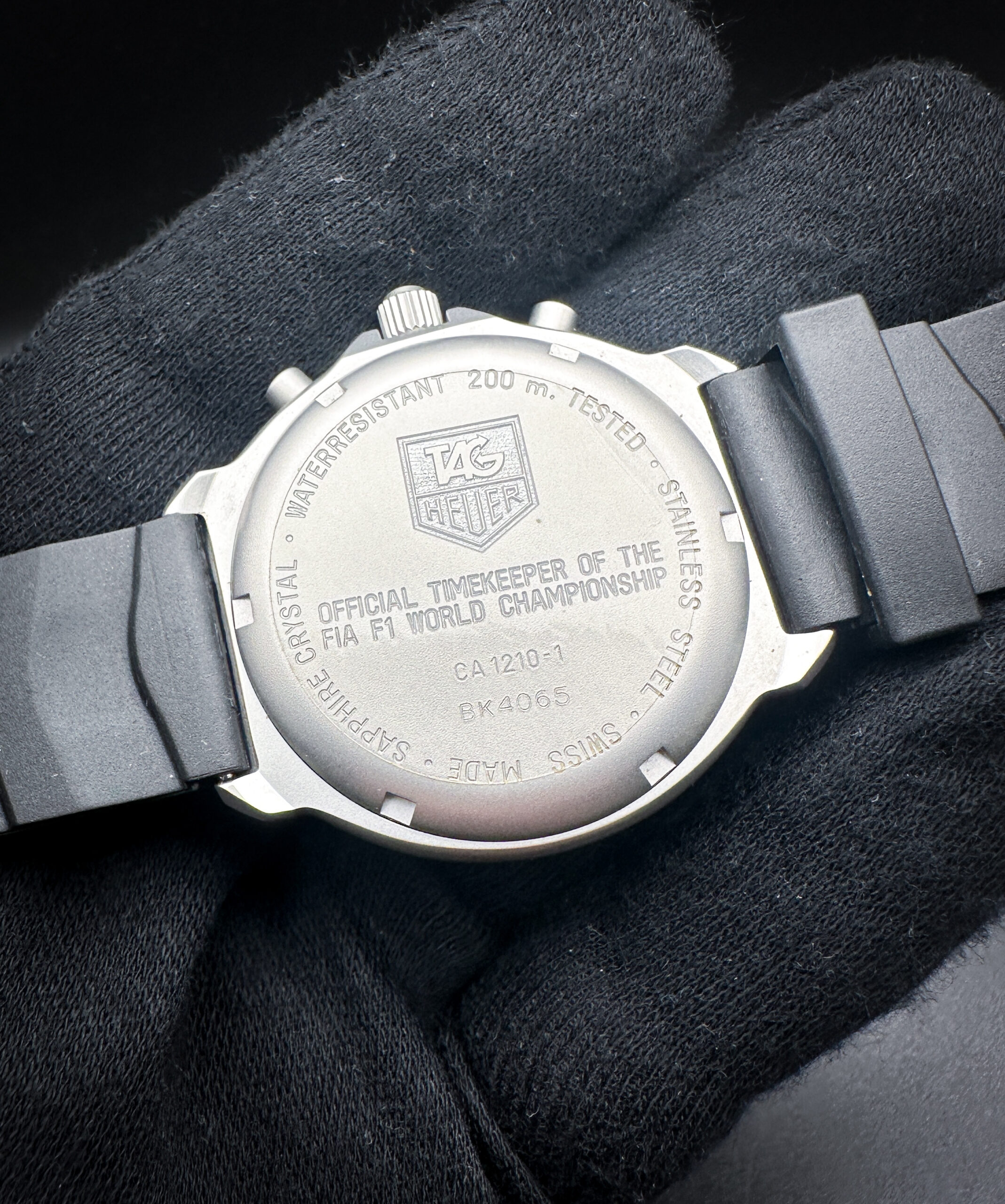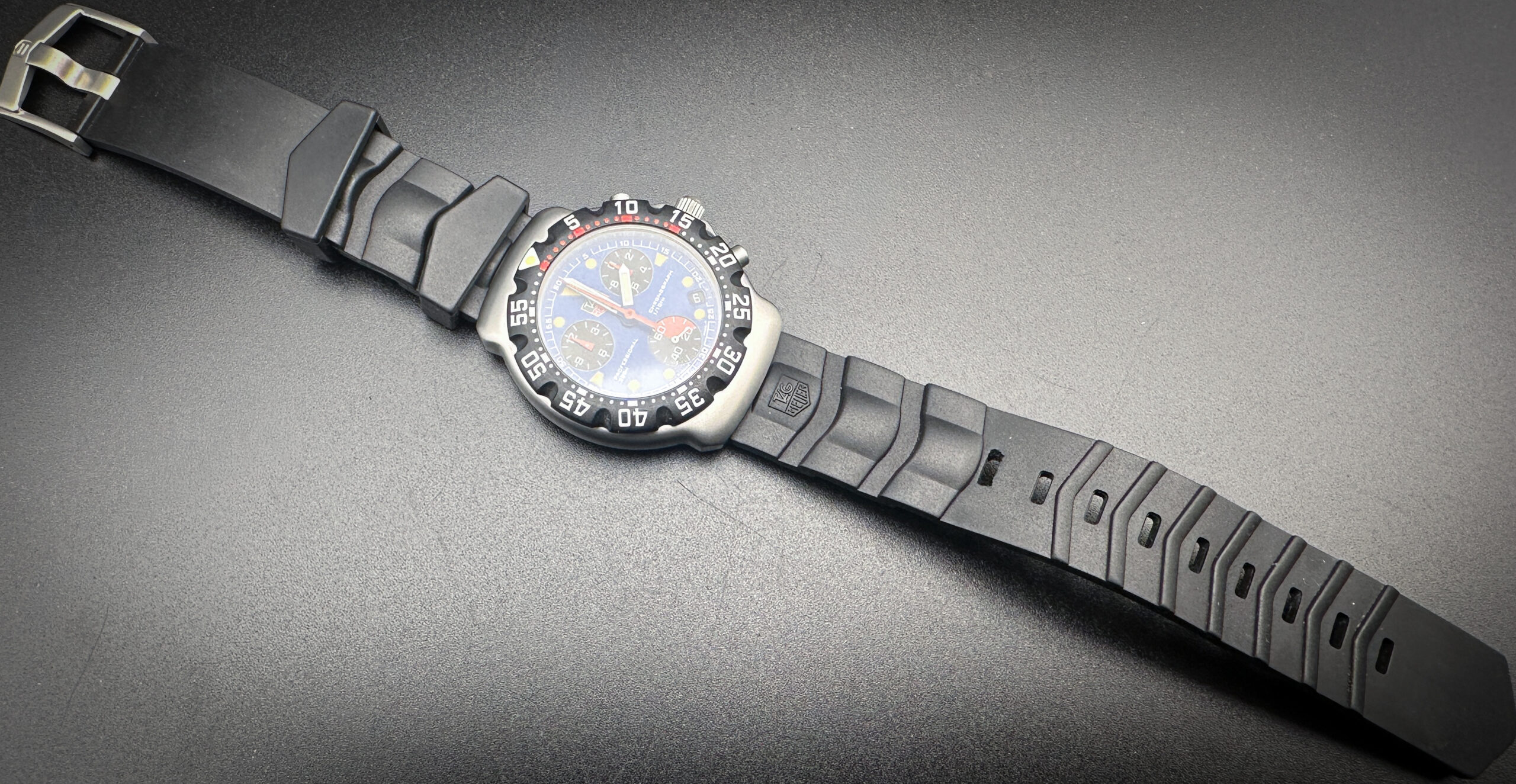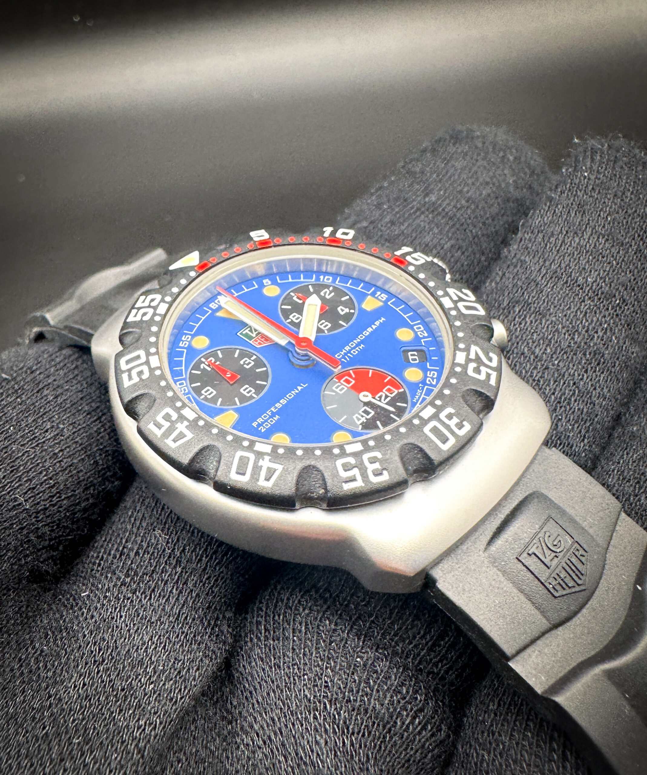 This TAG Heuer F1 is in stellar condition, with no scratches, mars, marks, or dents. The crystal is clear and free of scratches or mars. The bezel is clean, with no discoloration or scratches. The caseback still has the protective film attached. The original band is still soft, pliable, and ready for wear.