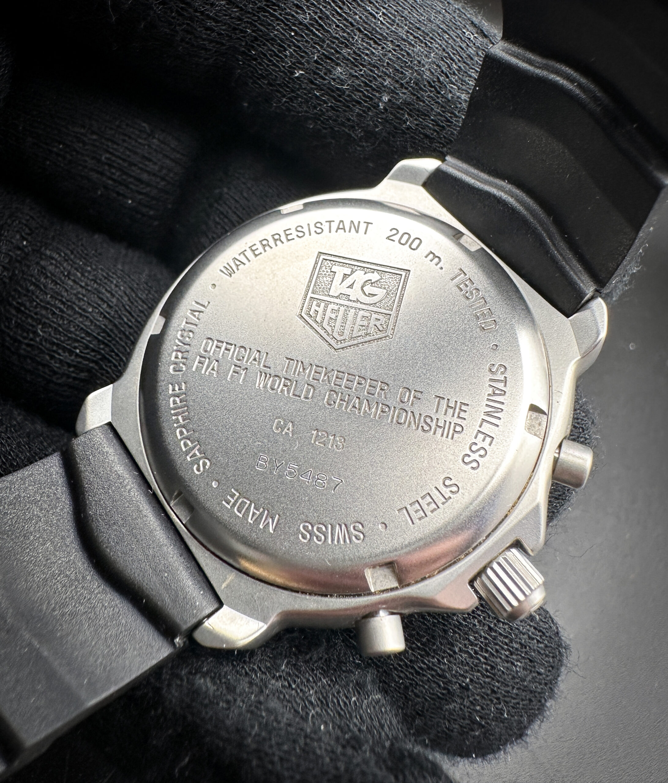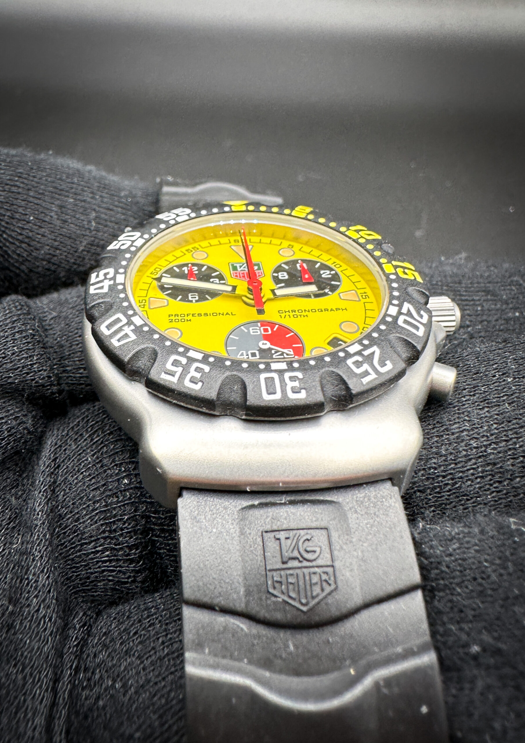 This TAG Heuer F1 is in stellar condition, with no scratches, mars, marks, or dents. The crystal is clear and free of scratches or mars. The bezel is clean, with no discoloration or scratches. The original band is still soft, pliable, and ready for wear.