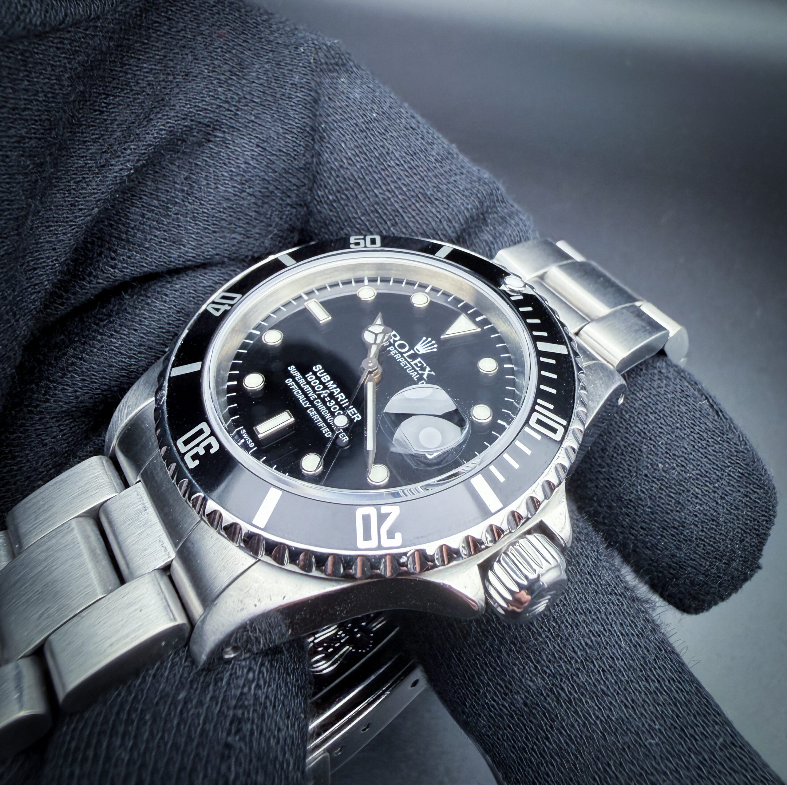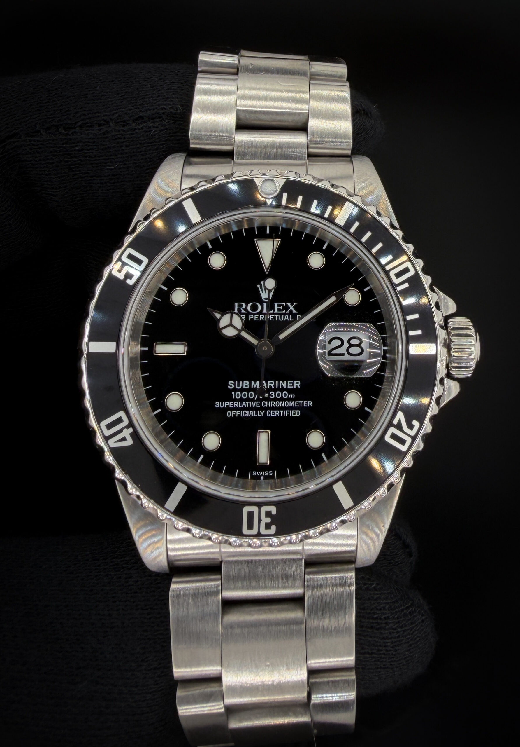 Vintage 1999 Rolex Submariner Date reference 16610, presented in stainless steel with the classic black dial and matching black bezel that made this reference one of the most recognizable modern Rolex sports watches ever produced. The 40mm Oyster case delivers the clean, balanced proportions collectors appreciate in late 1990s Submariner models.