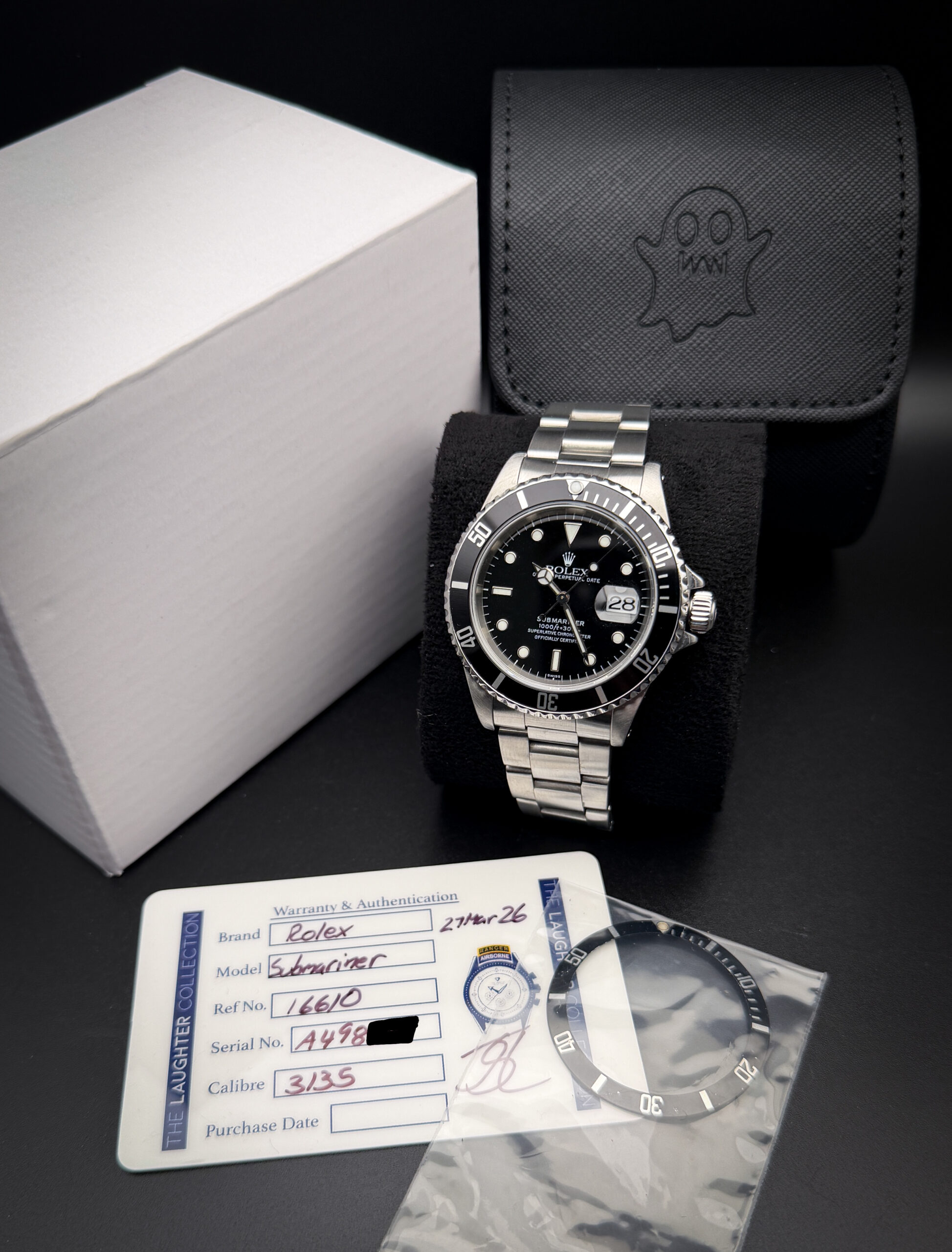 Powering this Submariner is the Rolex caliber 3135, one of the brand’s most respected automatic movements, known for its durability, serviceability, and dependable long-term performance. For buyers seeking a properly serviced Rolex Submariner Date 16610 with strong wearable condition, correct bracelet configuration, and the added benefit of its original bezel insert included, this 1999 example is an excellent opportunity.
