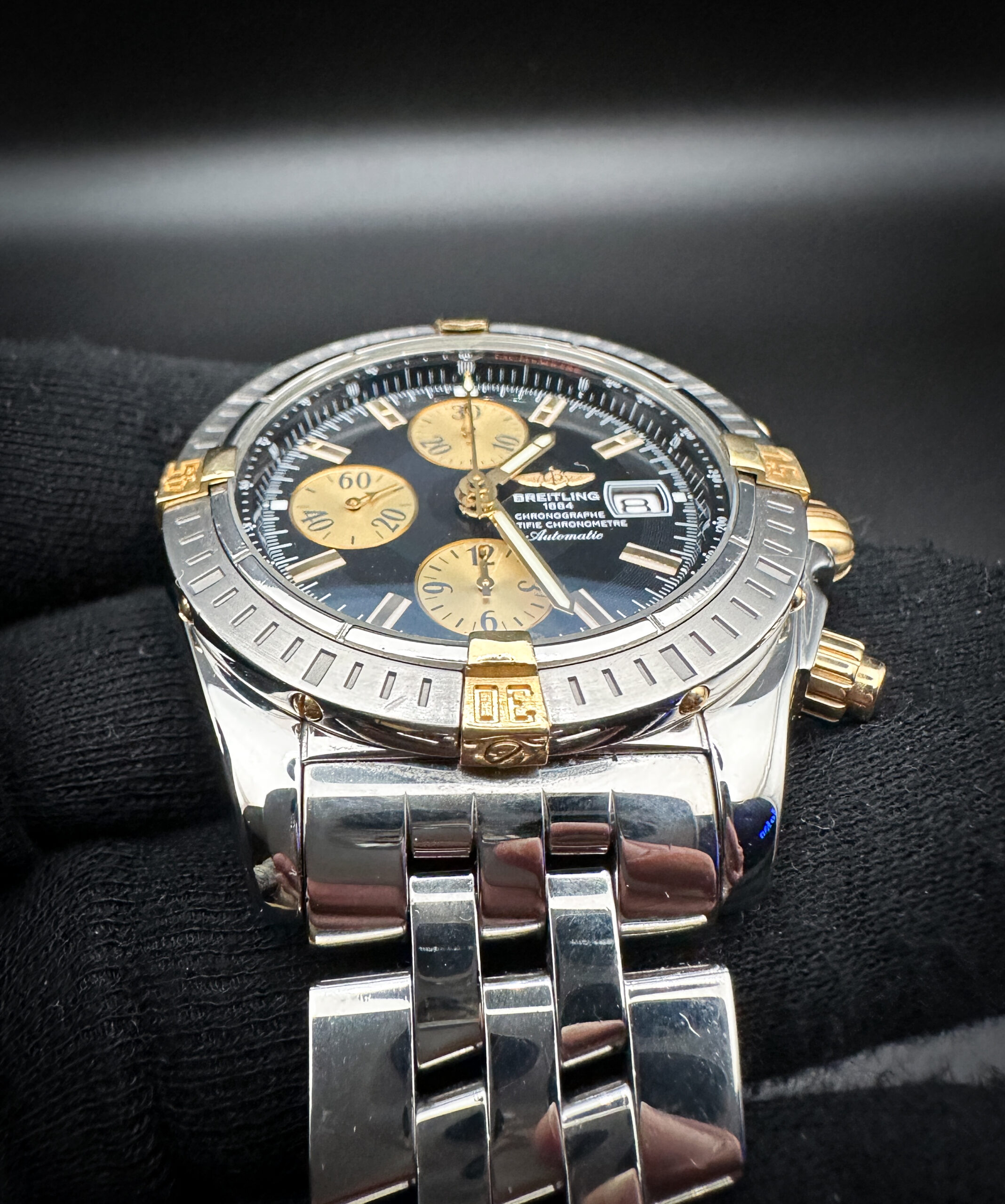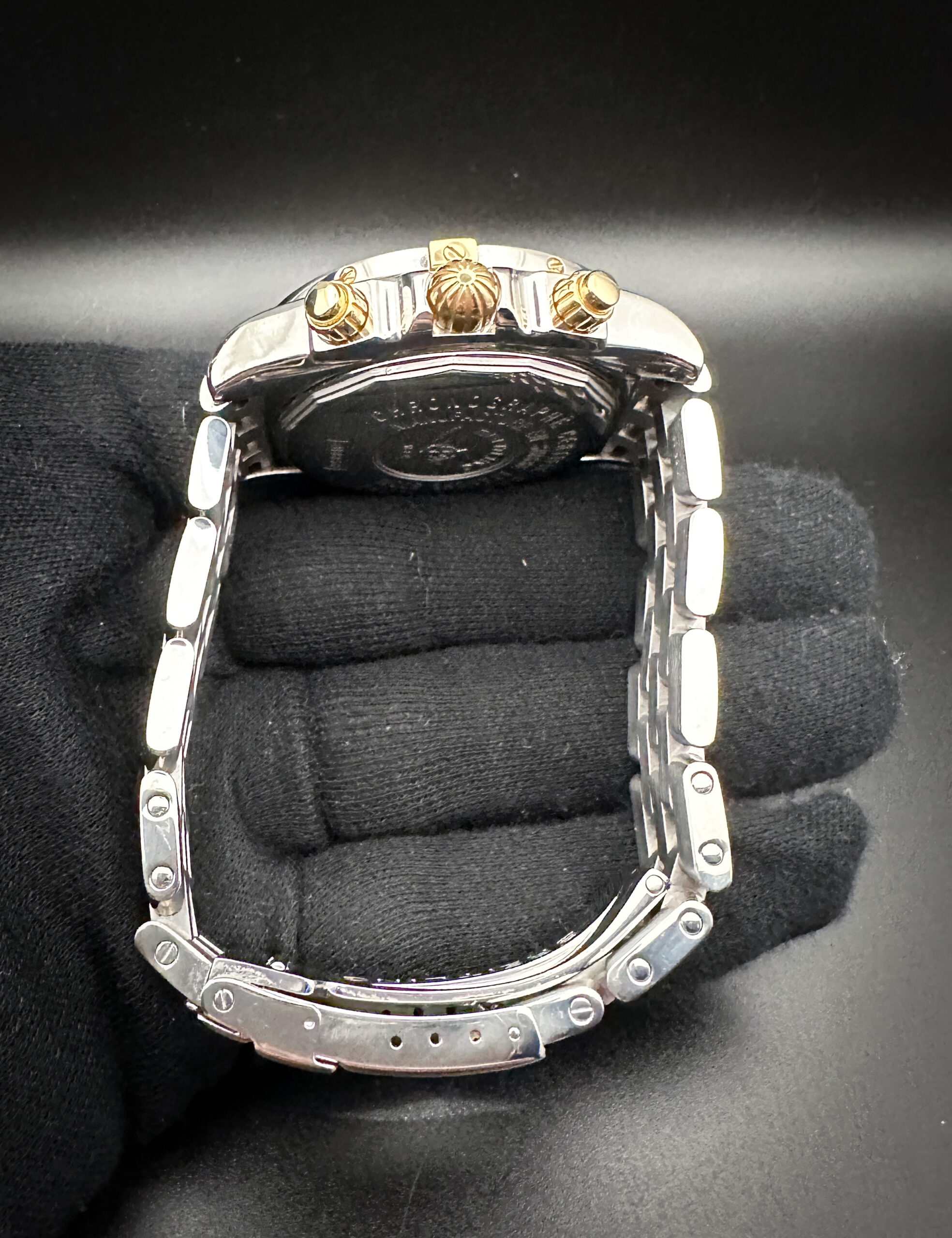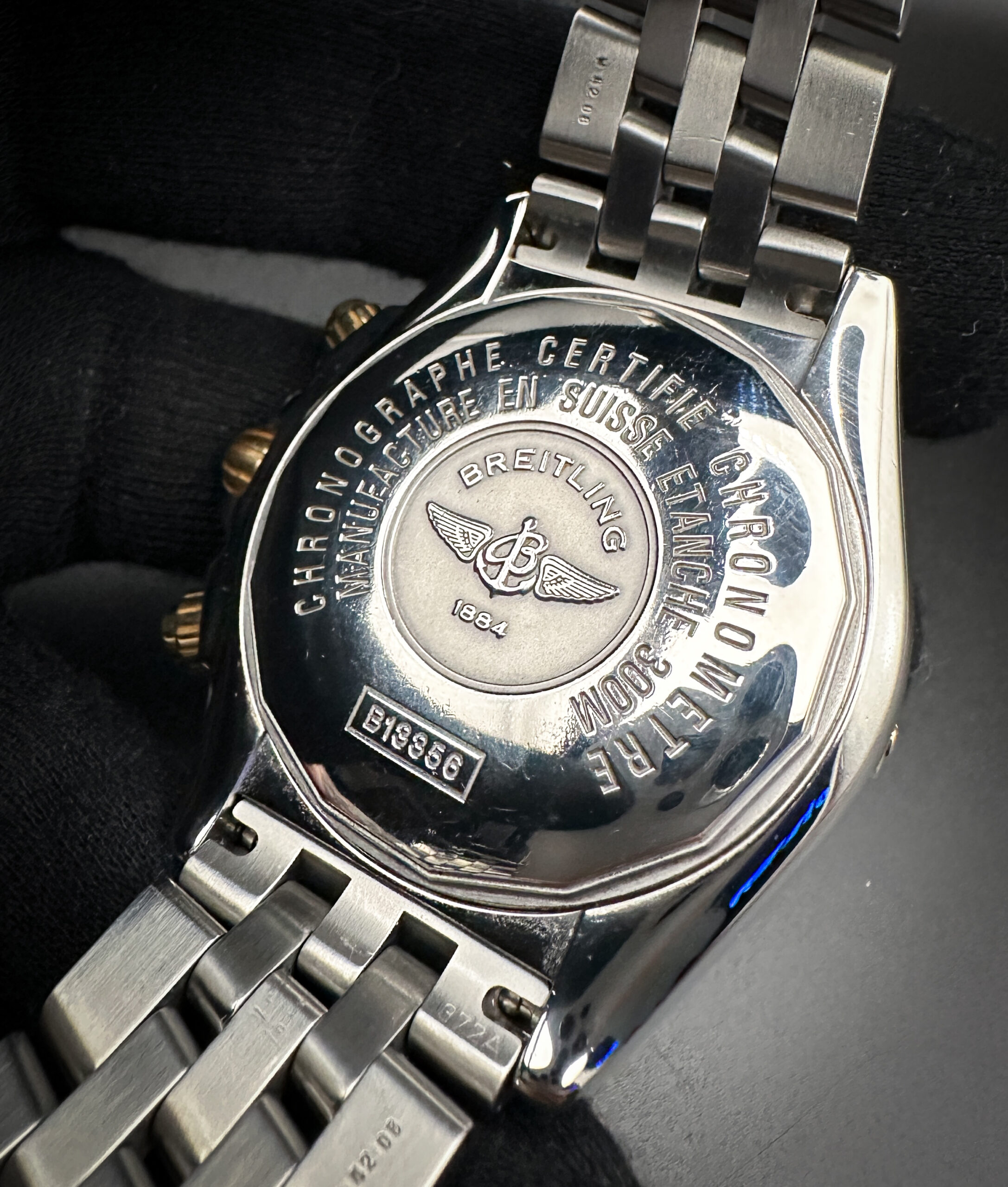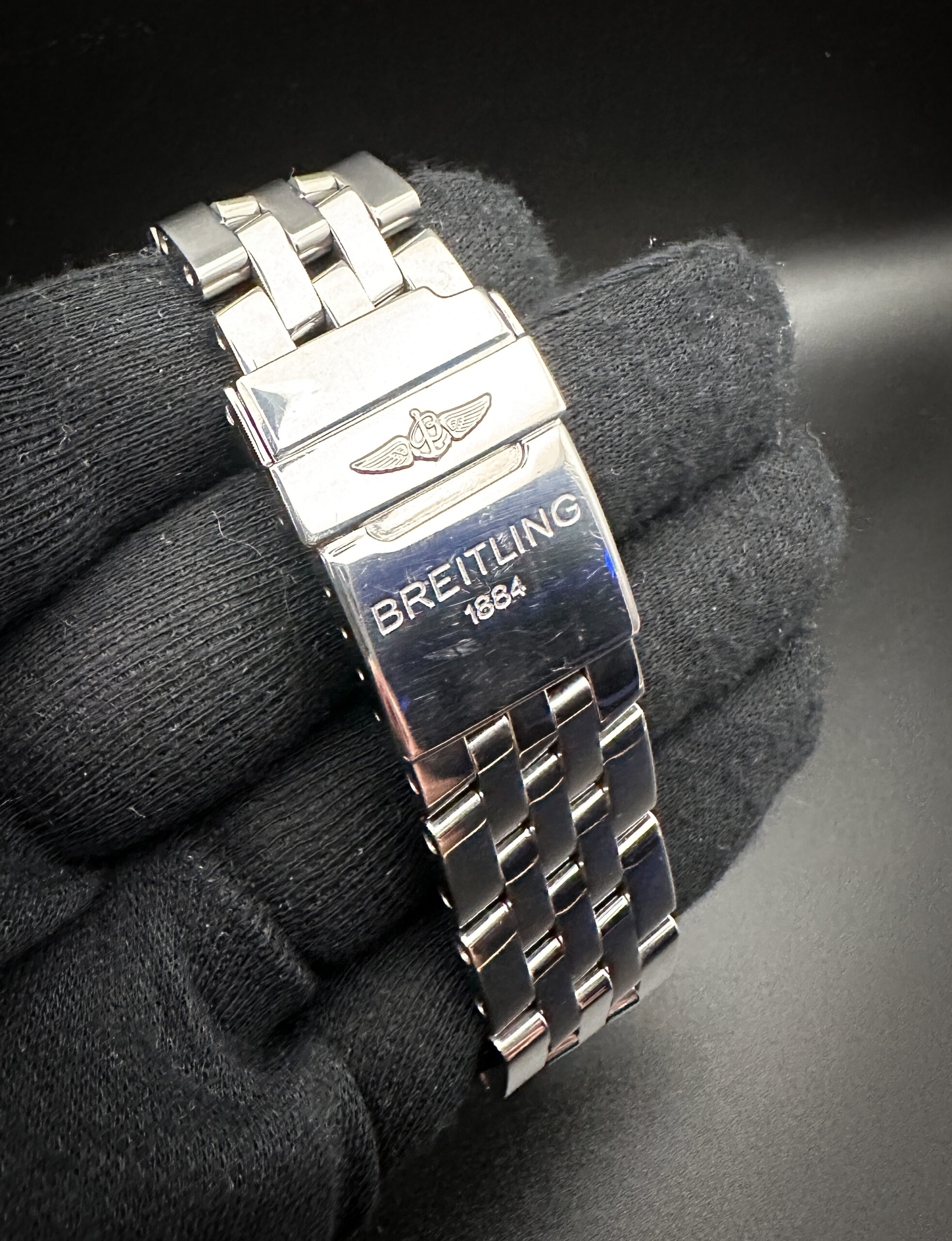 This Breitling is paired with the original Breitling stainless steel bracelet. The bracelet has three (3) removable links currently installed and will fit an 8 inch wrist.