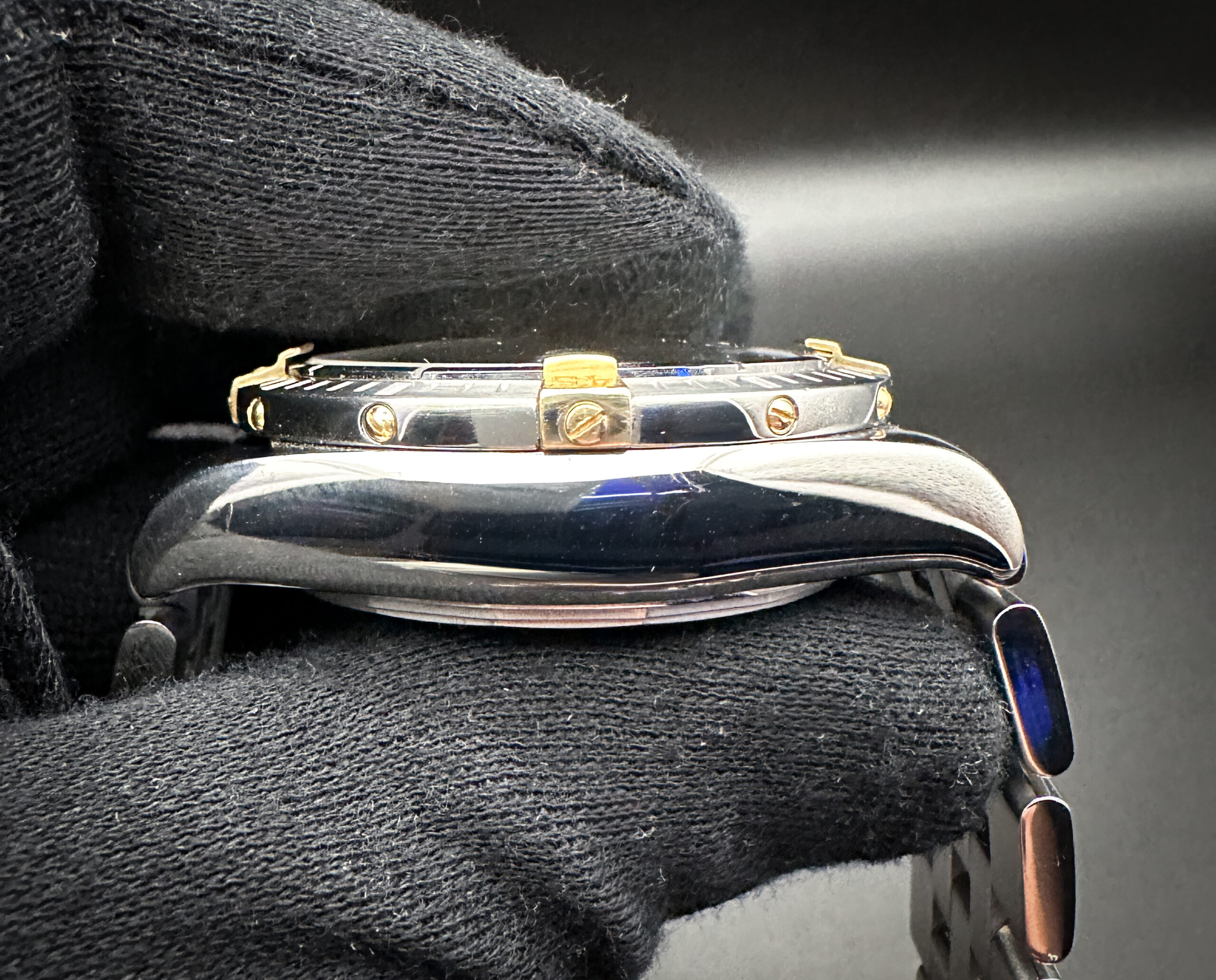 The crystal is clear with no scratches or edge chips. The original dial and hands are beautiful, with no marks or stains. The lum on the hands has a strong glow in the dark. The bezel is in excellent condition with no scratches, dents or marks. The bezel clicks smoothly as original designed. Overall the case is in wonderful condition with no significant scratches, dents or gouges. The chronograph pushers unscrew smoothly and the crown screws down correctly.
