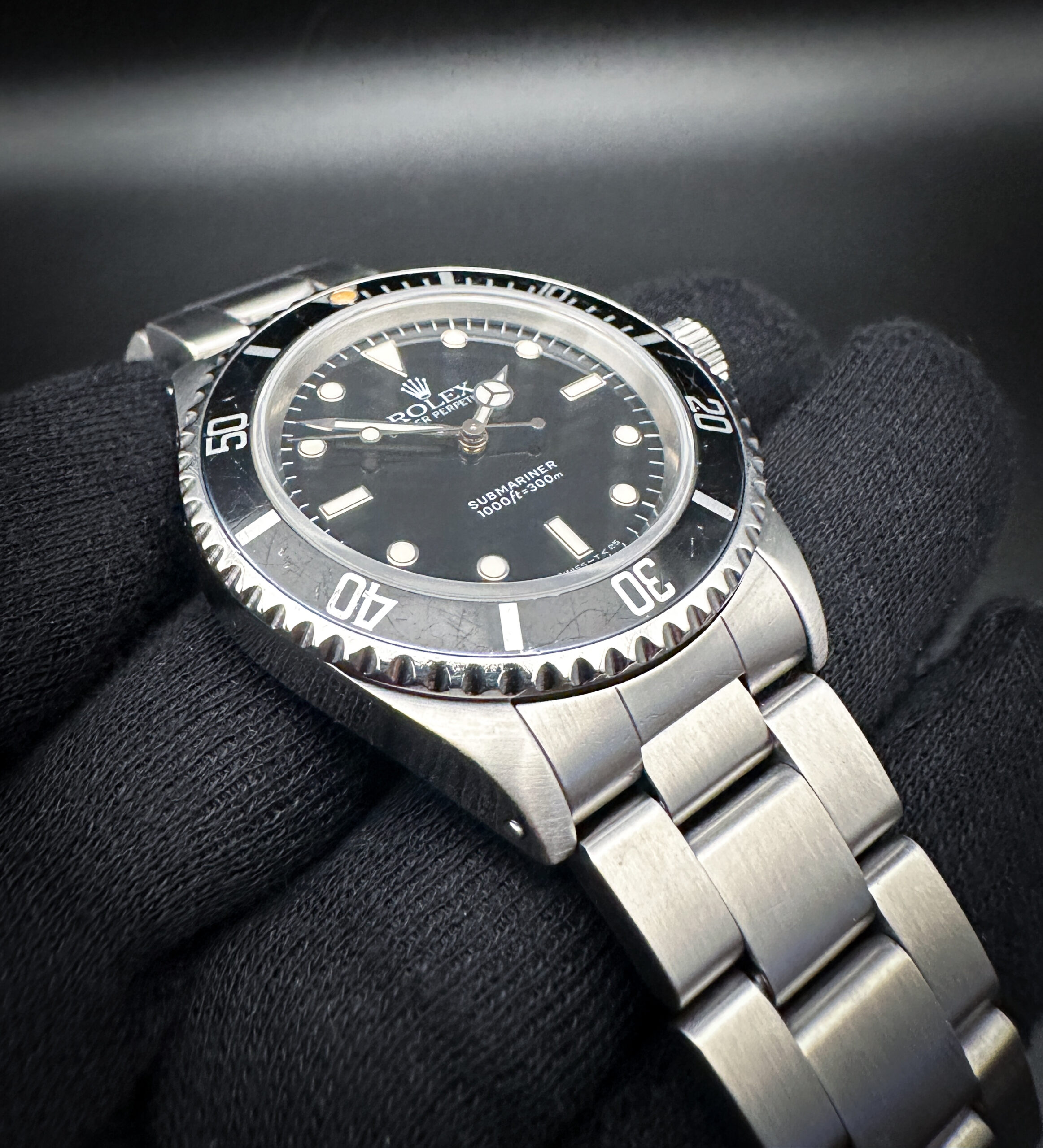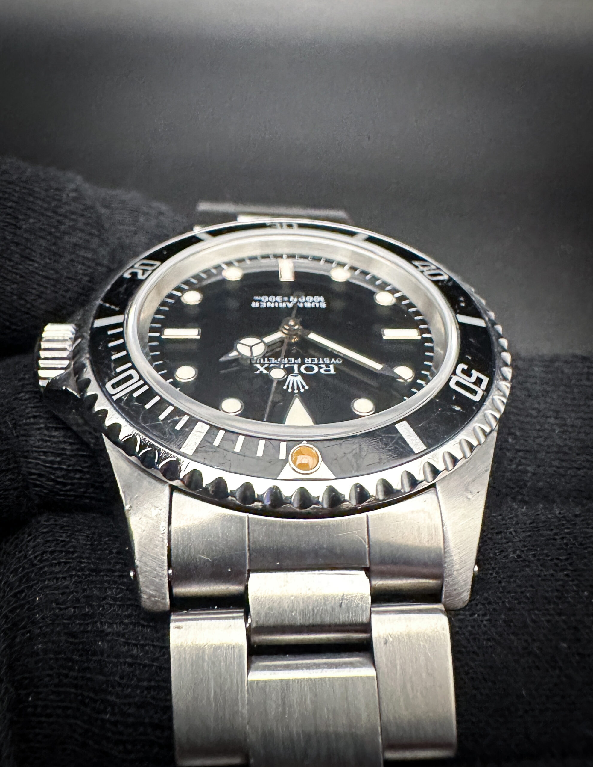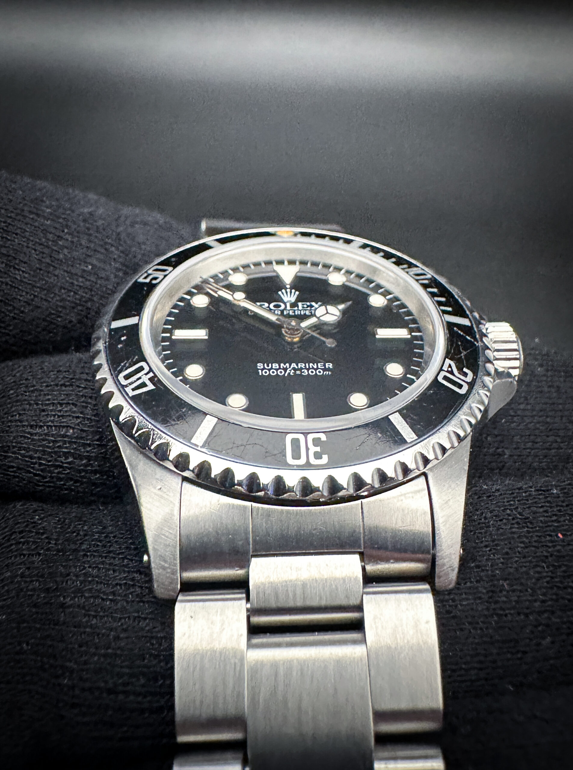 The sapphire crystal is clear and free of scratches or edge-chips. The original dial and hands are clean and crisp with a faint patina to the lume, with no stains or discoloration. The original black bezel is lightly faded with marks consistent with age, and a beautiful dark patina pearl pip. Overall the case is in good condition with light spider-lines consistent with age and careful use.