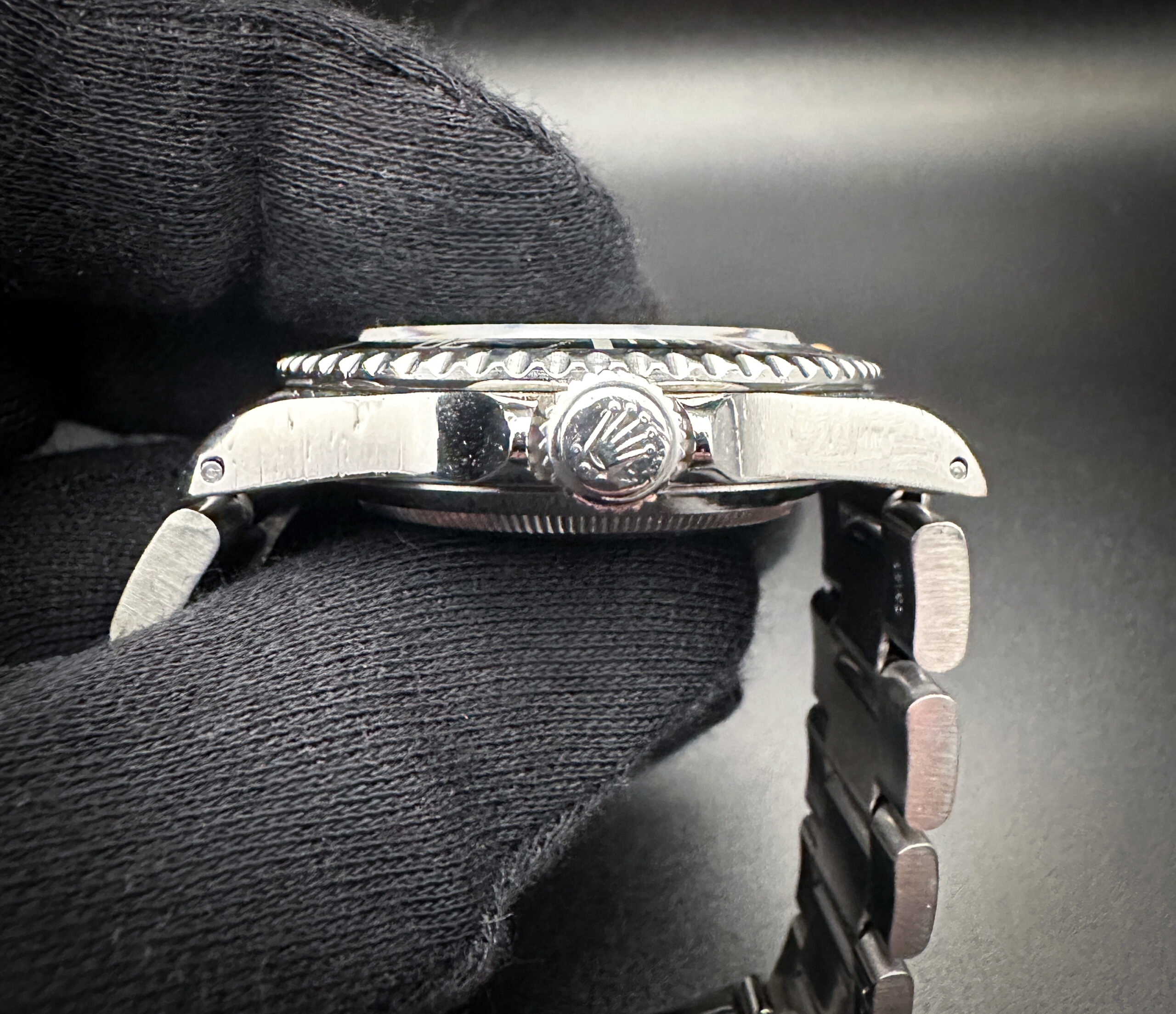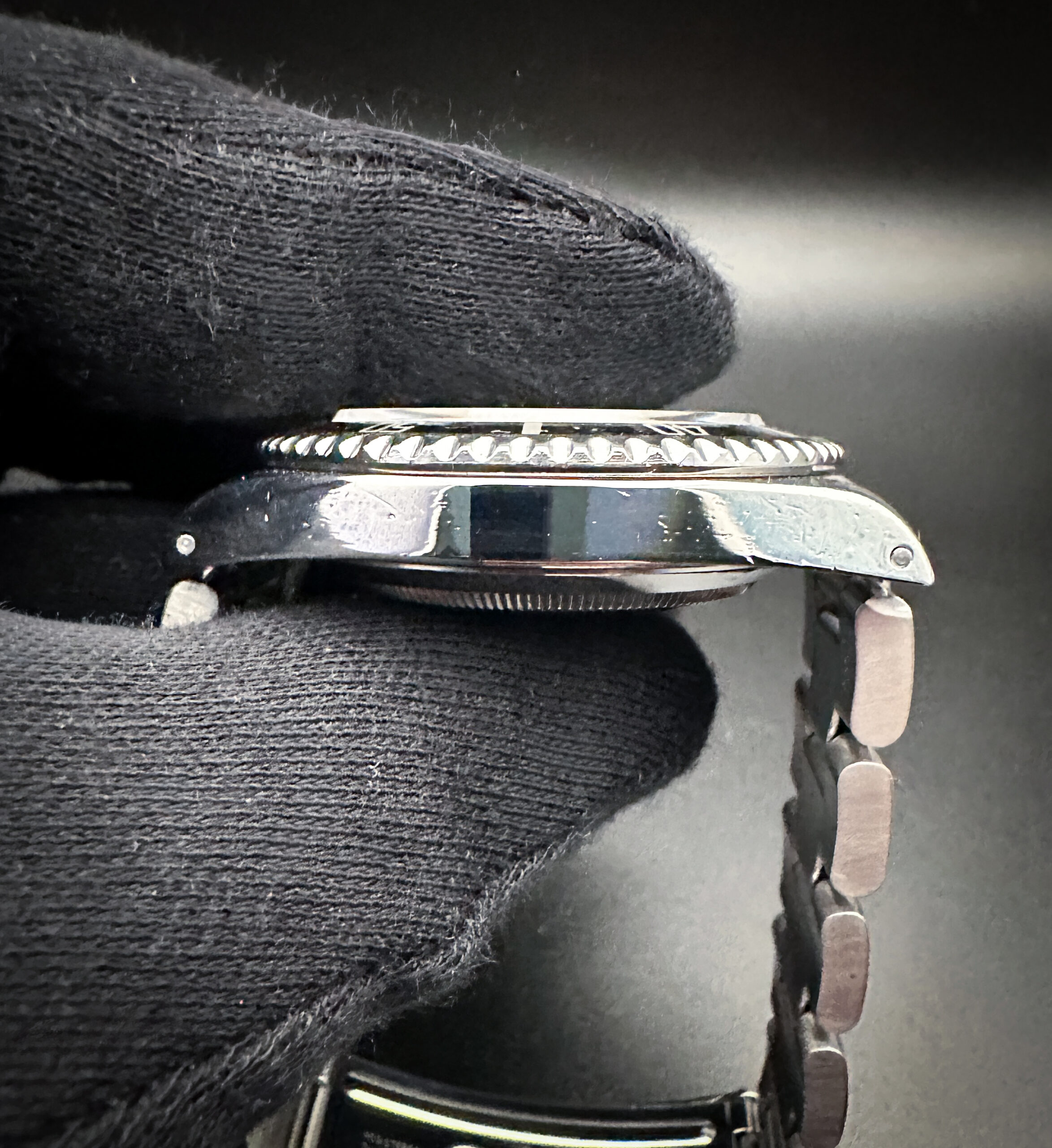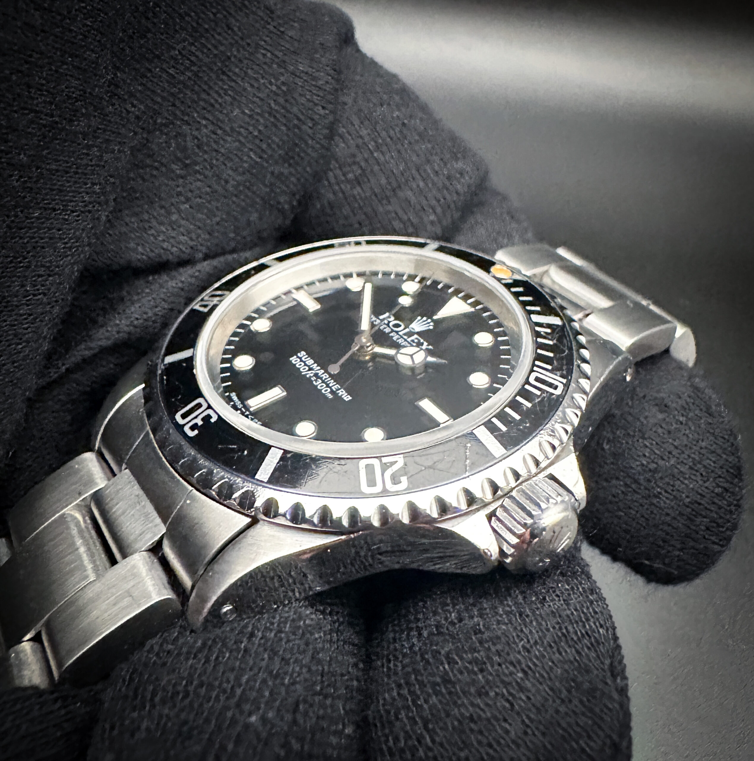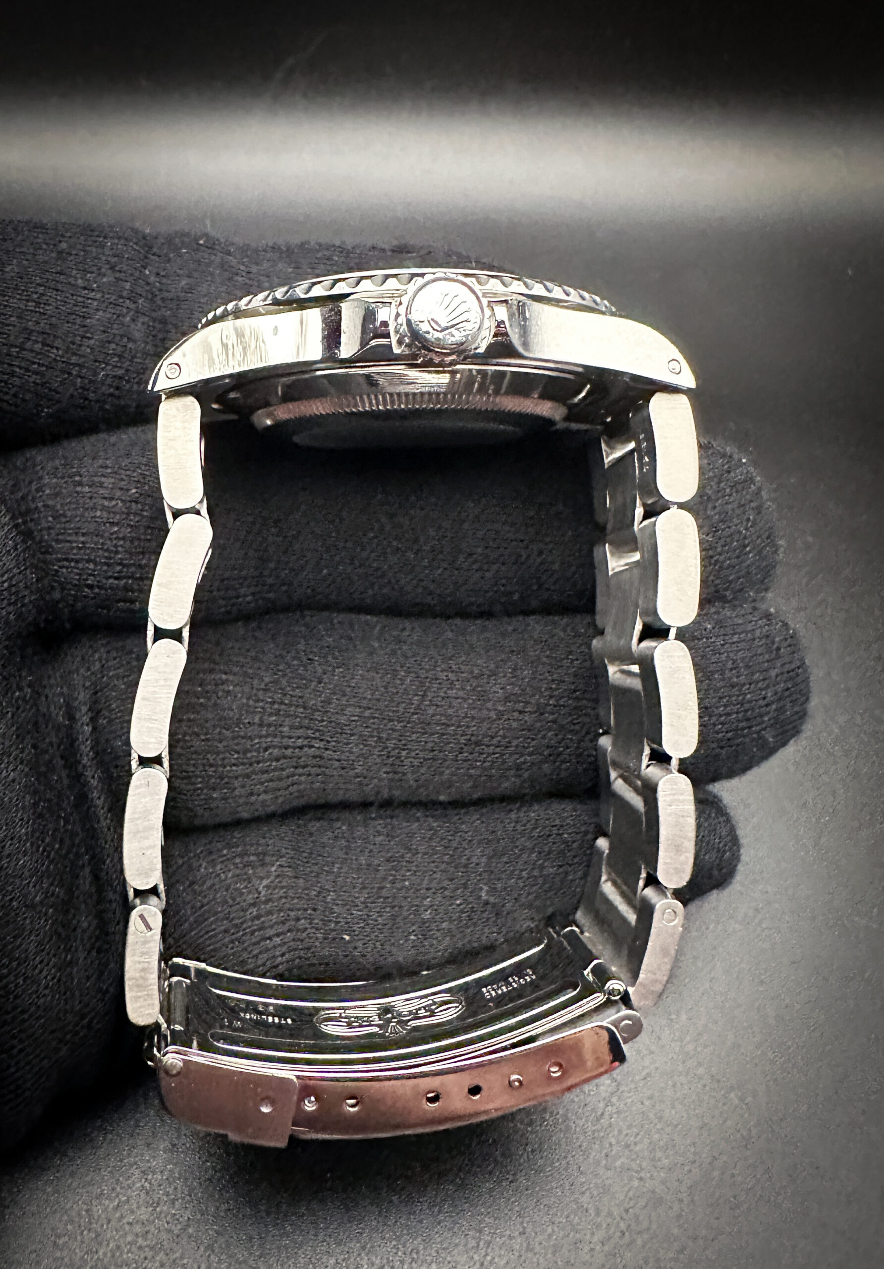 The sapphire crystal is clear and free of scratches or edge-chips. The original dial and hands are clean and crisp with a faint patina to the lume, with no stains or discoloration. The original black bezel is lightly faded with marks consistent with age, and a beautiful dark patina pearl pip. Overall the case is in good condition with light spider-lines consistent with age and careful use.