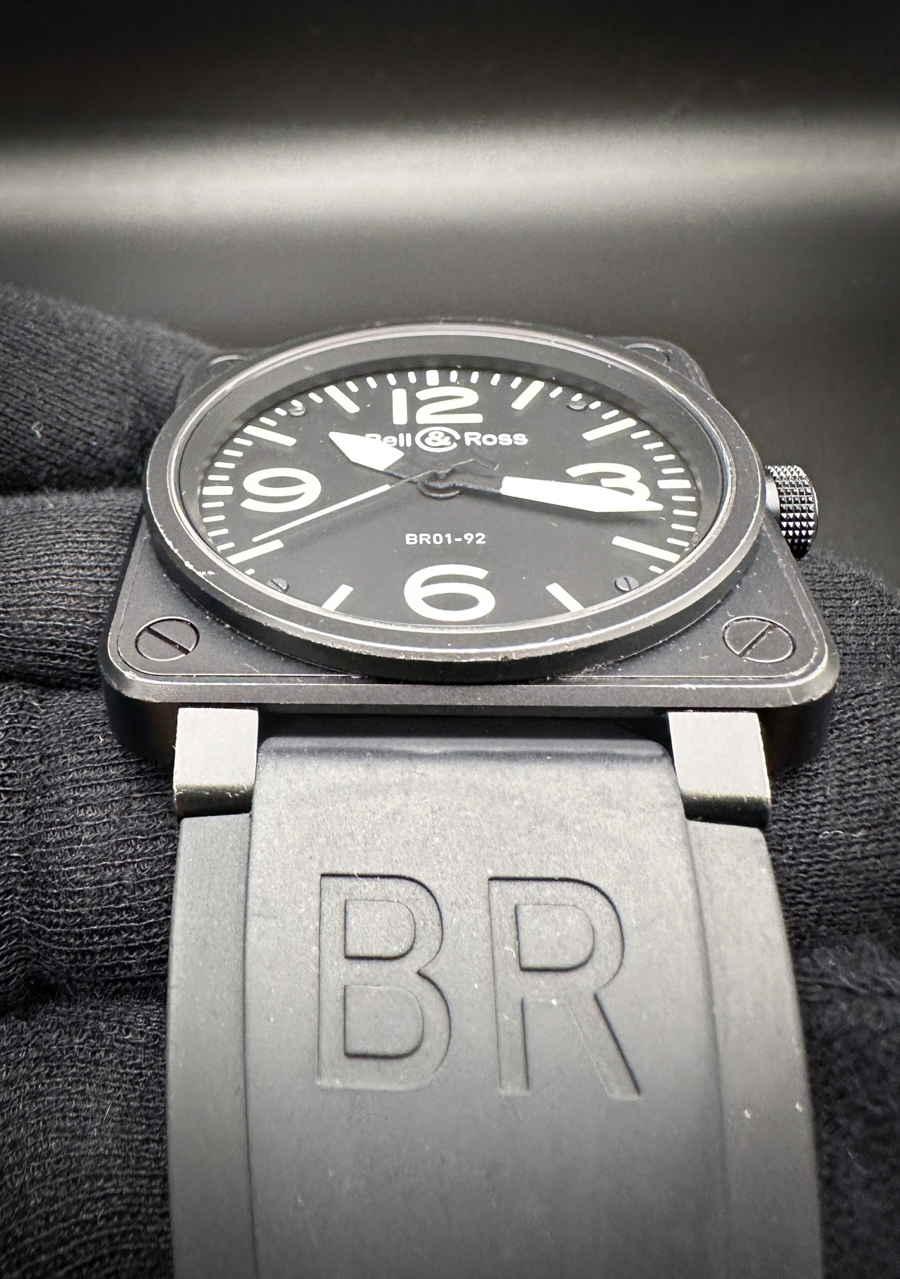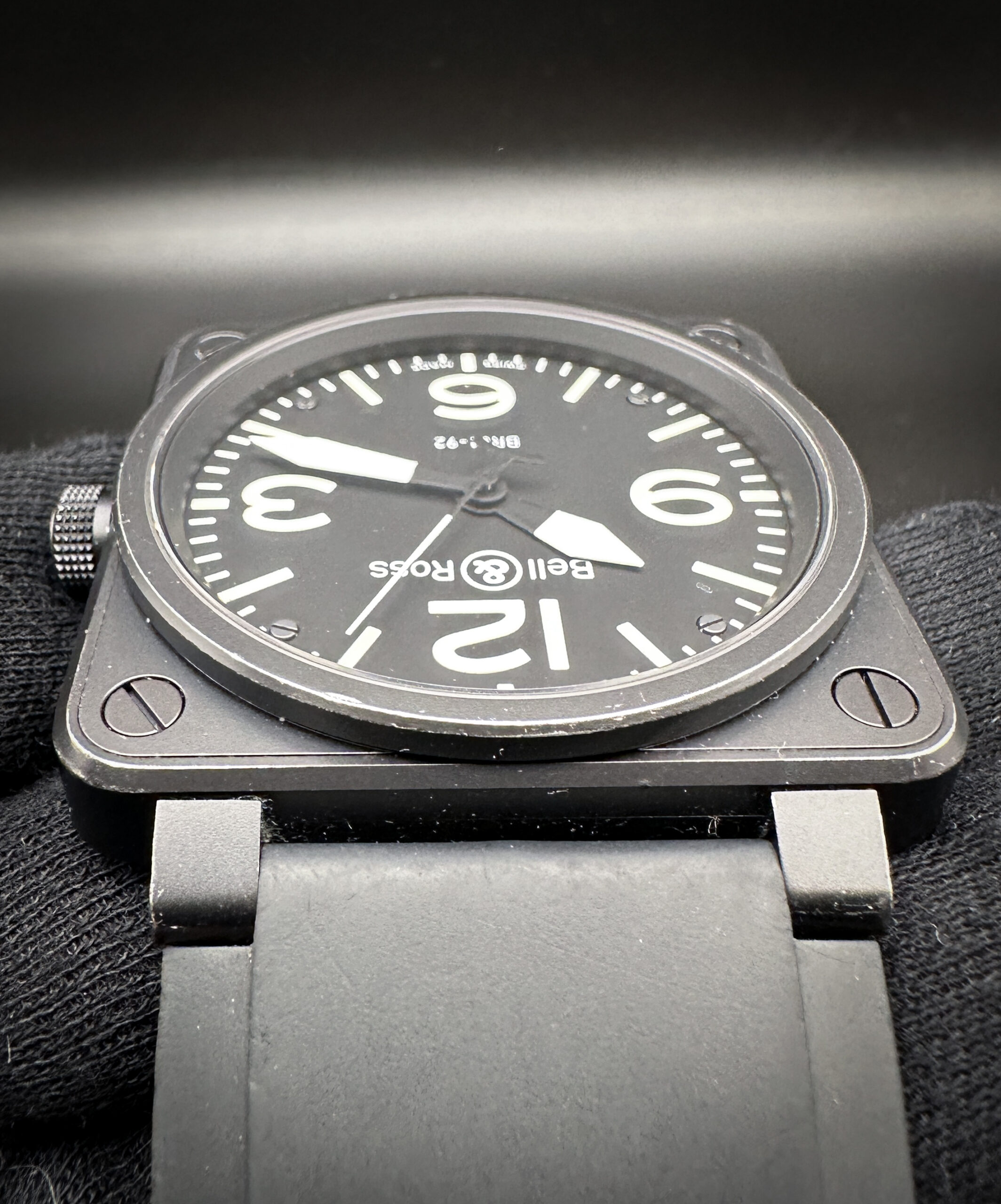 Bell and Ross BR01-92-S Diver in a 46mm square case, featuring the ETA 2892 automatic movement. This BR has been tested in excellent working order and is ready for wear. Includes a New Wrist Wraith watch roll, and a TLC Warranty/Authentication Card.