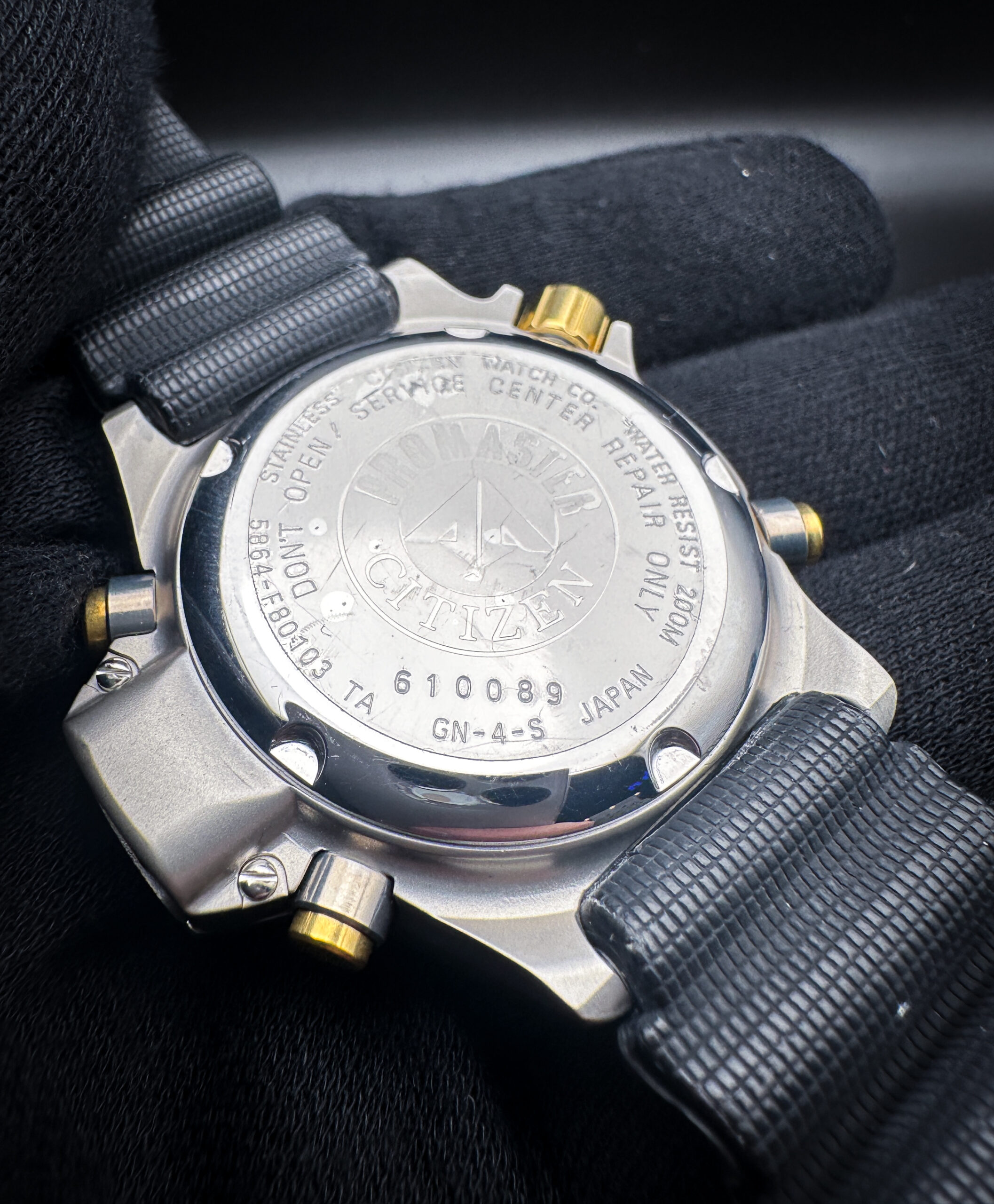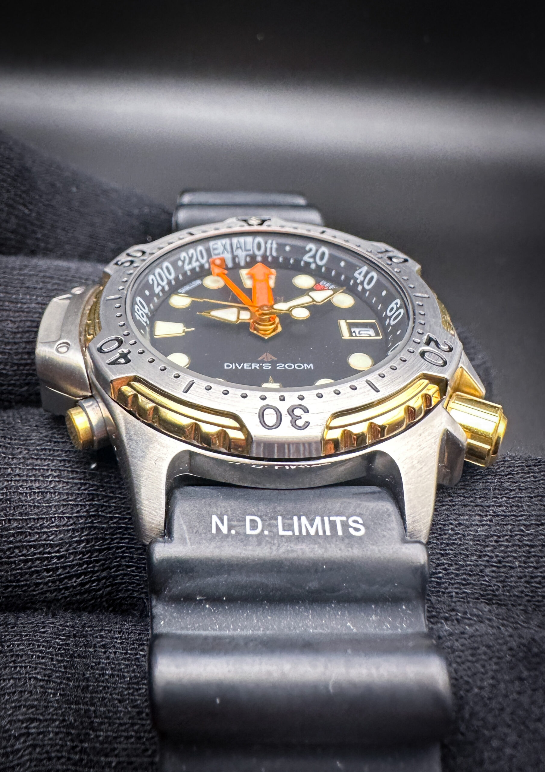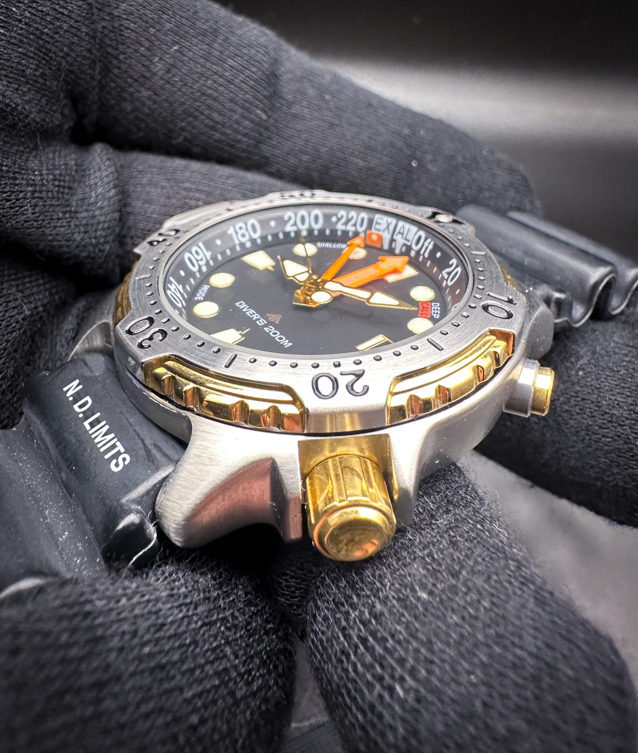 The Citizen 5864-F80103TA is a rare, vintage Promaster Aqualand diver’s watch, from the 1990s, with a stainless steel case, 200m water resistance, and a black NATO strap. Key features include a quartz movement, an analog display, a unidirectional rotating bezel with a silver and gold color scheme, a screw-down case back and crown, and a luminous dial for visibility underwater. This model is a durable and functional tool for diving and everyday wear.