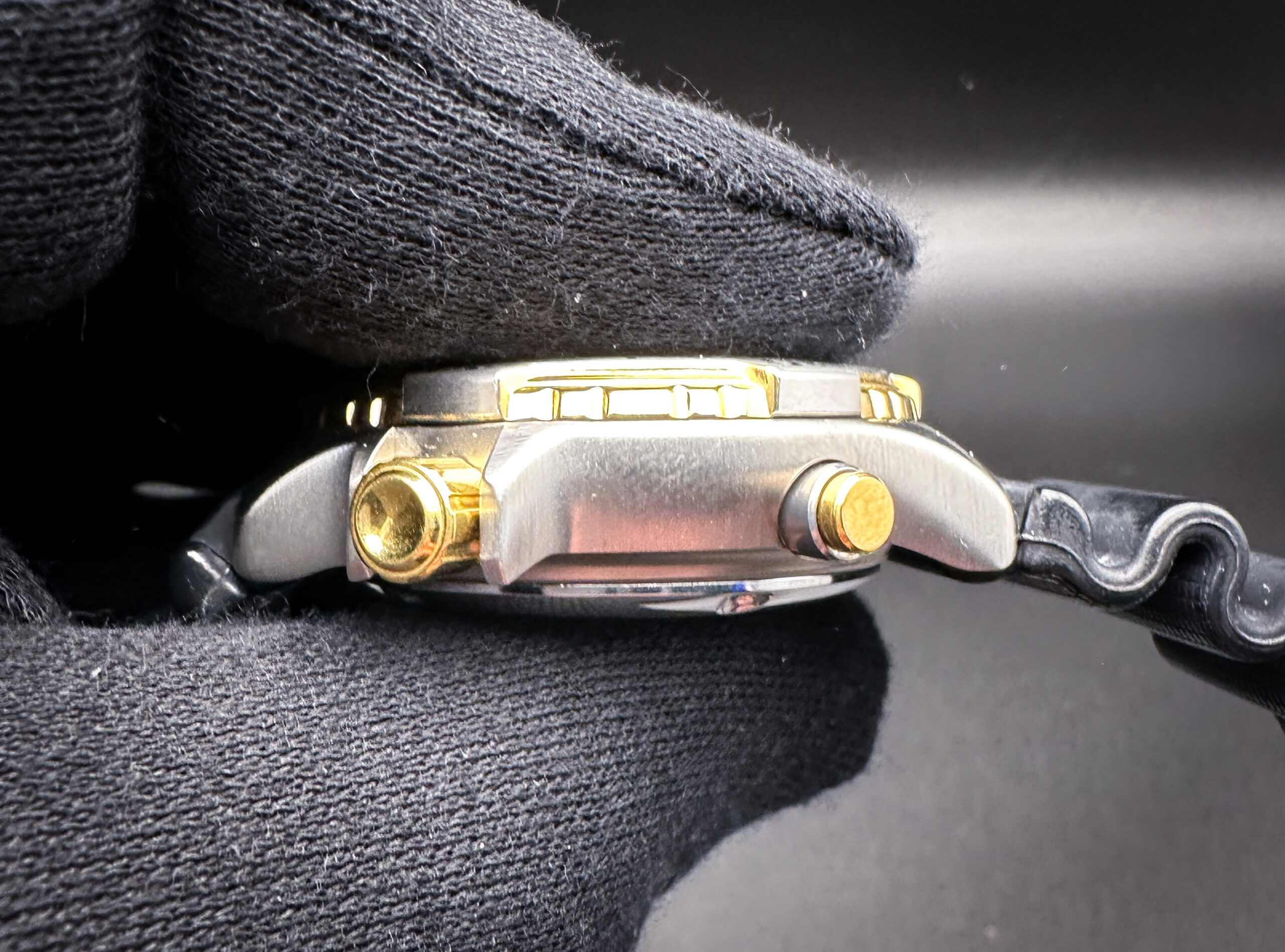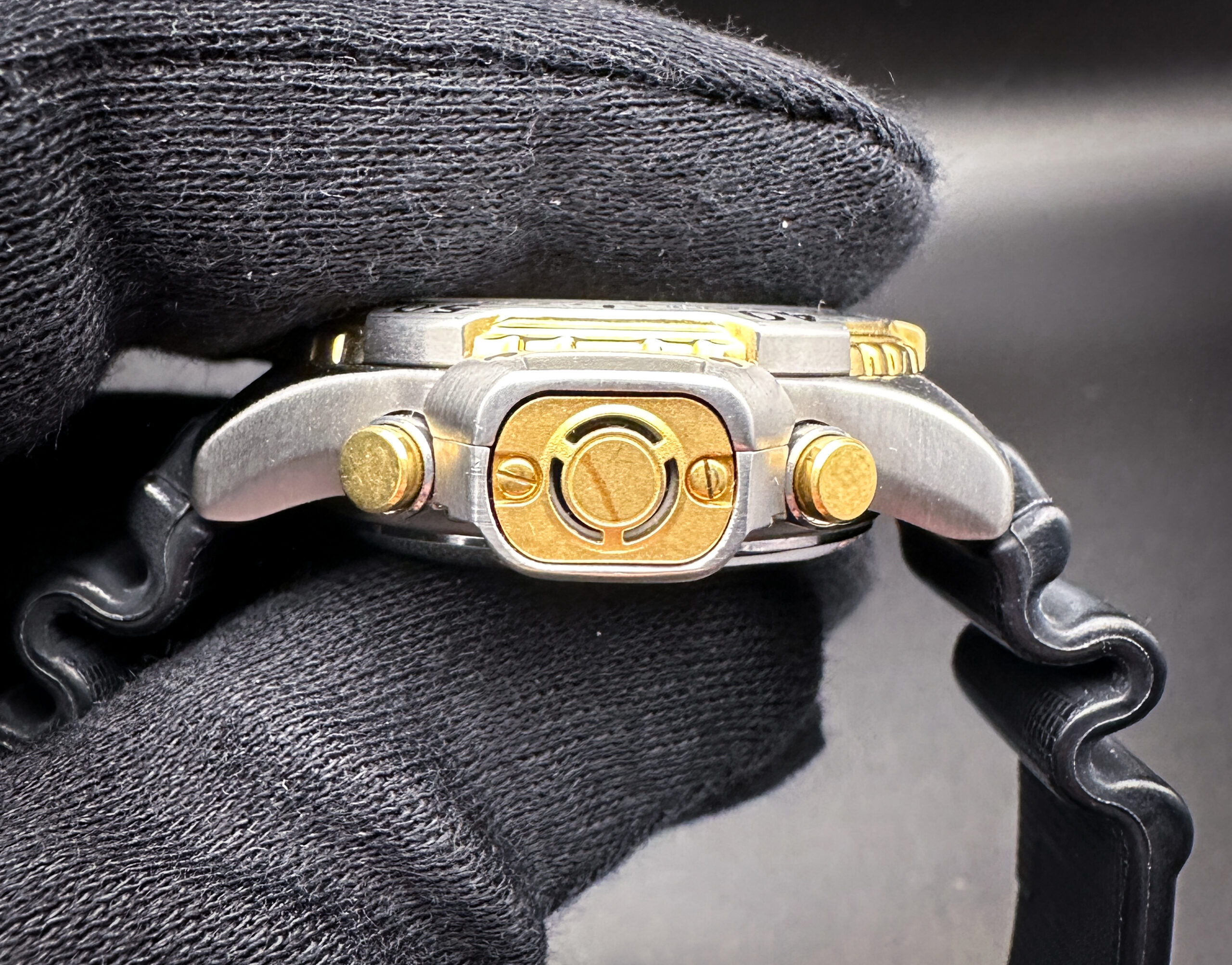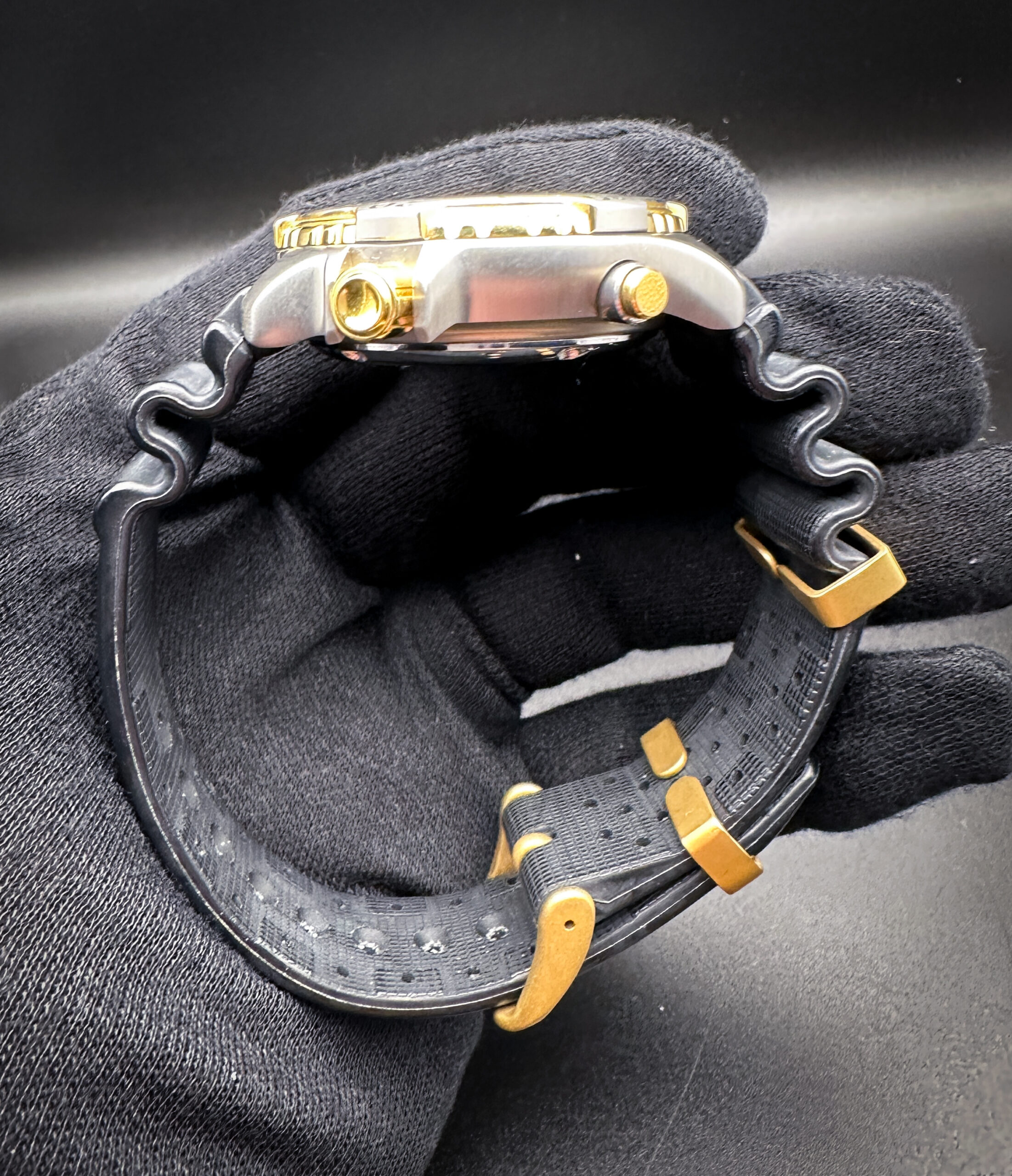 The Citizen 5864-F80103TA is a rare, vintage Promaster Aqualand diver’s watch, from the 1990s, with a stainless steel case, 200m water resistance, and a black NATO strap. Key features include a quartz movement, an analog display, a unidirectional rotating bezel with a silver and gold color scheme, a screw-down case back and crown, and a luminous dial for visibility underwater. This model is a durable and functional tool for diving and everyday wear.