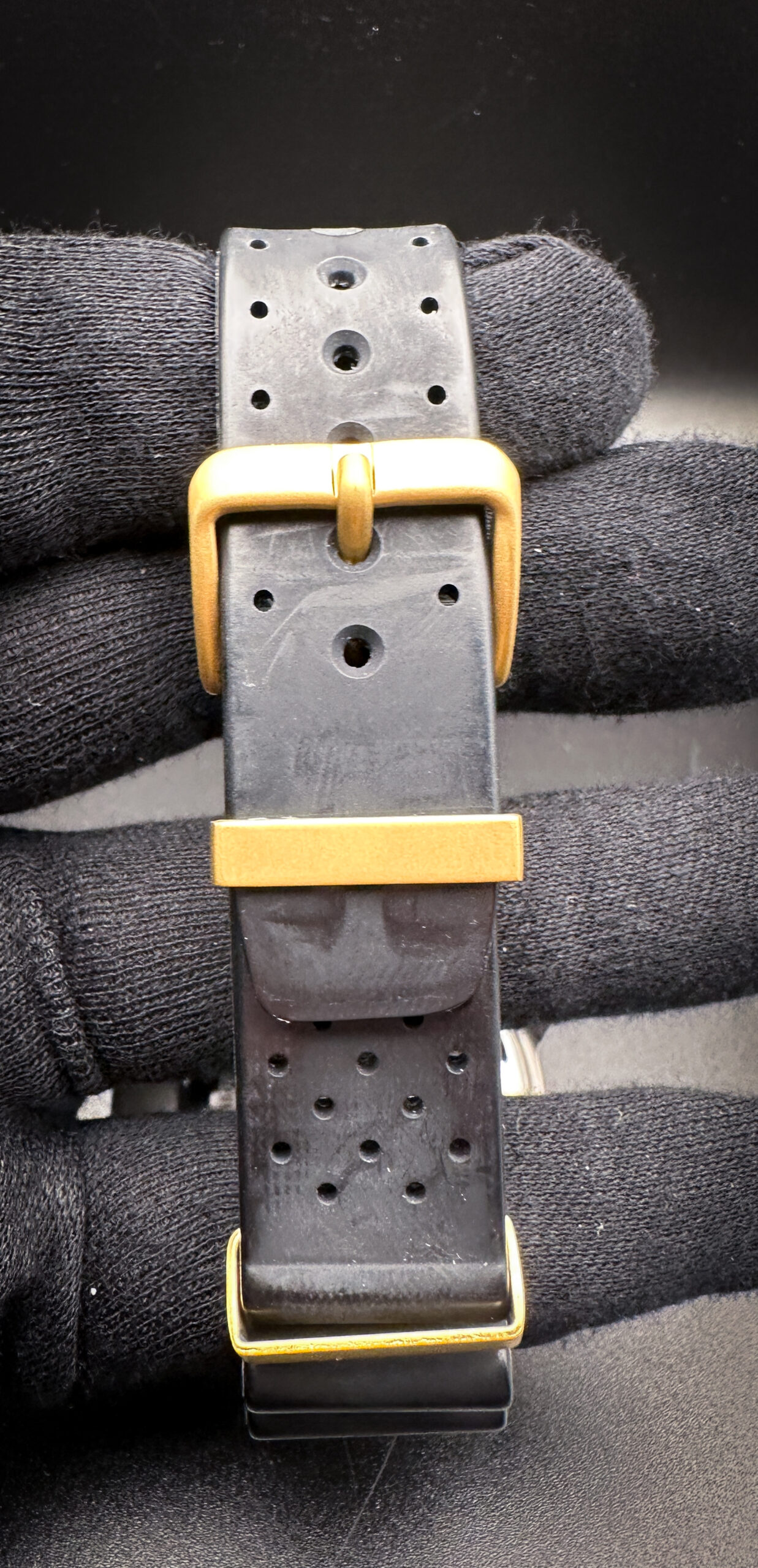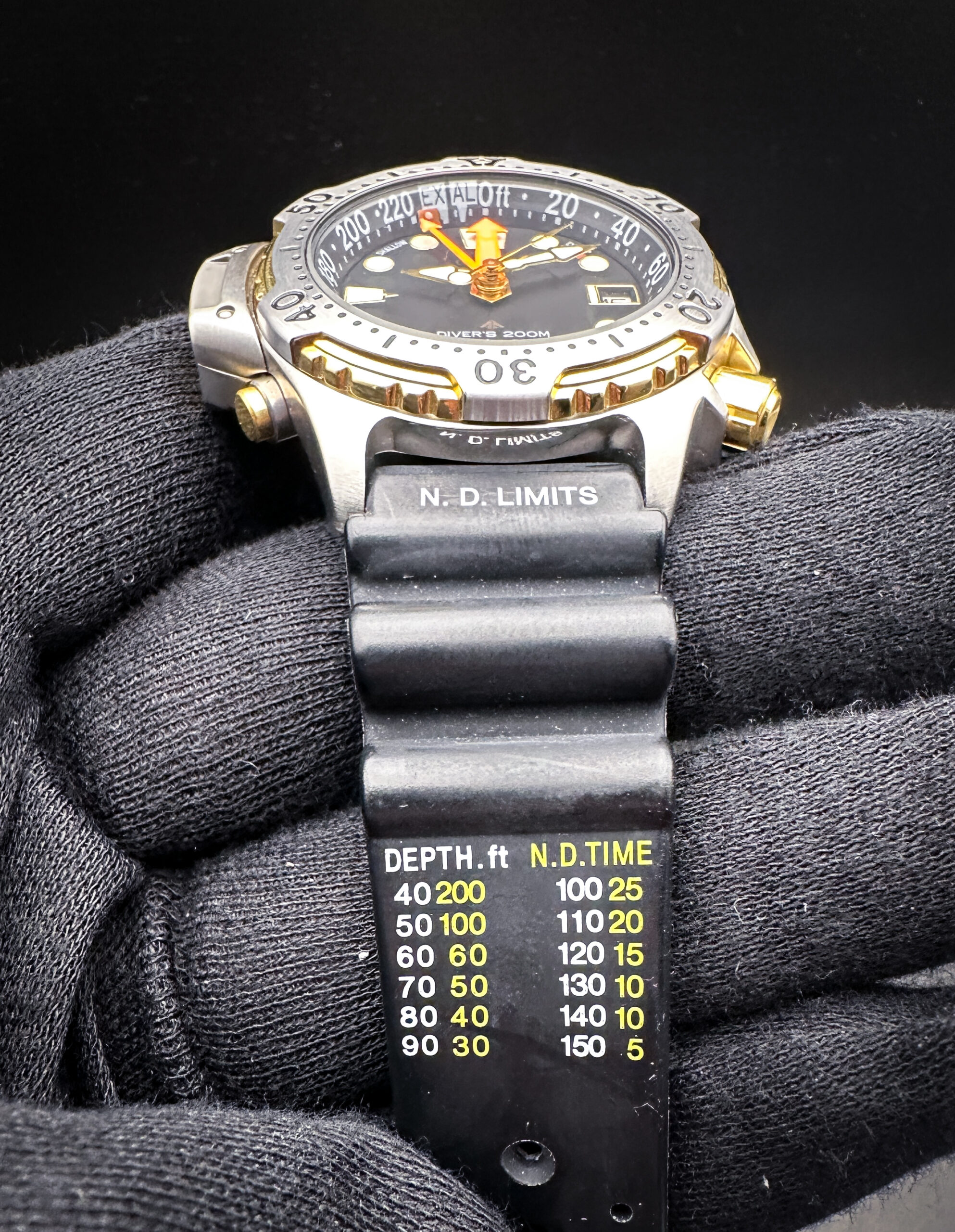 Vintage 1990’s Citizen Promaster Aqualand Diver 5864-F80103 TA in a 38mm stainless steel case. This Citizen has a new battery installed in October 2025 and has been tested in excellent working order. Includes a new Wrist Wraith watch roll and TLC Warranty/Authentication. This Citizen is paired with a with the original rubber two-piece strap with Depth and N.D. Limits markings