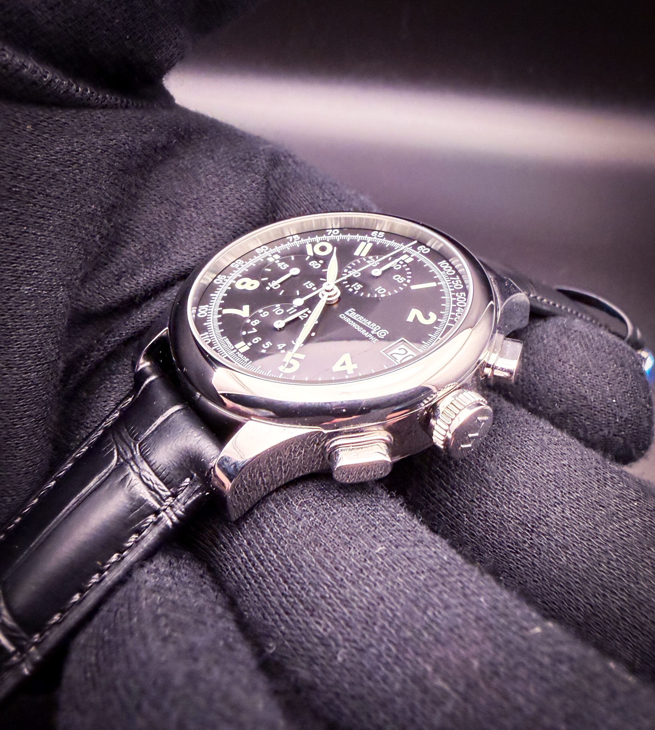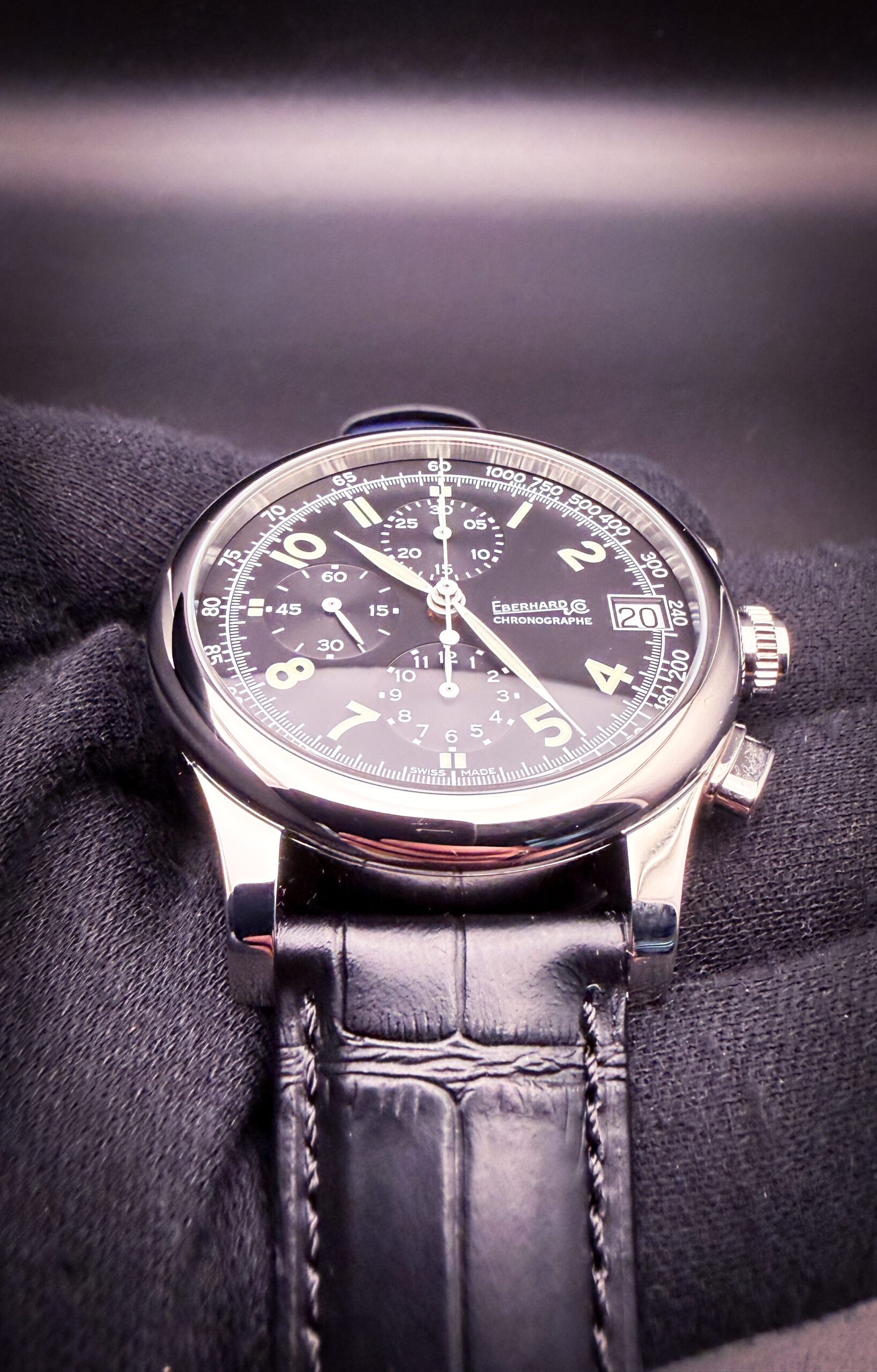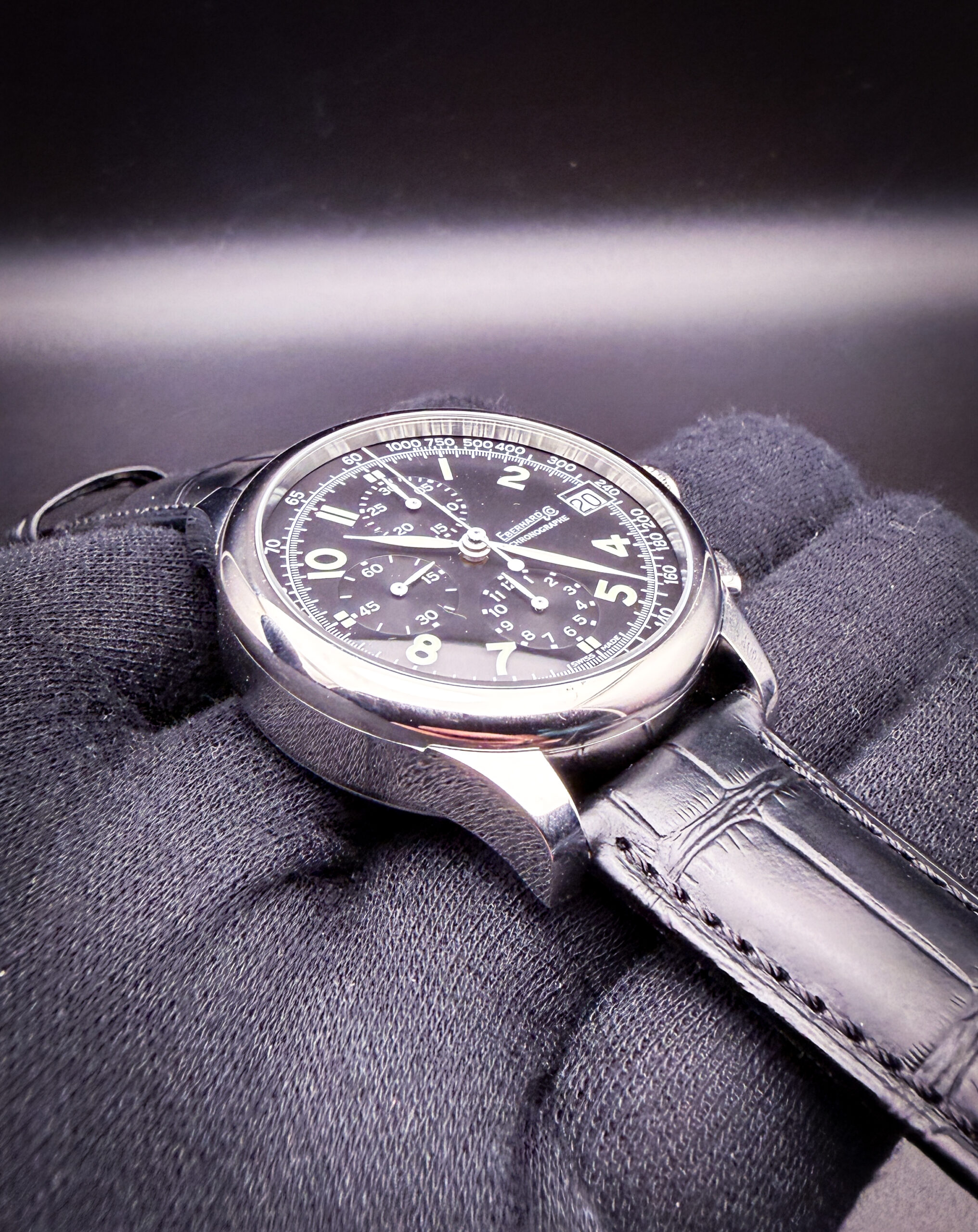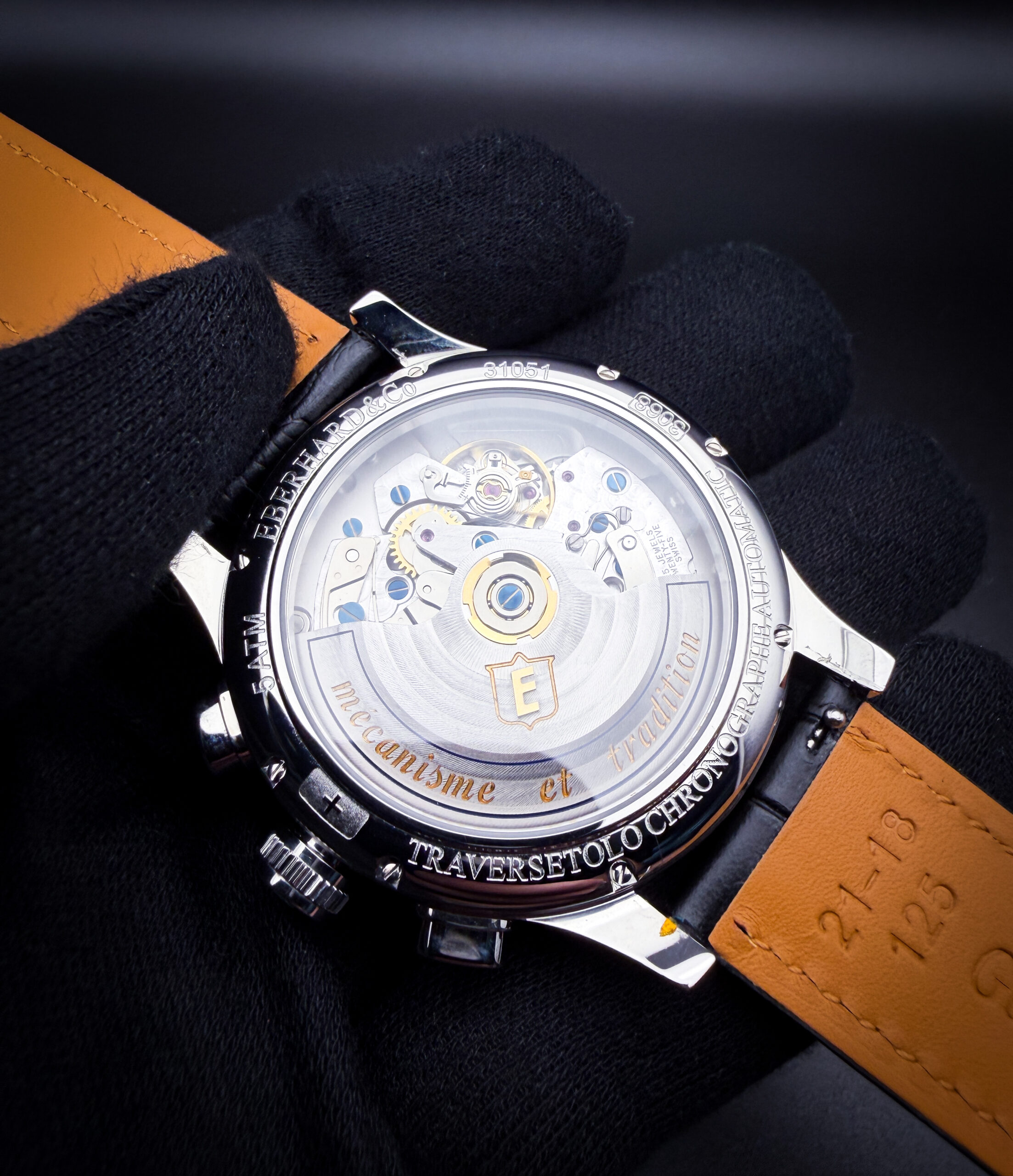 New Eberhard & Co. Traversetolo Chronograph 3105.1 in a 43mm stainless steel case, featuring the ETA A07.211 automatic movement. This Eberhard includes: Outer Box, Leather Case, Eberhard Stainless Steel Bracelet, and Guarantee booklet with cards.