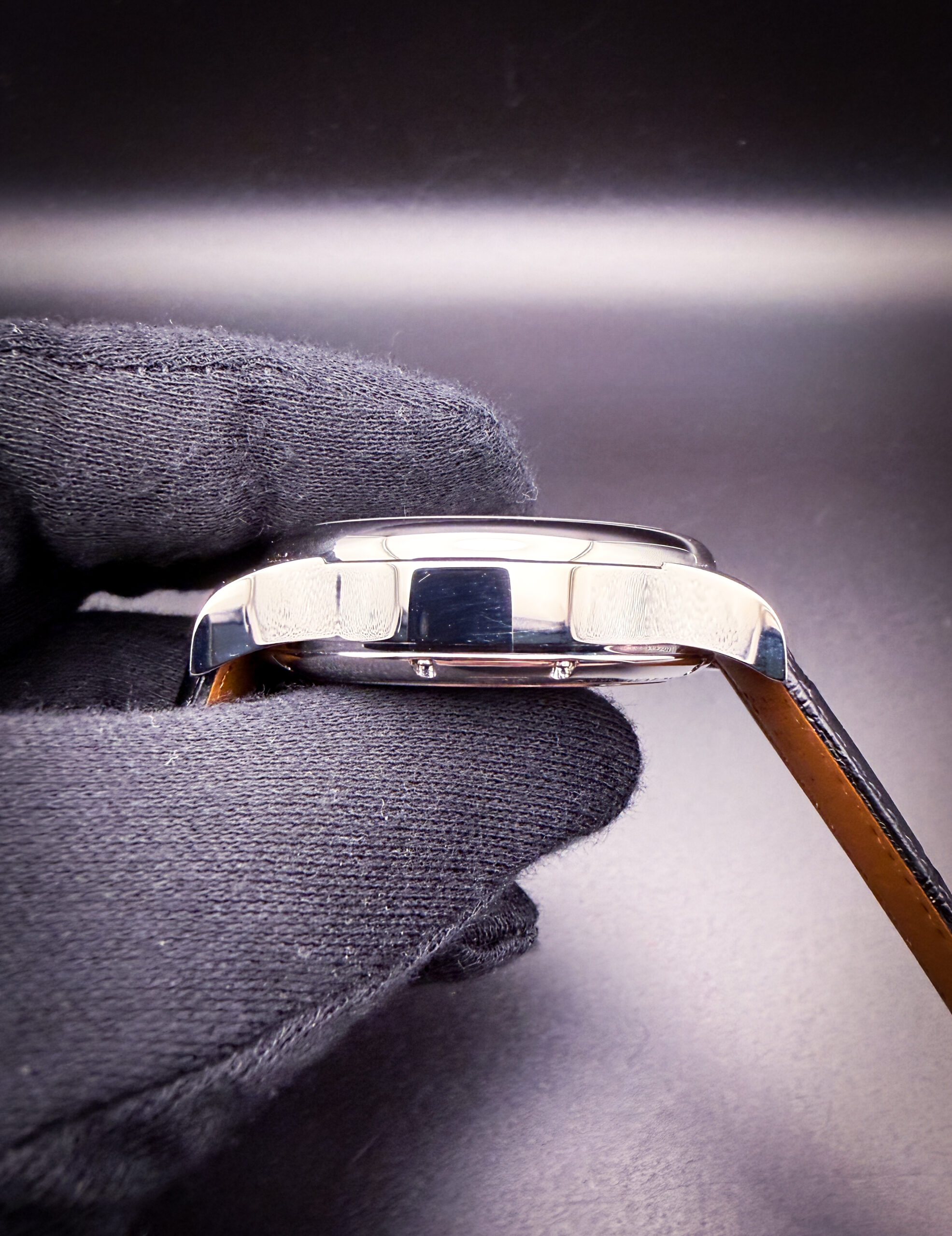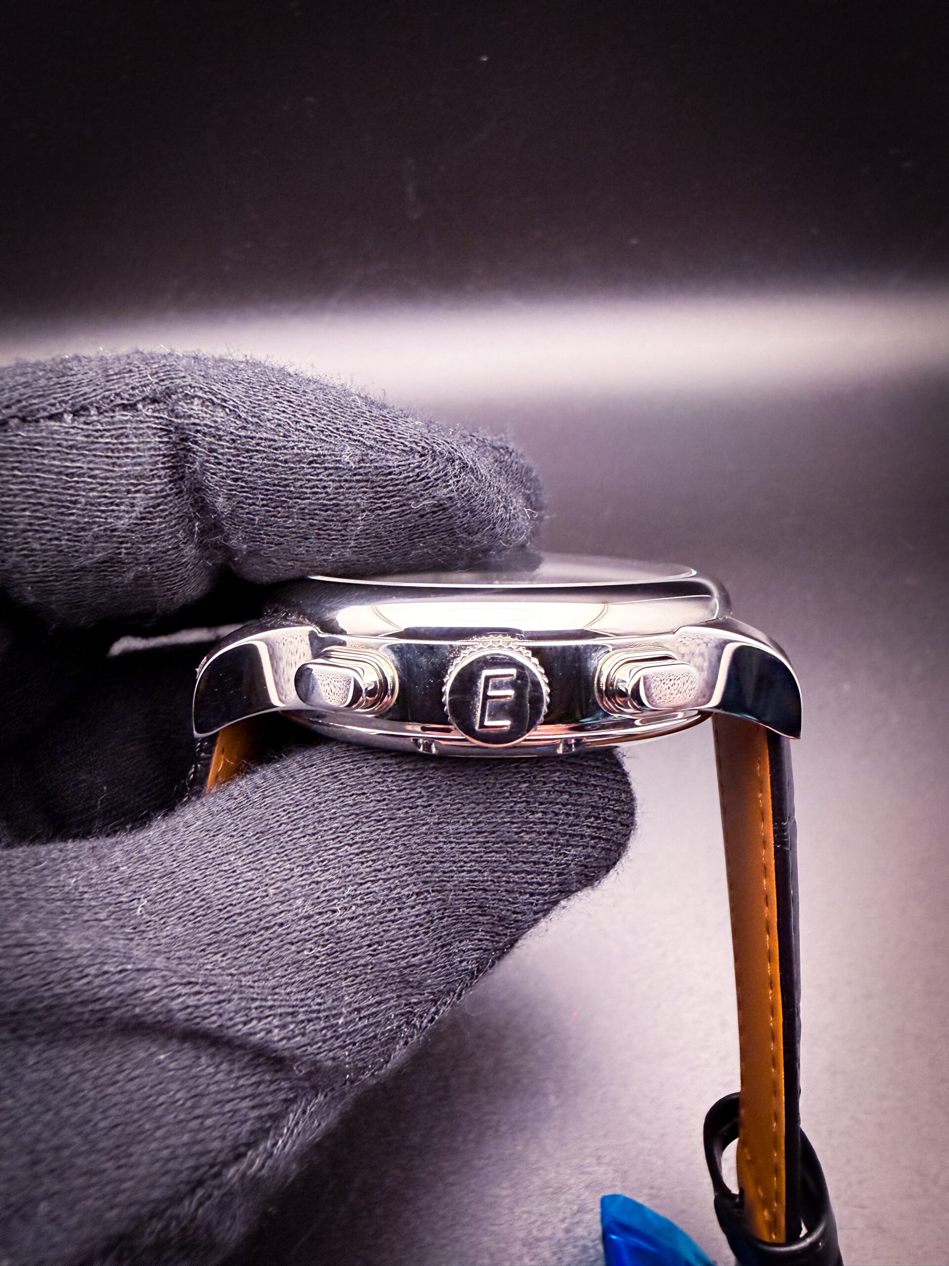 Chrono Traversetolo is a mechanical chronograph with automatic winding characterized by a very finely machined movement that is revealed through the transparent caseback in sapphire glass. The rotor deserves particular attention: it is entirely decorated with “Côtes de Genève” embellishments, circular, and it is elegantly personalized with a shield – the old symbol of the Maison – that depicts the letter “E” in 18 ct. gold. Chrono Traversetolo comes in steel; it has a large-sized case (Ø 43 mm.) and it features special push-buttons for the chronographic functions with a particular, curved shape.