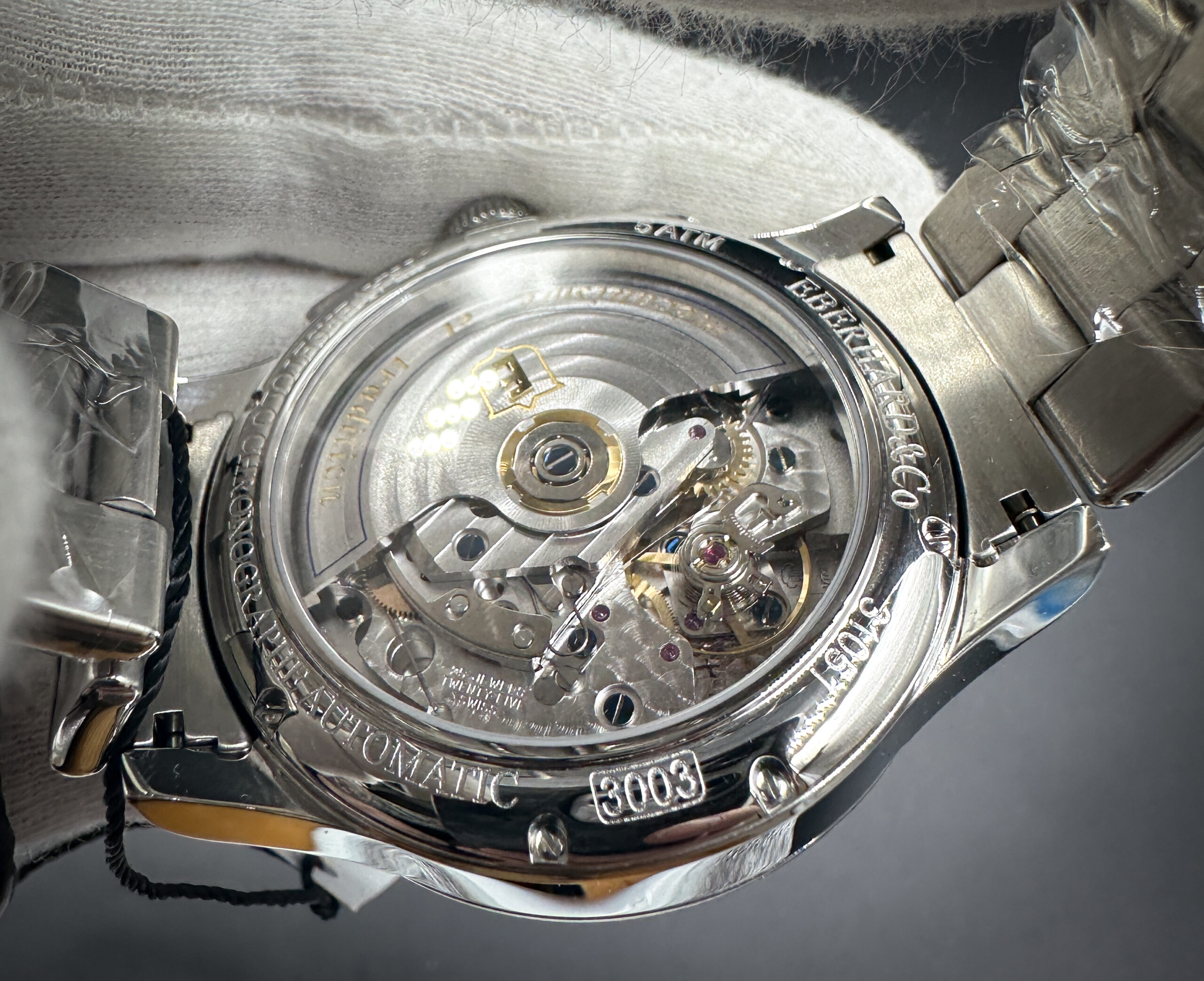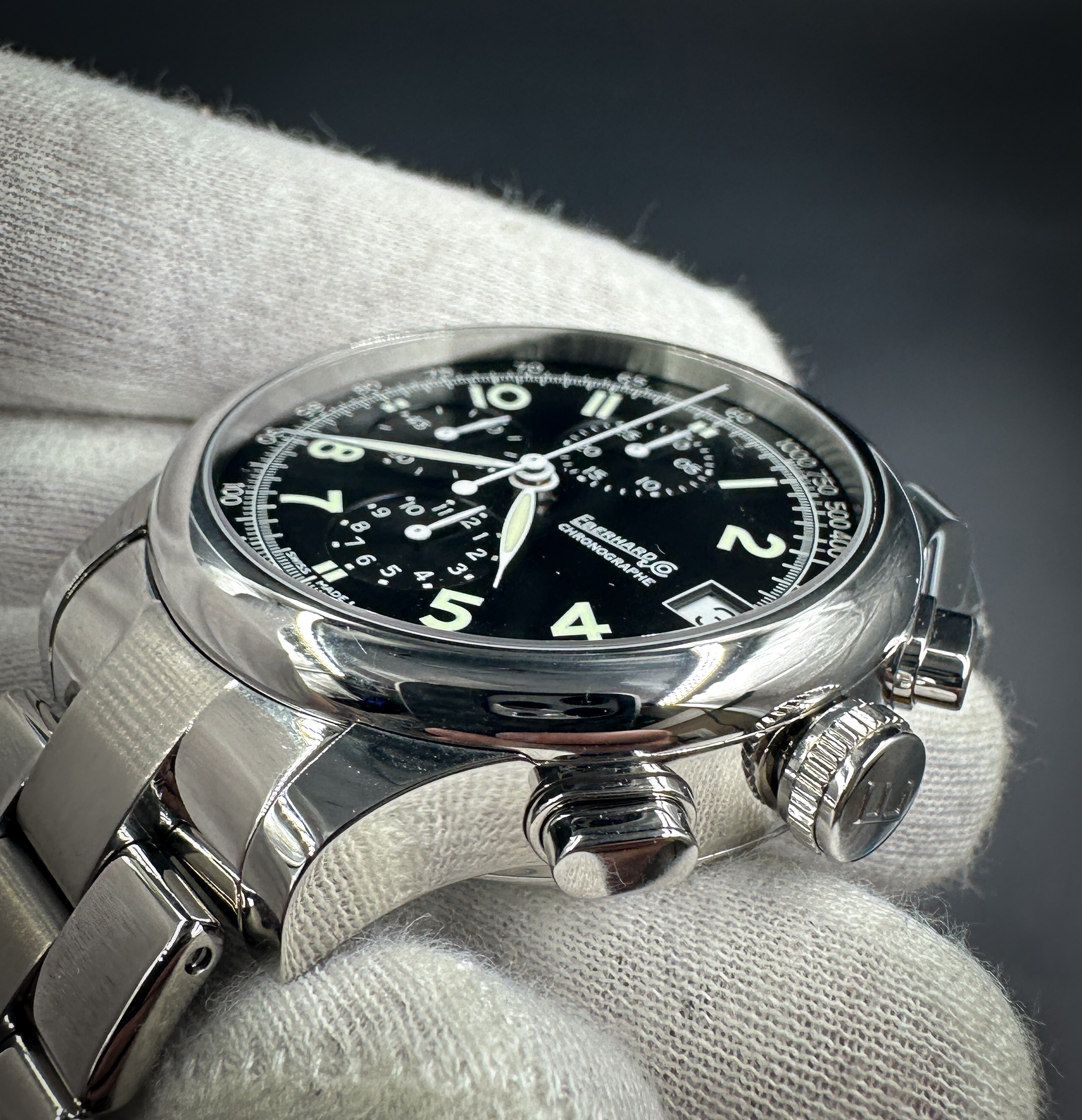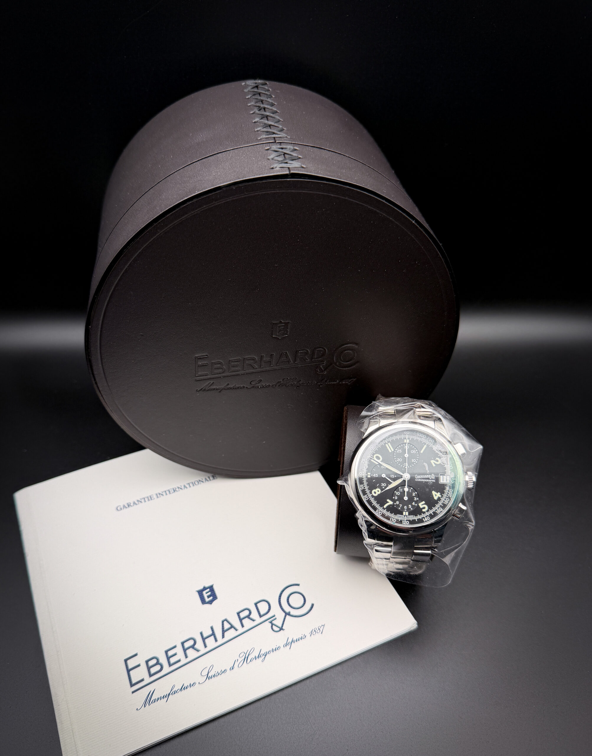 New Eberhard & Co. Traversetolo Chronograph 3105.1 in a 43mm stainless steel case, featuring the ETA A07.211 automatic movement. This E&Co. includes: Leather Case, insert, and Guarantee booklet with cards.