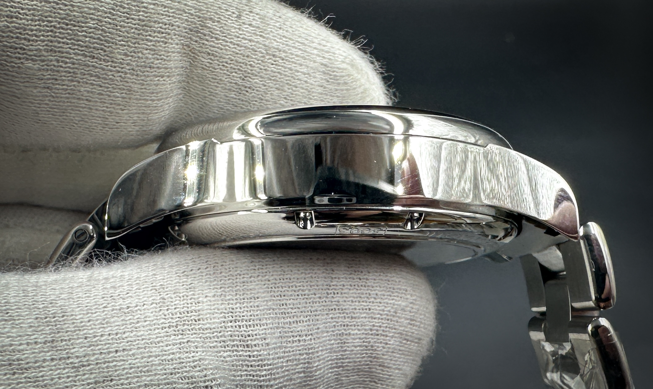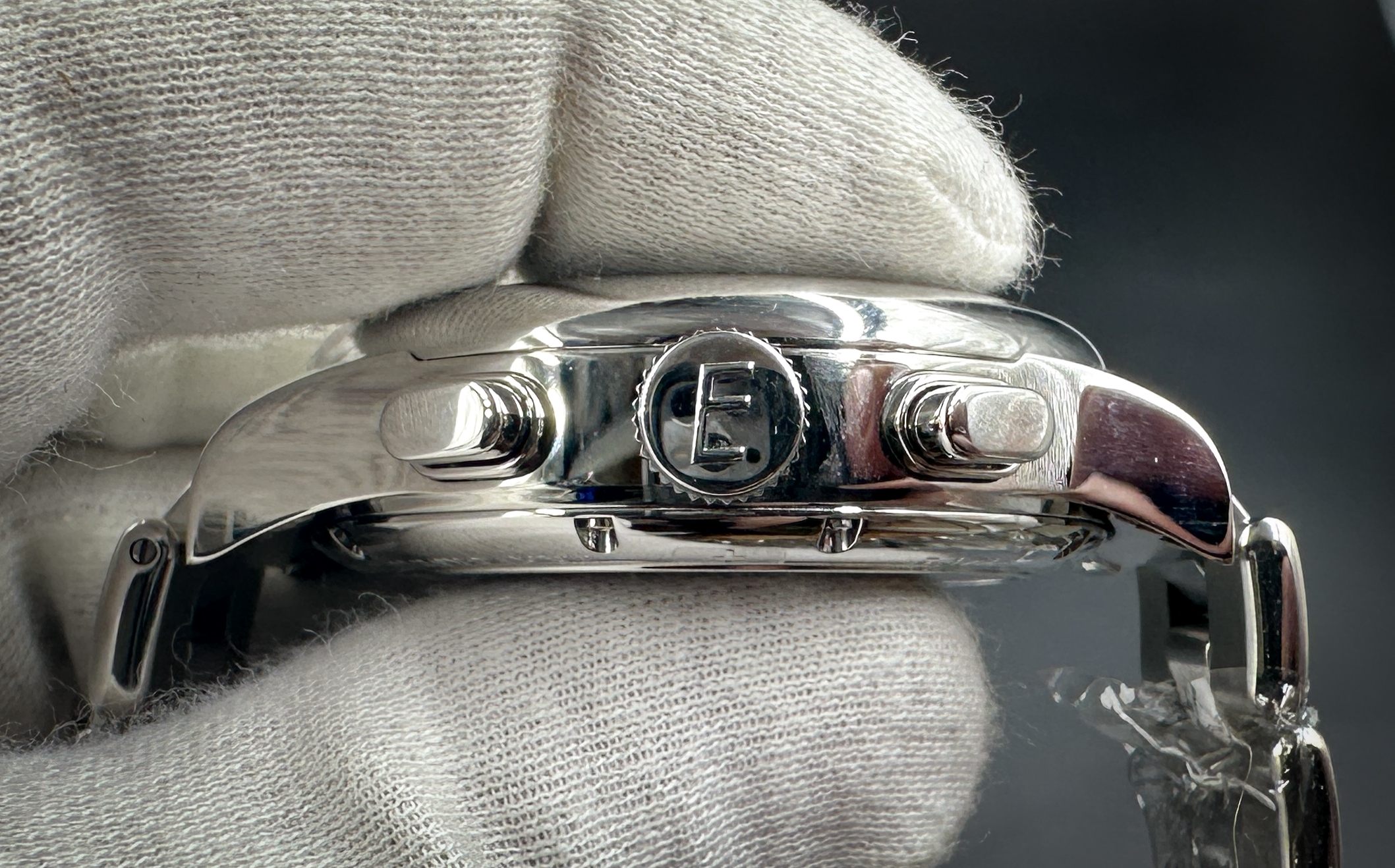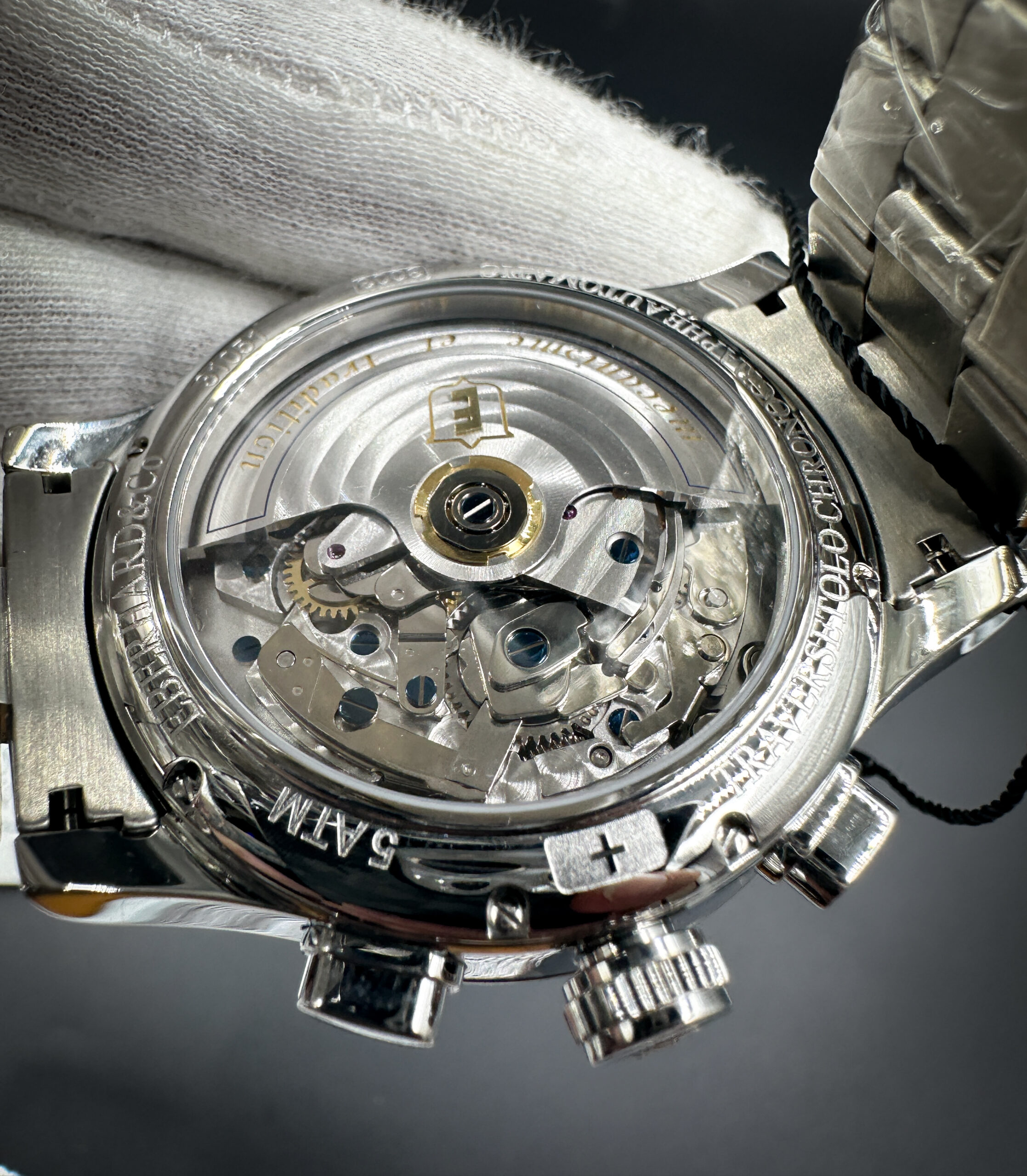 Chrono Traversetolo is a mechanical chronograph with automatic winding characterized by a very finely machined movement that is revealed through the transparent caseback in sapphire glass. The rotor deserves particular attention: it is entirely decorated with “Côtes de Genève” embellishments, circular, and it is elegantly personalized with a shield – the old symbol of the Maison – that depicts the letter “E” in 18 ct. gold. Chrono Traversetolo comes in steel; it has a large-sized case (Ø 43 mm.) and it features special push-buttons for the chronographic functions with a particular, curved shape.