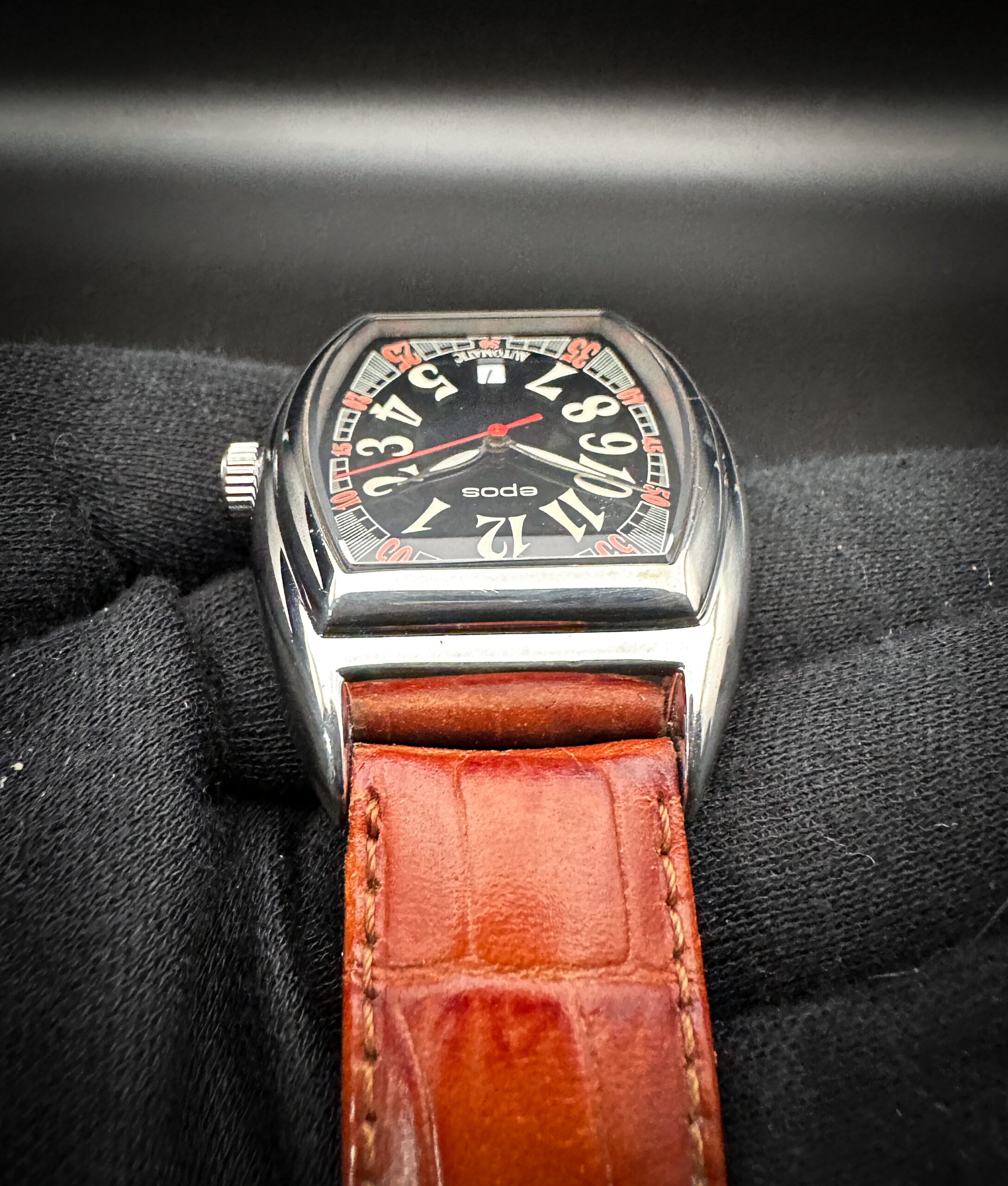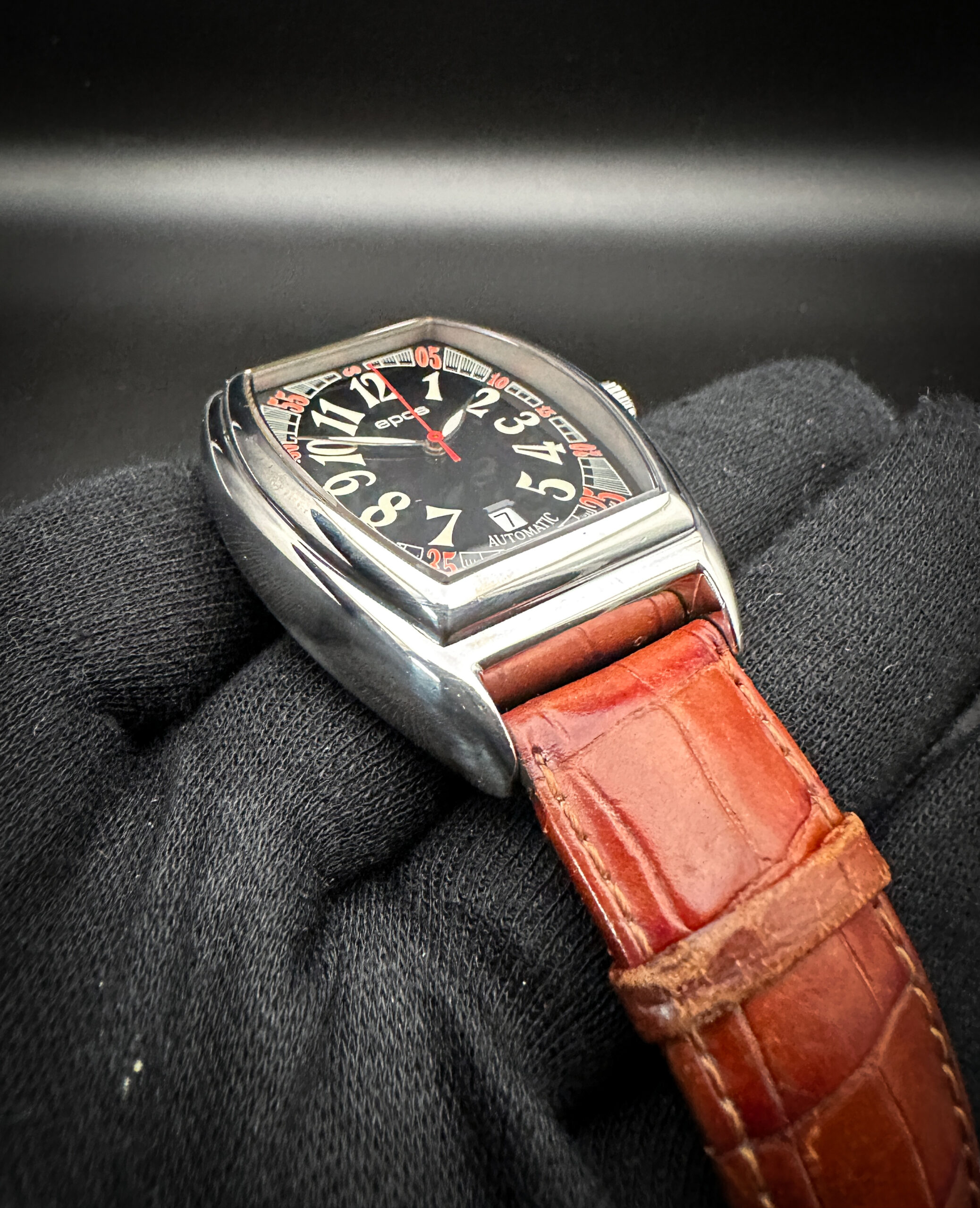 Epos Elegance Tonneau 3332 in a 36 x 51mm stainless steel case, featuring the ETA 2824-2 automatic movement. This Epos includes the original box, booklet with warranty card, and hang-tag.