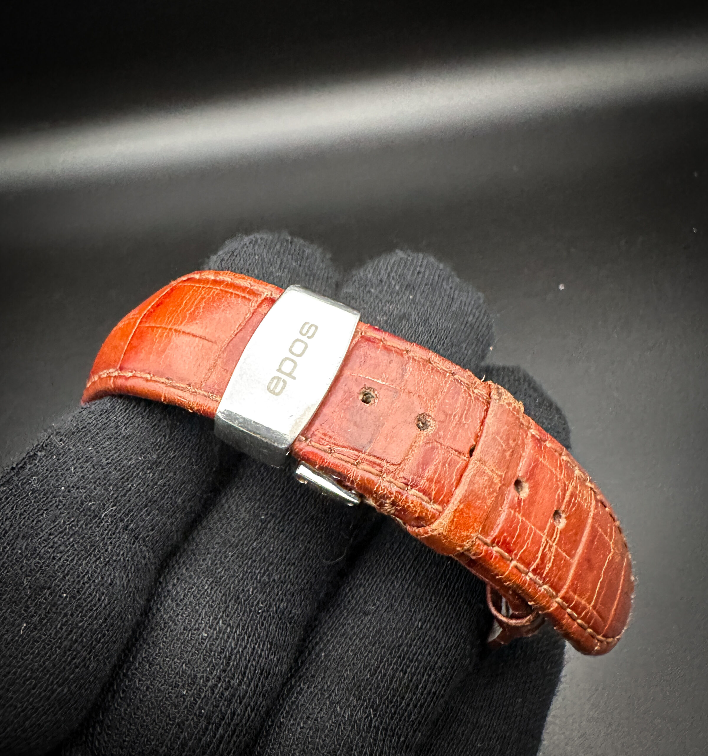 This Epos is paired with the original brown leather strap with the Epos double-fold clasp. The strap is in good condition with light wear and light stains on the underside.