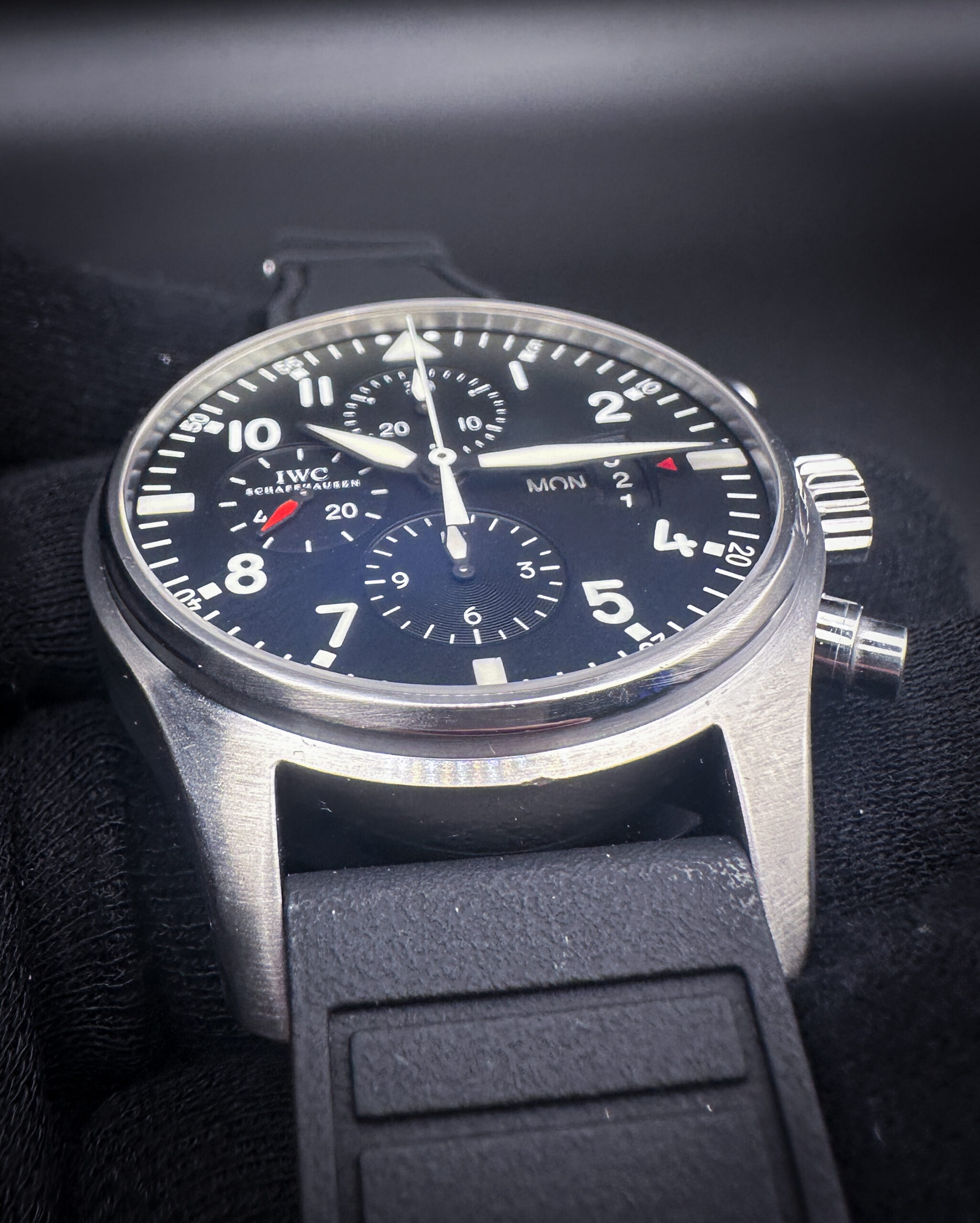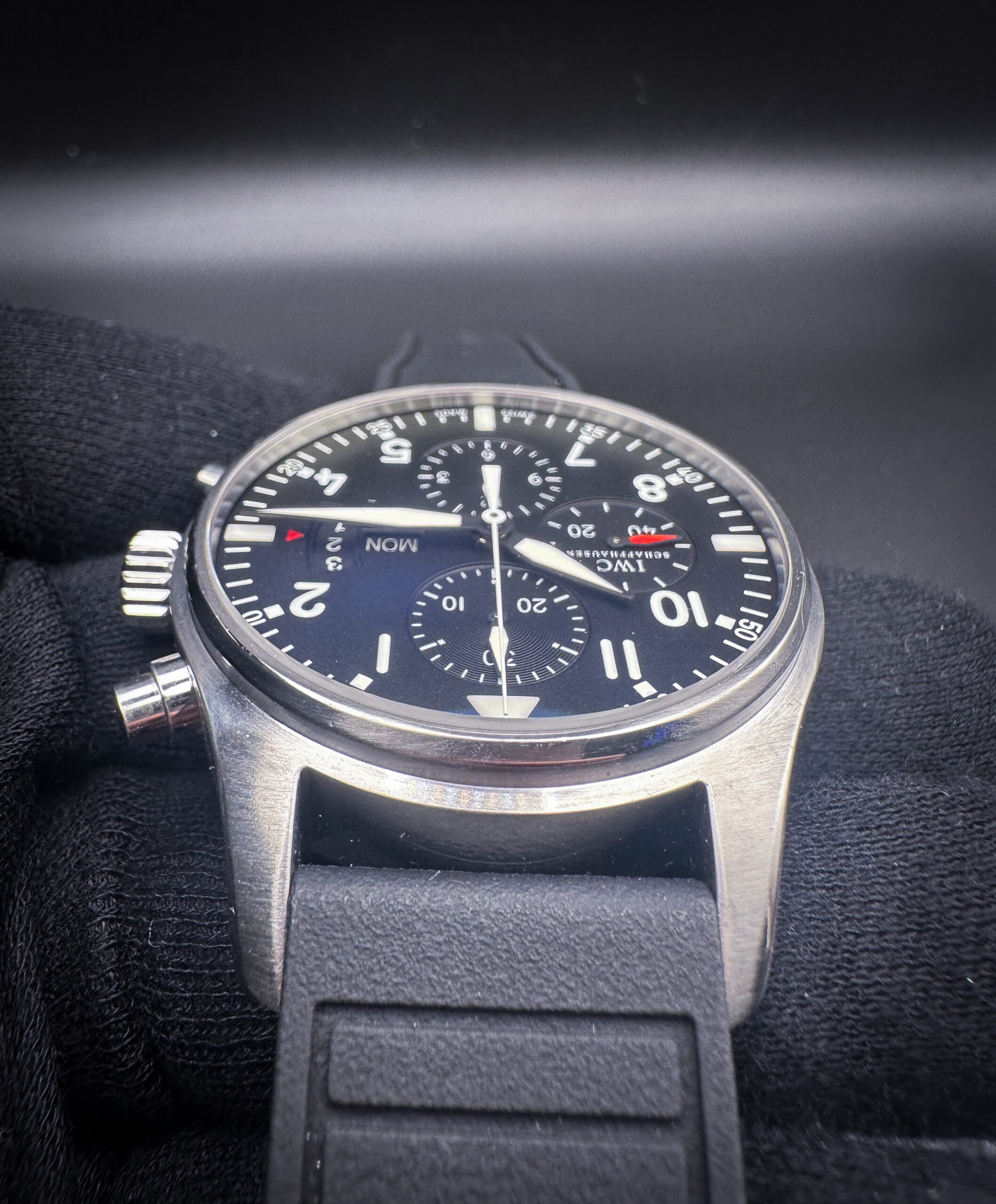 IWC Pilot Watch Chronograph IW377701 in a 43mm stainless steel case, powered by the IWC caliber 79320. This IWC has been tested in excellent working condition and is ready for wear or to be added to a collection.