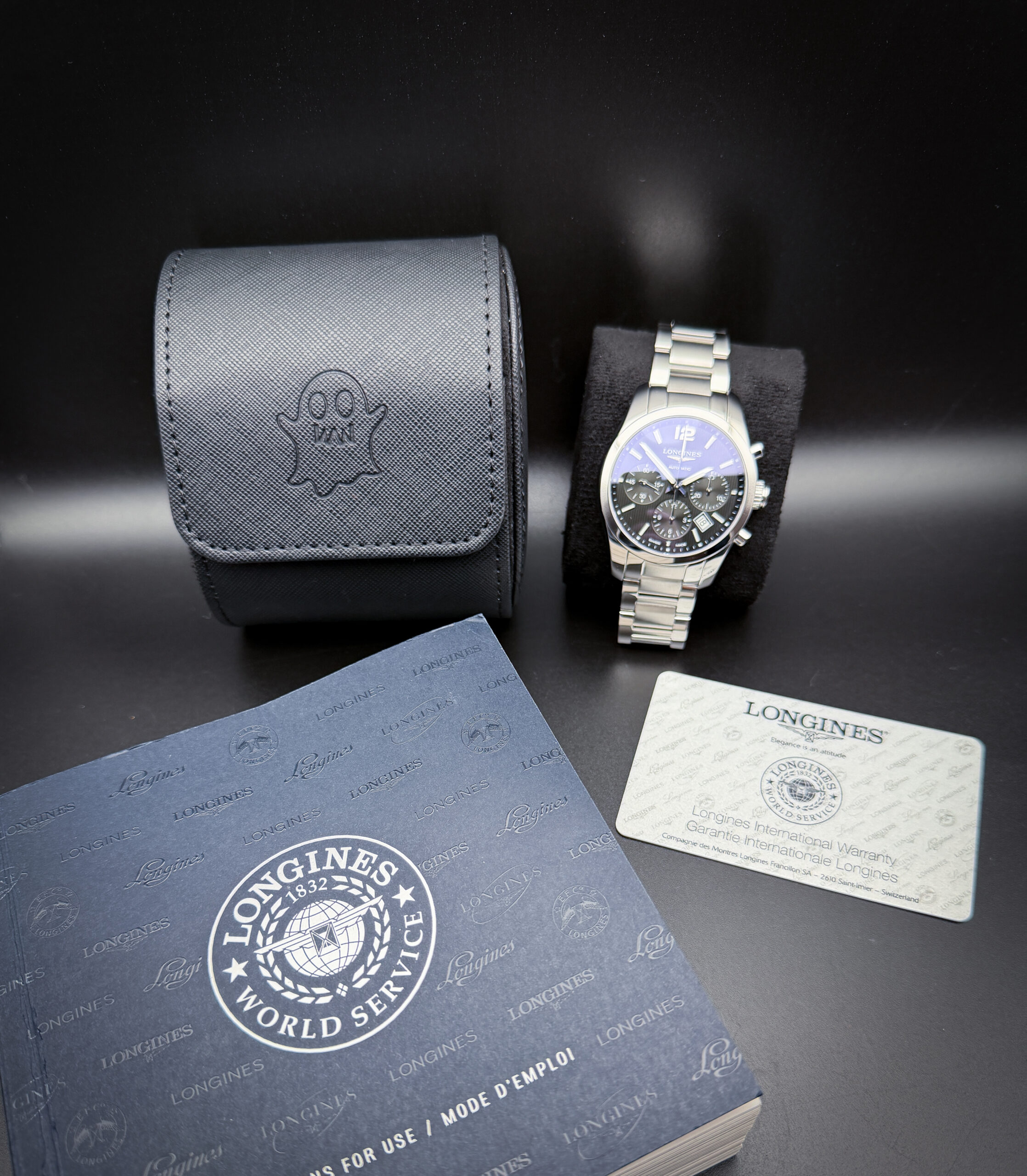 This Longines includes a new Wrist Wraith travel case; original warranty card; instruction book; and original purchase receipt.