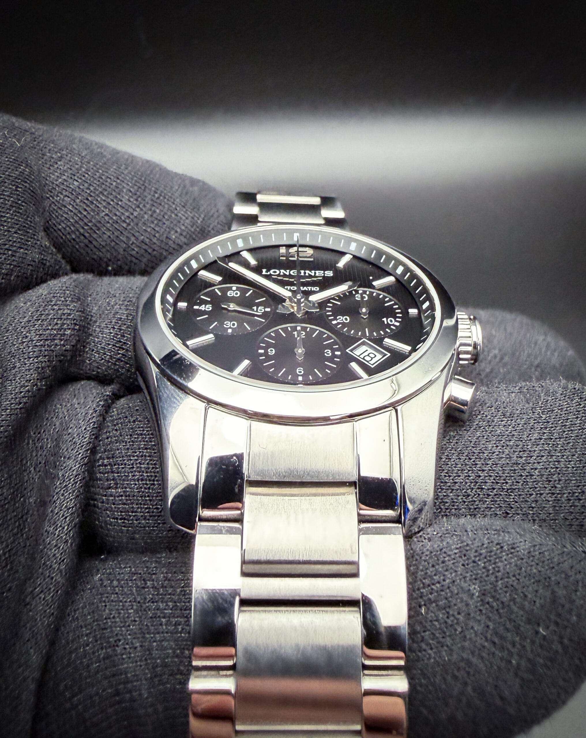 Offered here is the Longines Conquest Classic Cronograph L2.786.4 in its striking black dial configuration, featuring polished silver hands and applied Arabic numerals for sharp contrast and excellent legibility. The polished stainless steel case measures approximately 41mm and presents with the timeless proportions that define the Master Collection line.