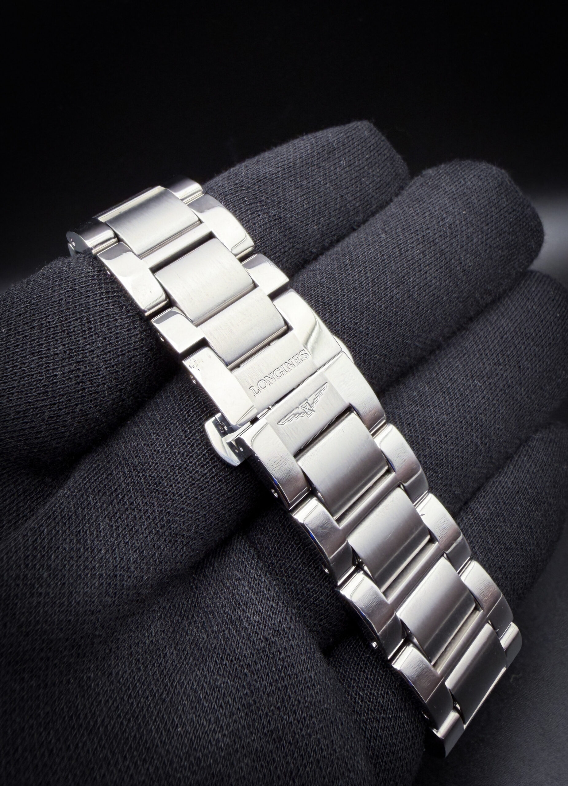 This Longines is paired with the original stainless steel bracelet. The bracelet has six (6) full and one (1) half removable link currently installed and will fit up to an 8.5 inch wrist.