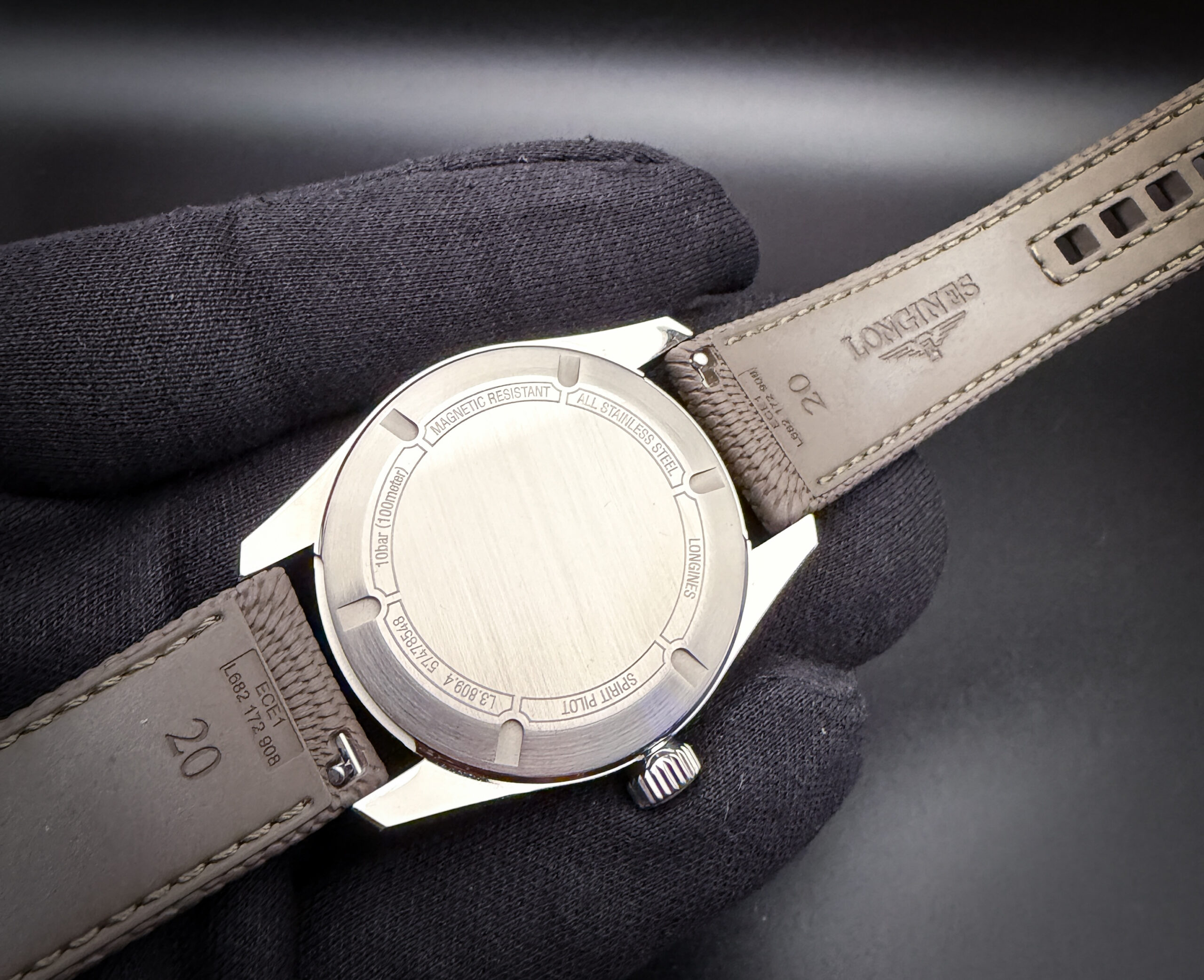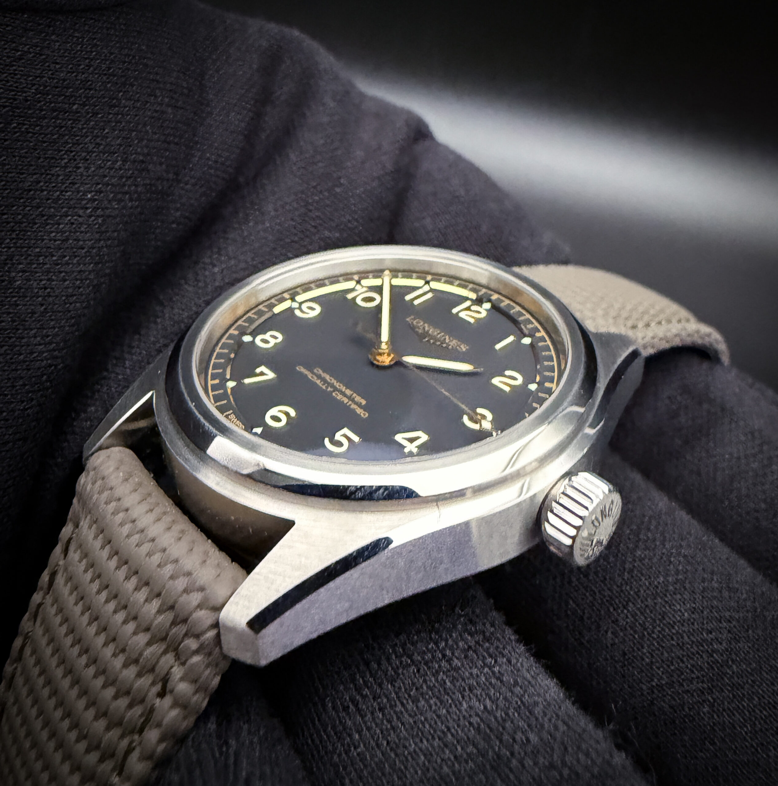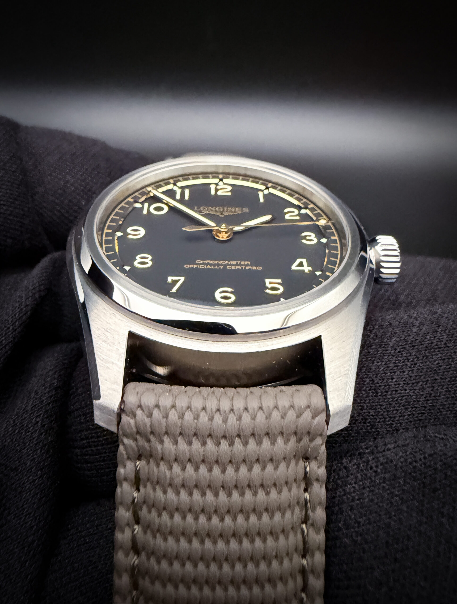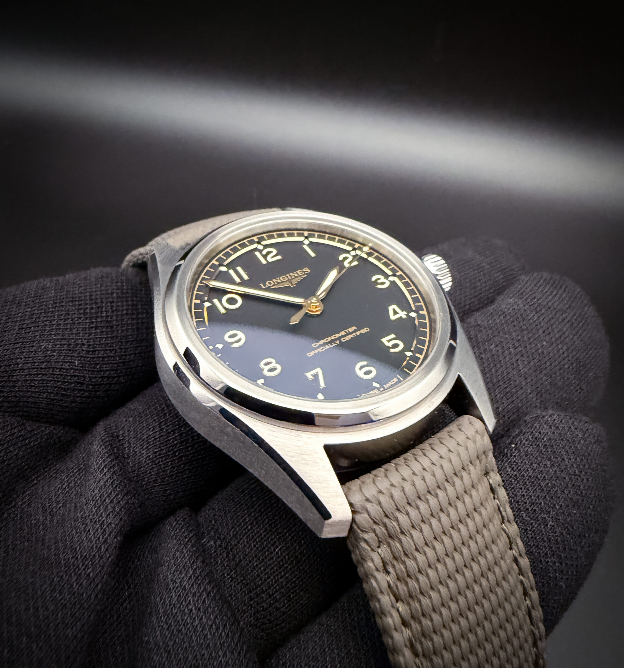 Offered here is the Longines Spirit Pilot L3.809.4.53.9, featuring a deep matte black dial with applied Arabic numerals and a warm gilt-tone minute track that gives the watch a subtle vintage aviation character. The stainless steel case measures 39mm and presents with a balanced, purposeful profile, paired here with the factory grey textile strap. The dial is signed “Chronometer Officially Certified,” and the luminous handset and numerals provide excellent legibility in all lighting conditions.