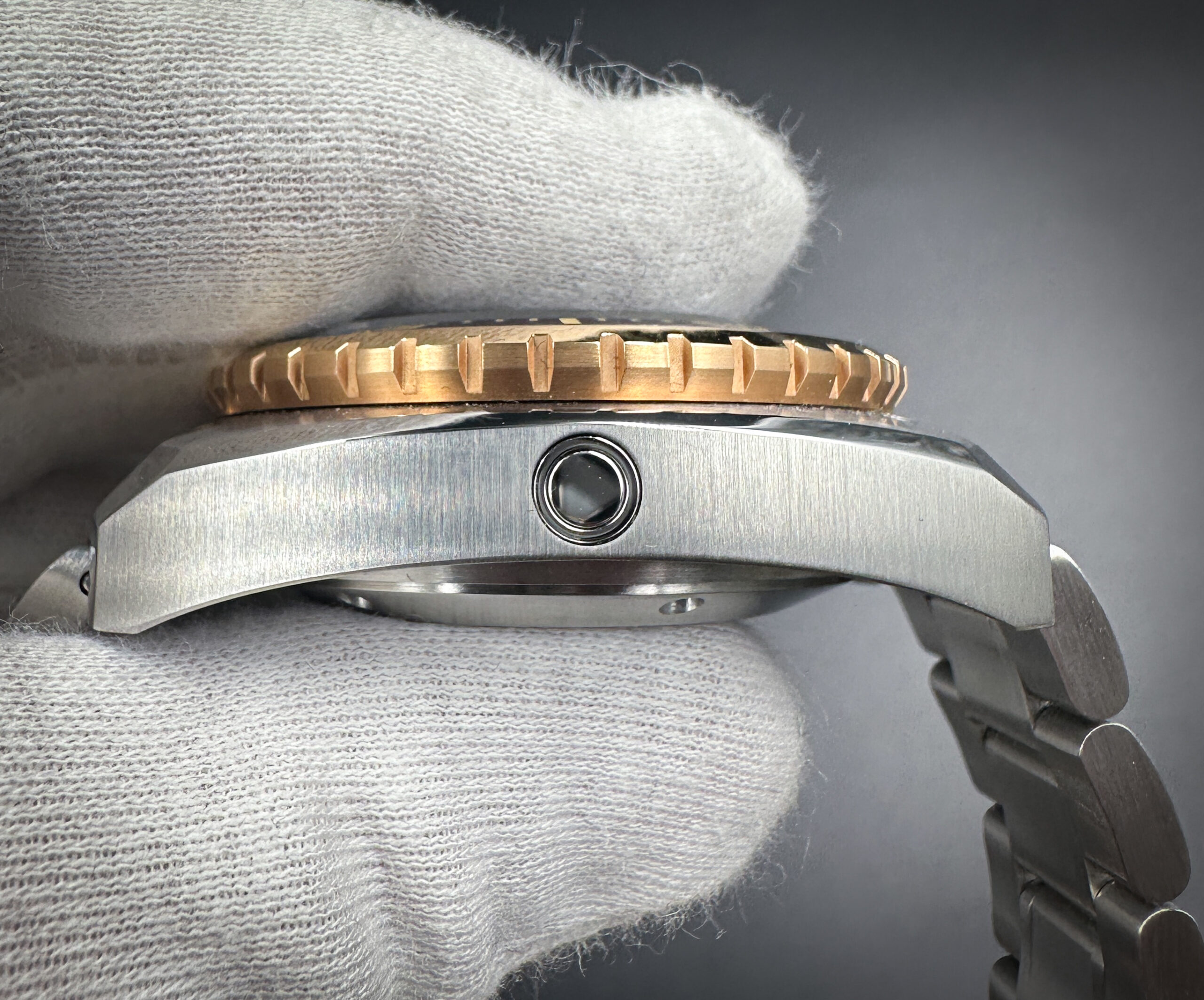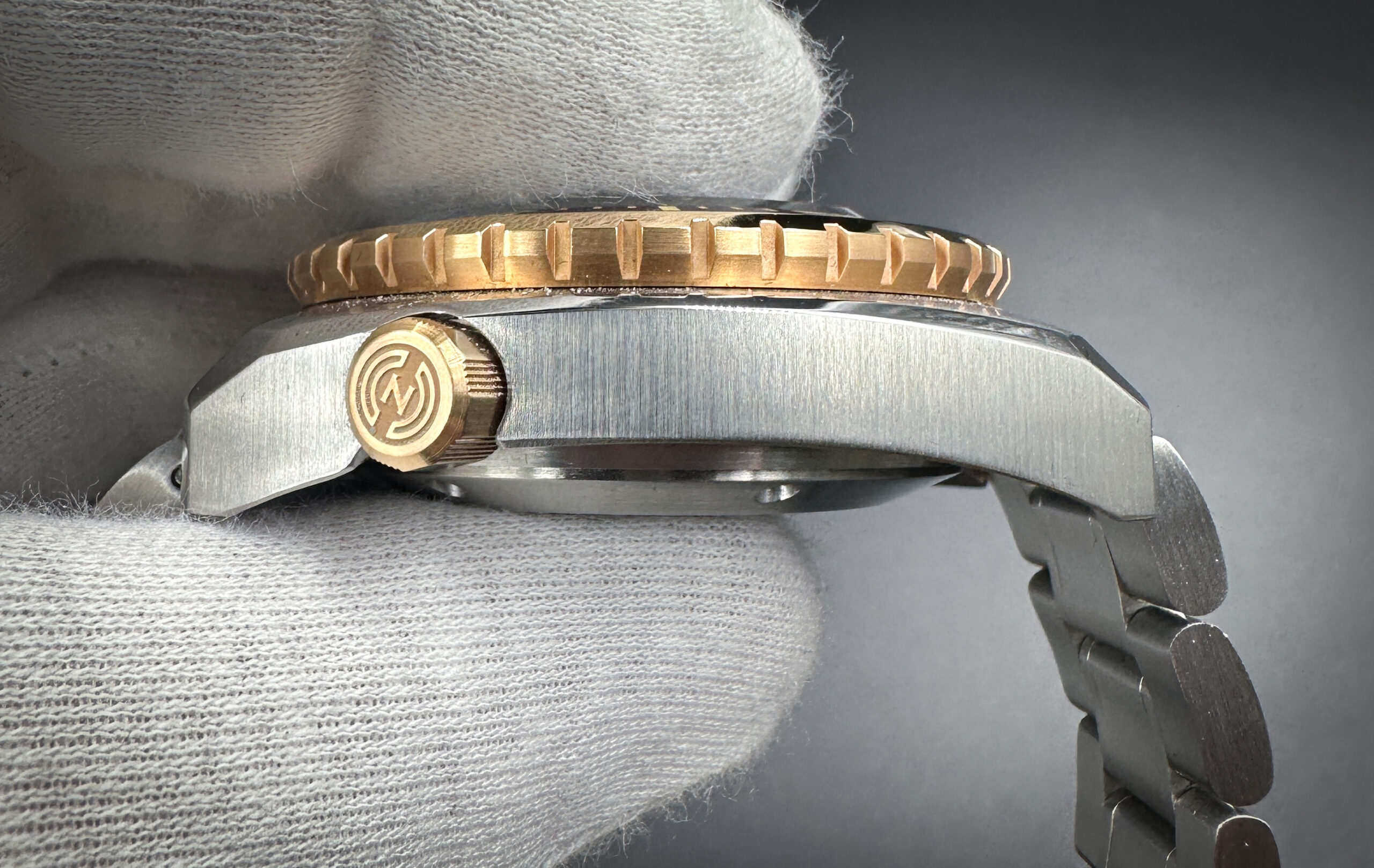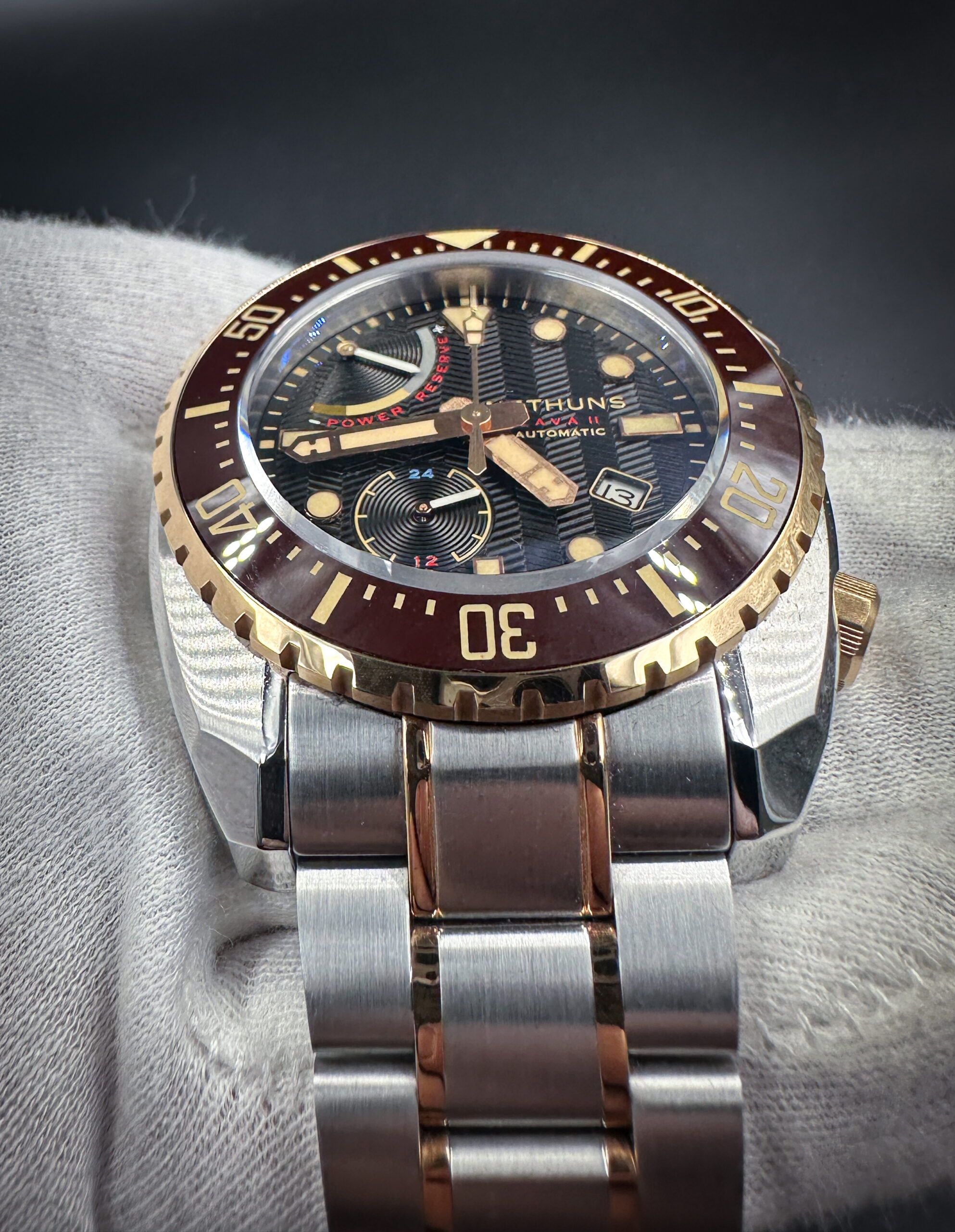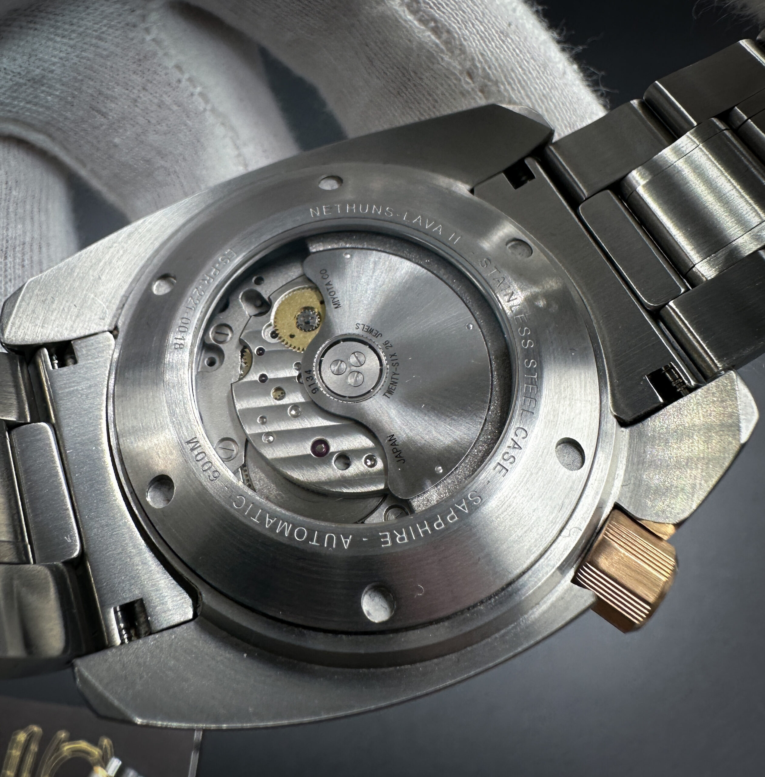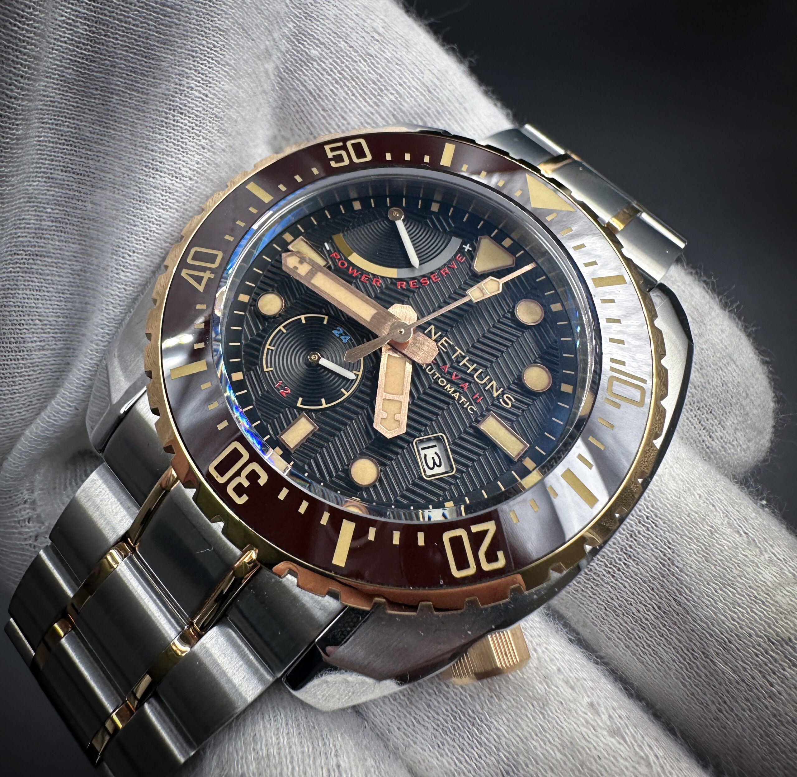 Nethuns Lava II Ref: LS212 in a 45mm stainless steel and bronze case, featuring the Miyota 9134 automatic movement, with Power Reserve display and 24 hour counter. This watch includes the outer box, inner, case, all bracelet links, and booklet with open warranty card.
