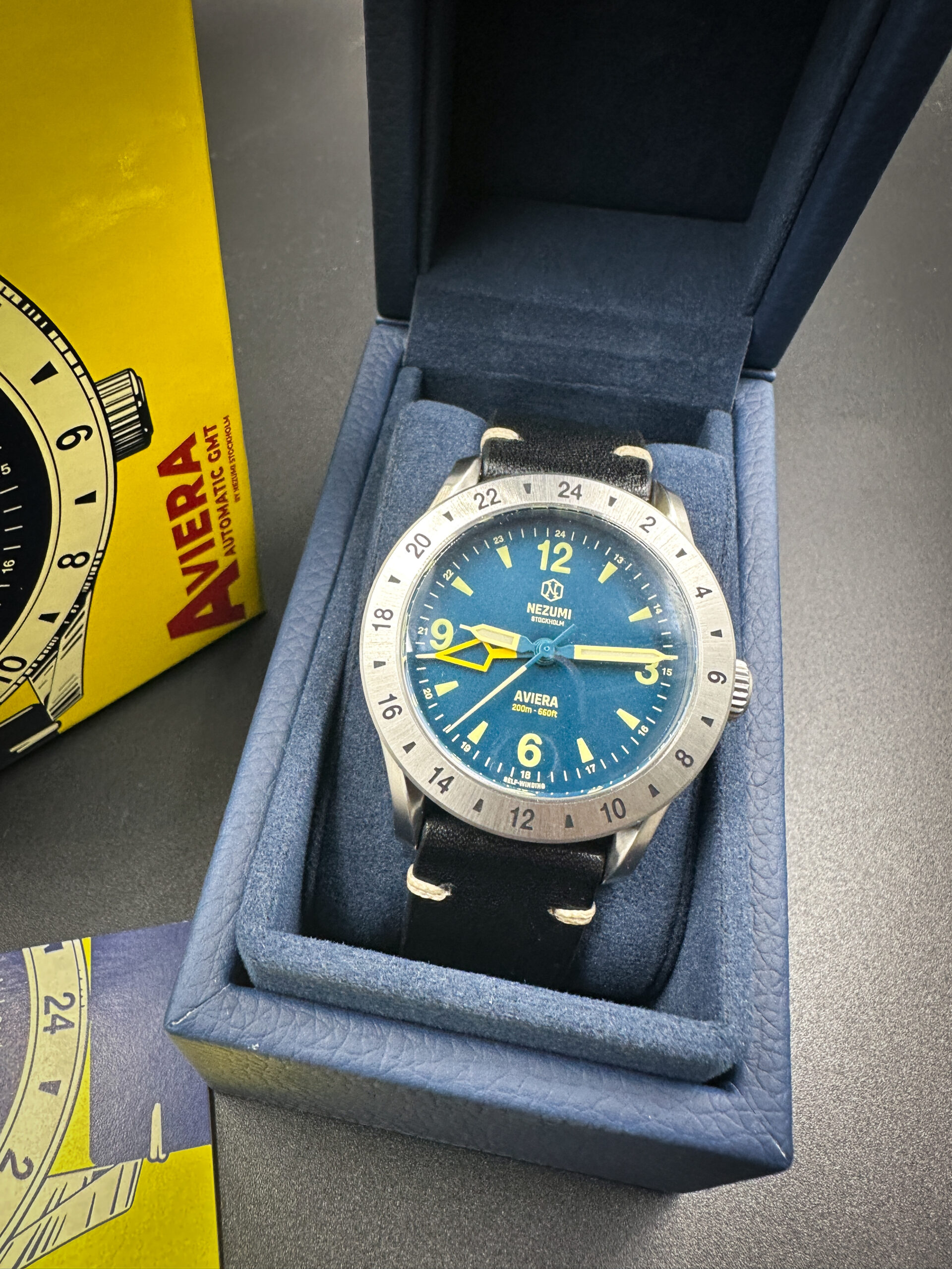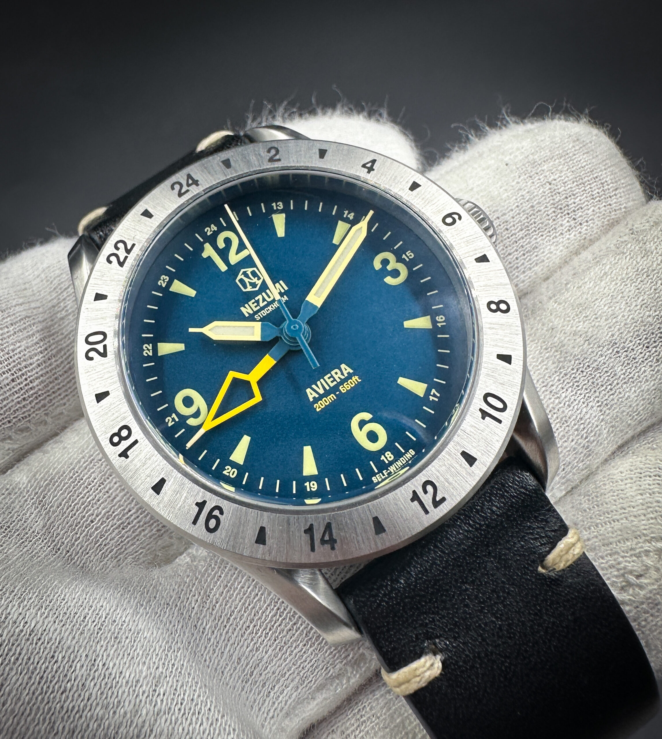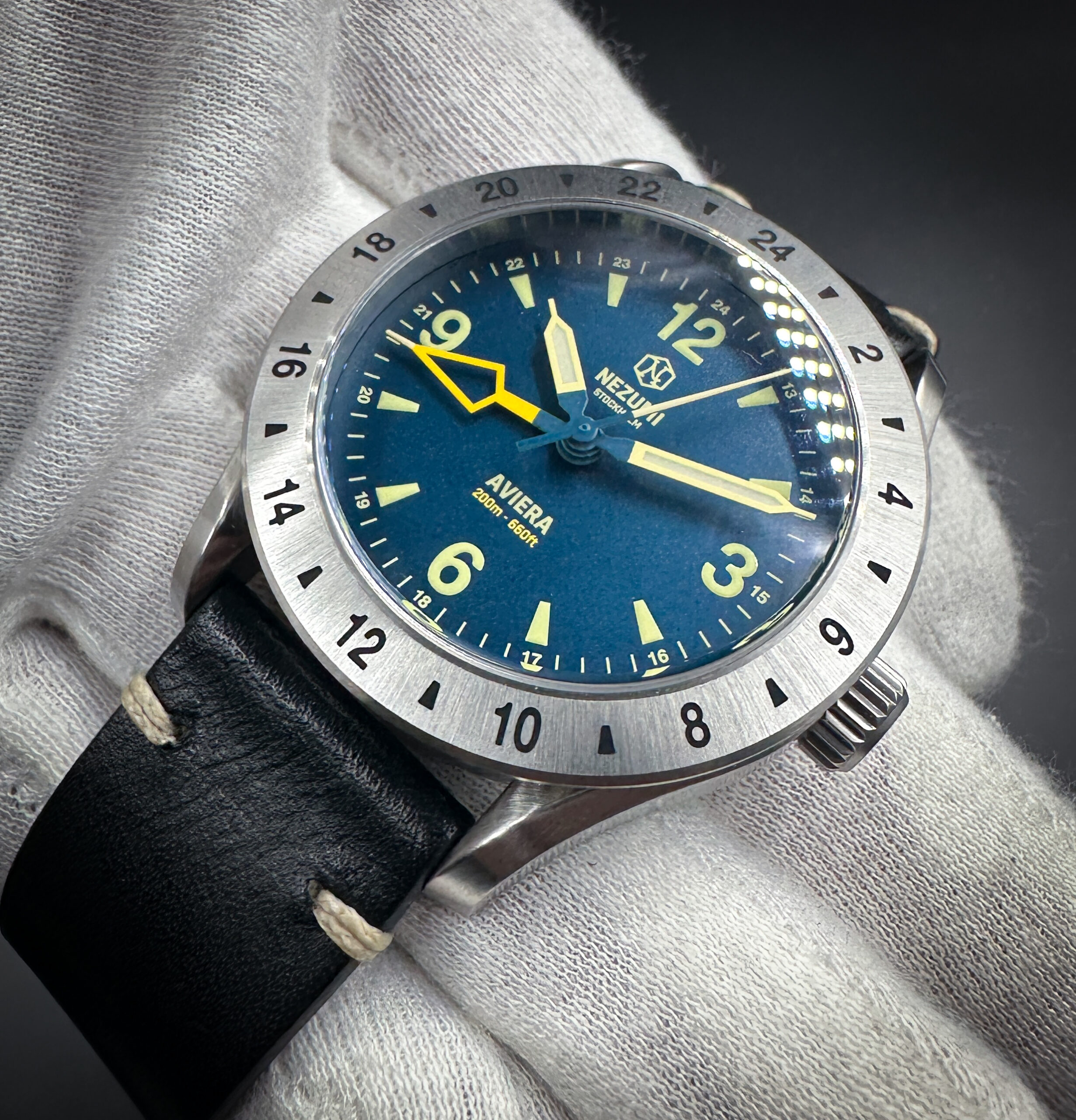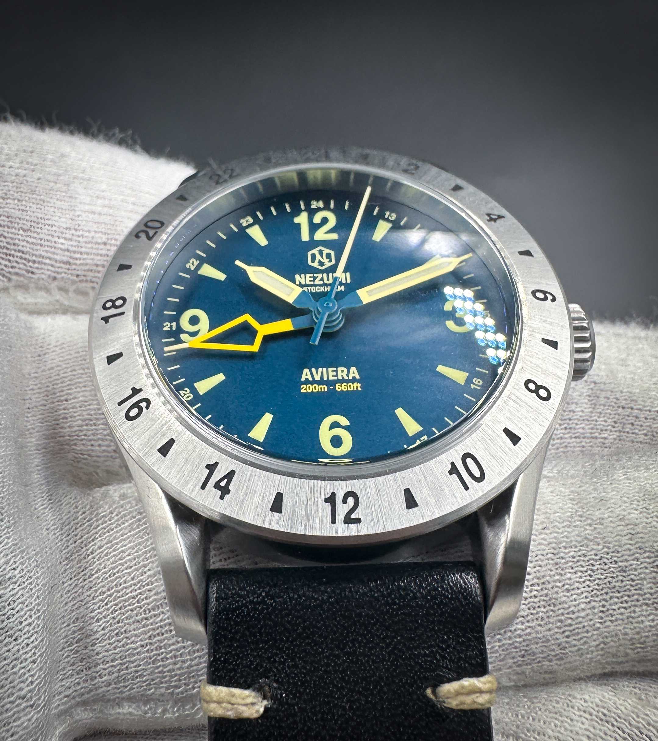 Aviera is offered in dark teal blue. The dial markings, bright yellow GMT arrow, hour, minute and seconds hands have our custom cream colored Grade X1 Swiss Super-LumiNova® for great legibility in all lighting situations.