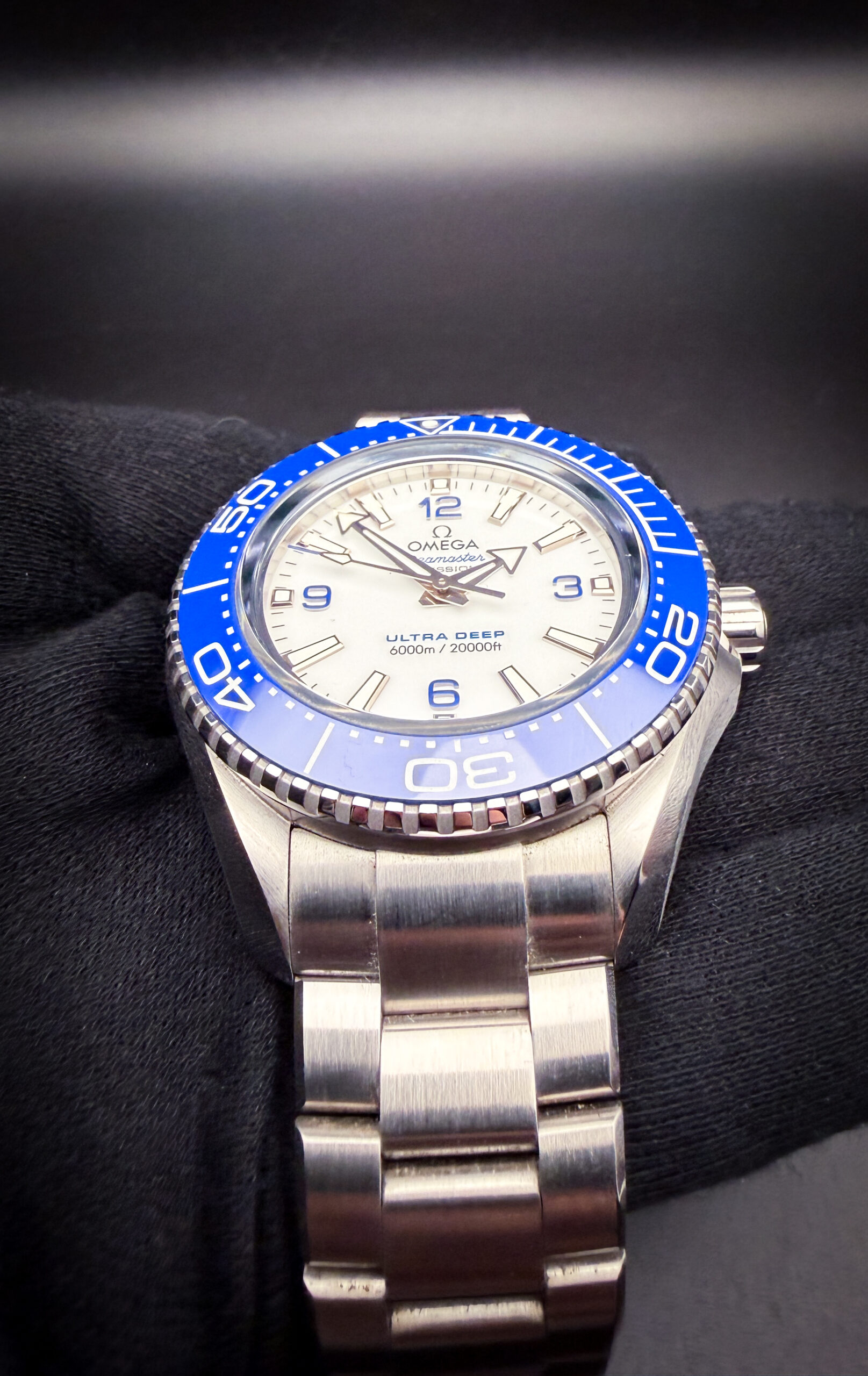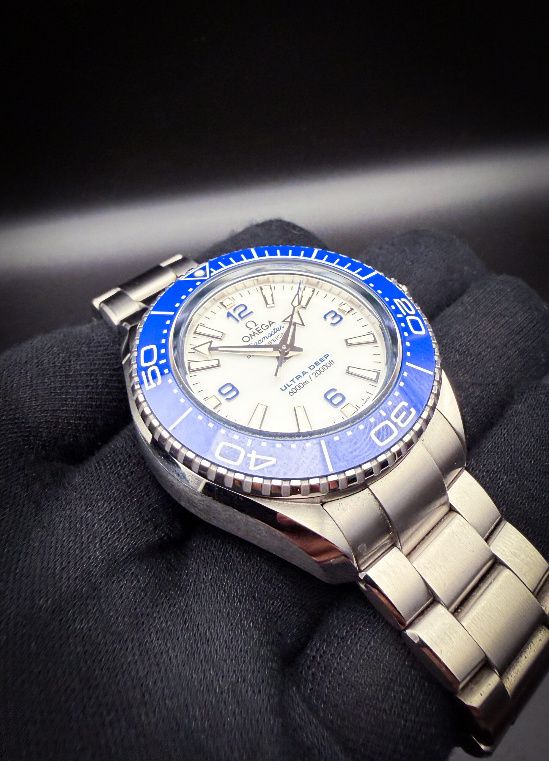 Omega Seamaster Planet Ocean Ultra Deep 216.30.46.21.04.001 in a 45.5mm stainless steel case, powered by the Omega caliber 8912 Master Chronometer movement. This reference represents Omega’s most extreme production dive watch, derived directly from the record-setting Ultra Deep prototypes that reached the Challenger Deep.