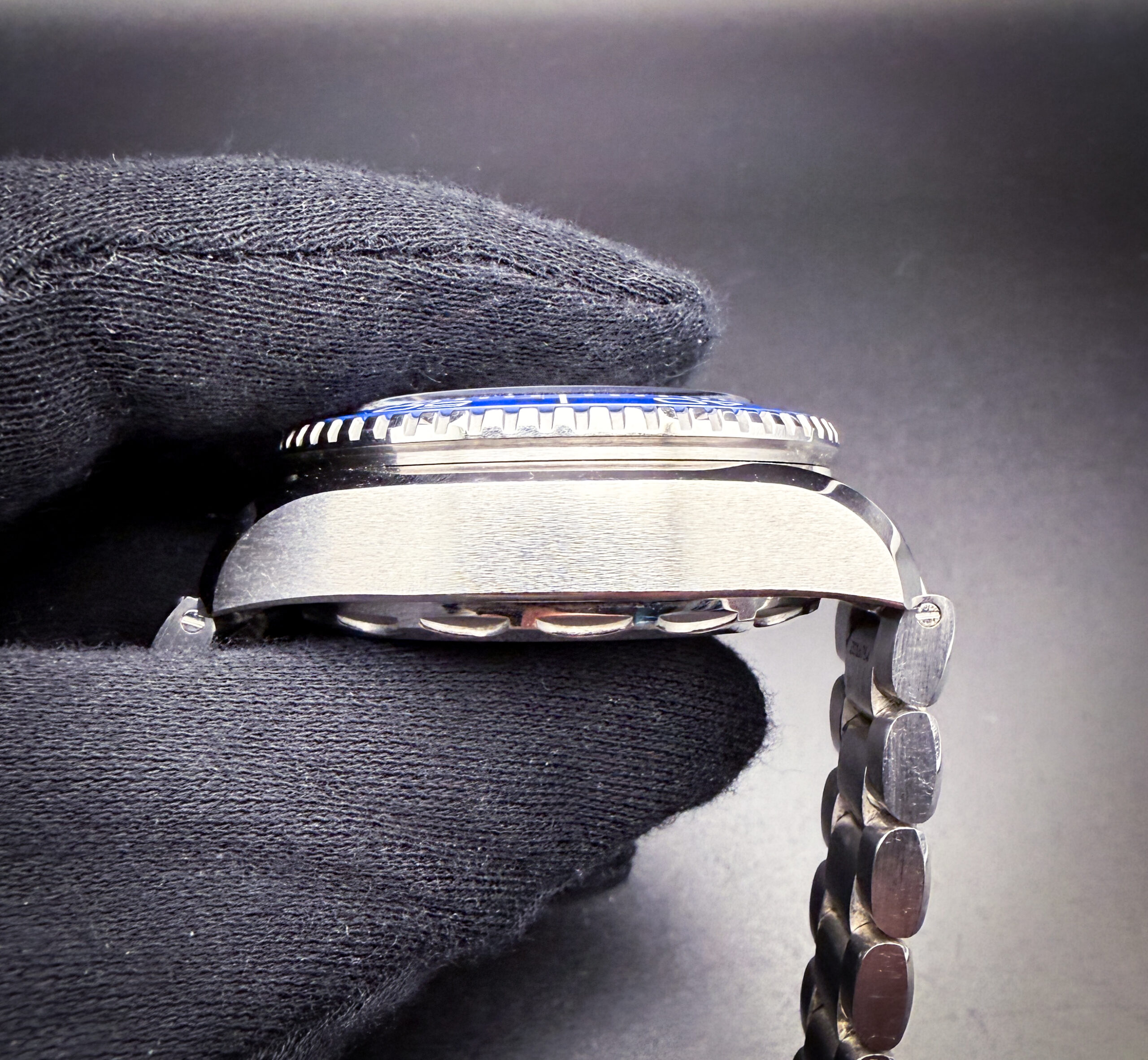 This example features the highly desirable white dial configuration with bold blue Arabic numerals and matching blue ceramic bezel, creating a striking and highly legible contrast. The dial is clean and crisp, with broad arrow hands and applied indices filled with luminous material for excellent underwater visibility.