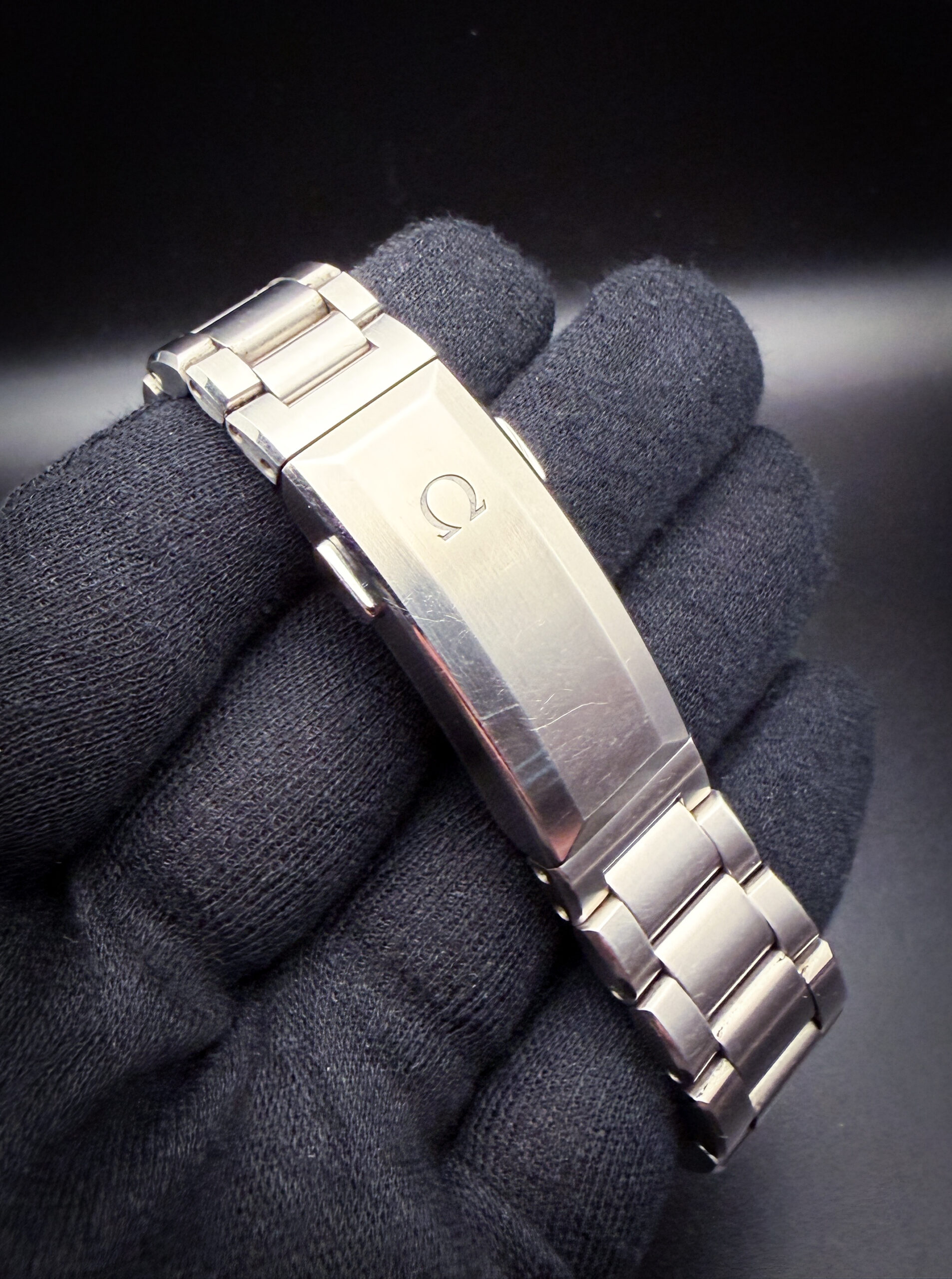 This set includes the original wooden presentation box, Omega travel case, warranty cards, leatherette wallet, and two (2) additional bracelet links. The bracelet will fit up to an 8.5 inch wrist.