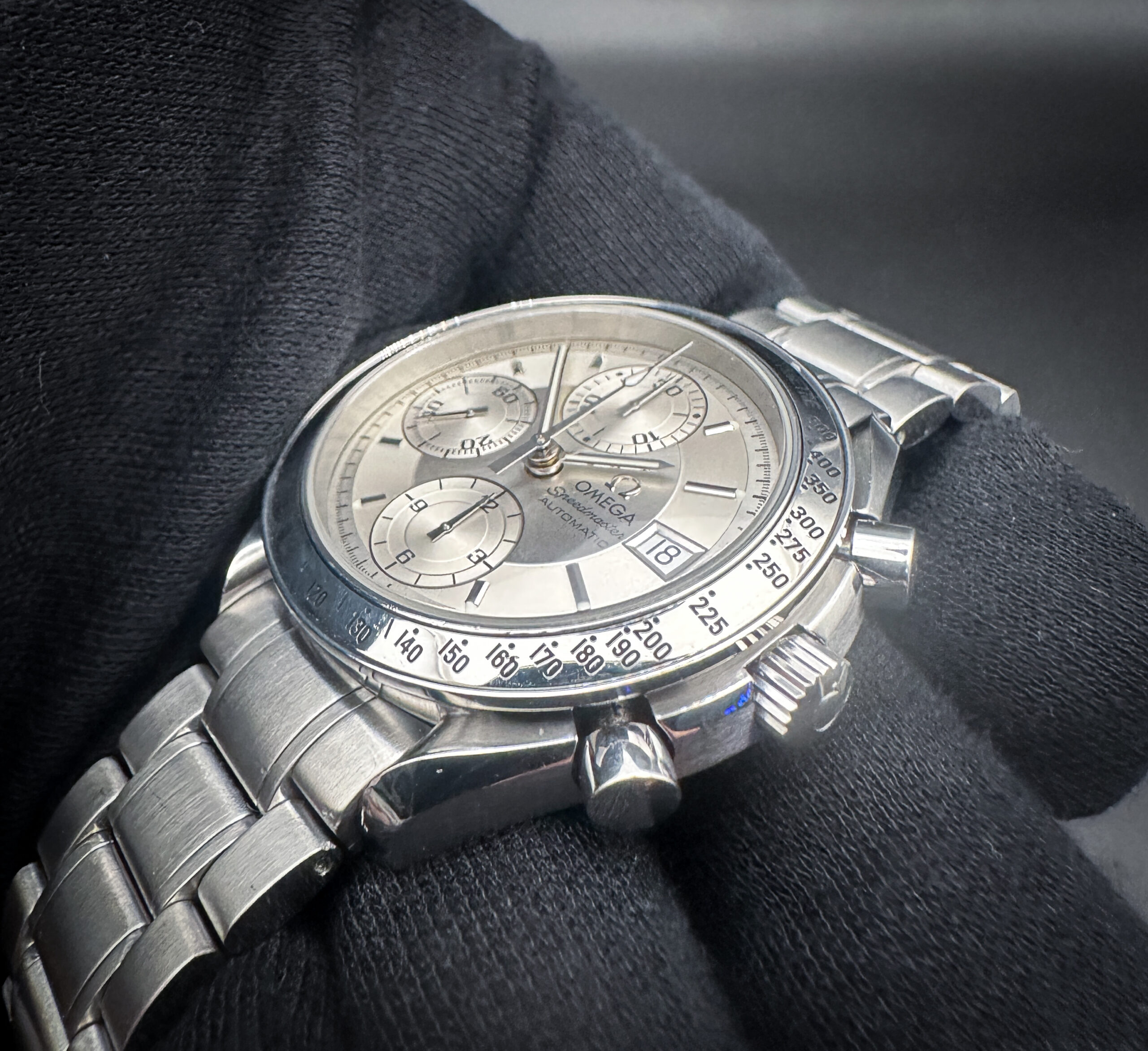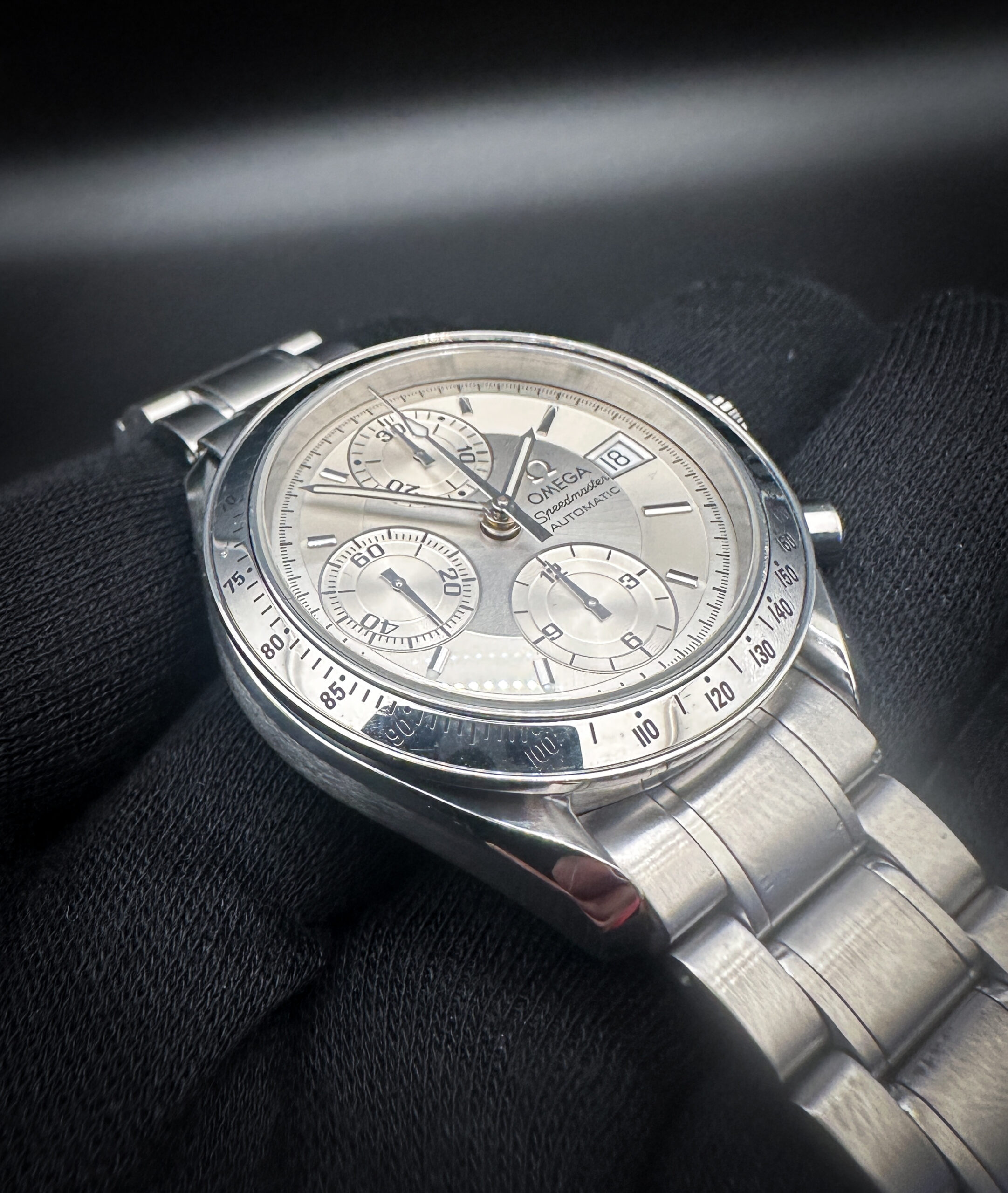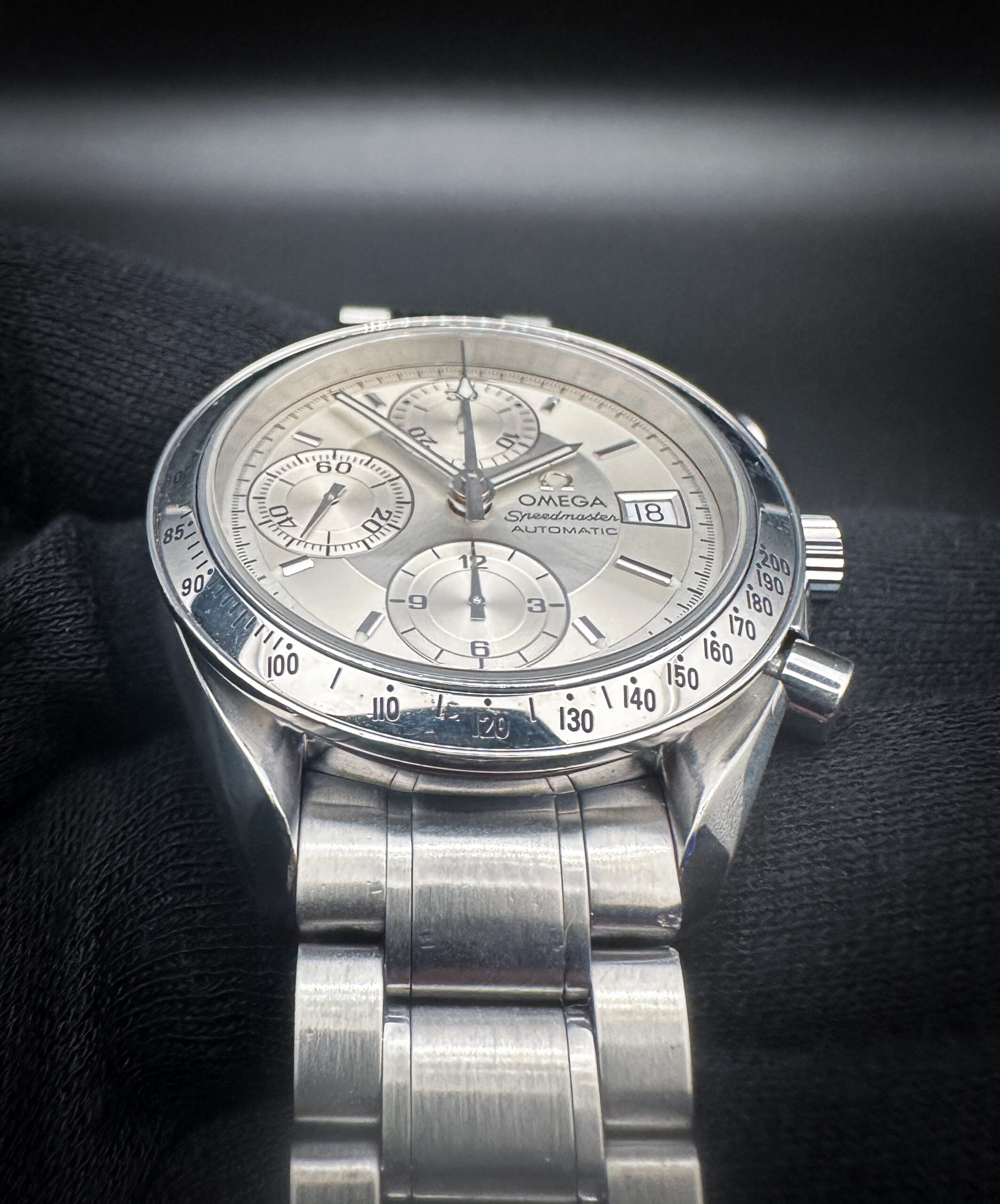 Vintage Omega Speedmaster Date 3513.30 in a 39mm stainless steel case, powered by the Omega caliber 1152 automatic chronograph. This Speedmaster has been tested in excellent working order and is ready for wear or to be added to a collection. Includes: Outer box, inner red leatherette case; instructions booklet; warranty booklet; leatherette wallet; and original warranty card (Dated 1 November, 2000).