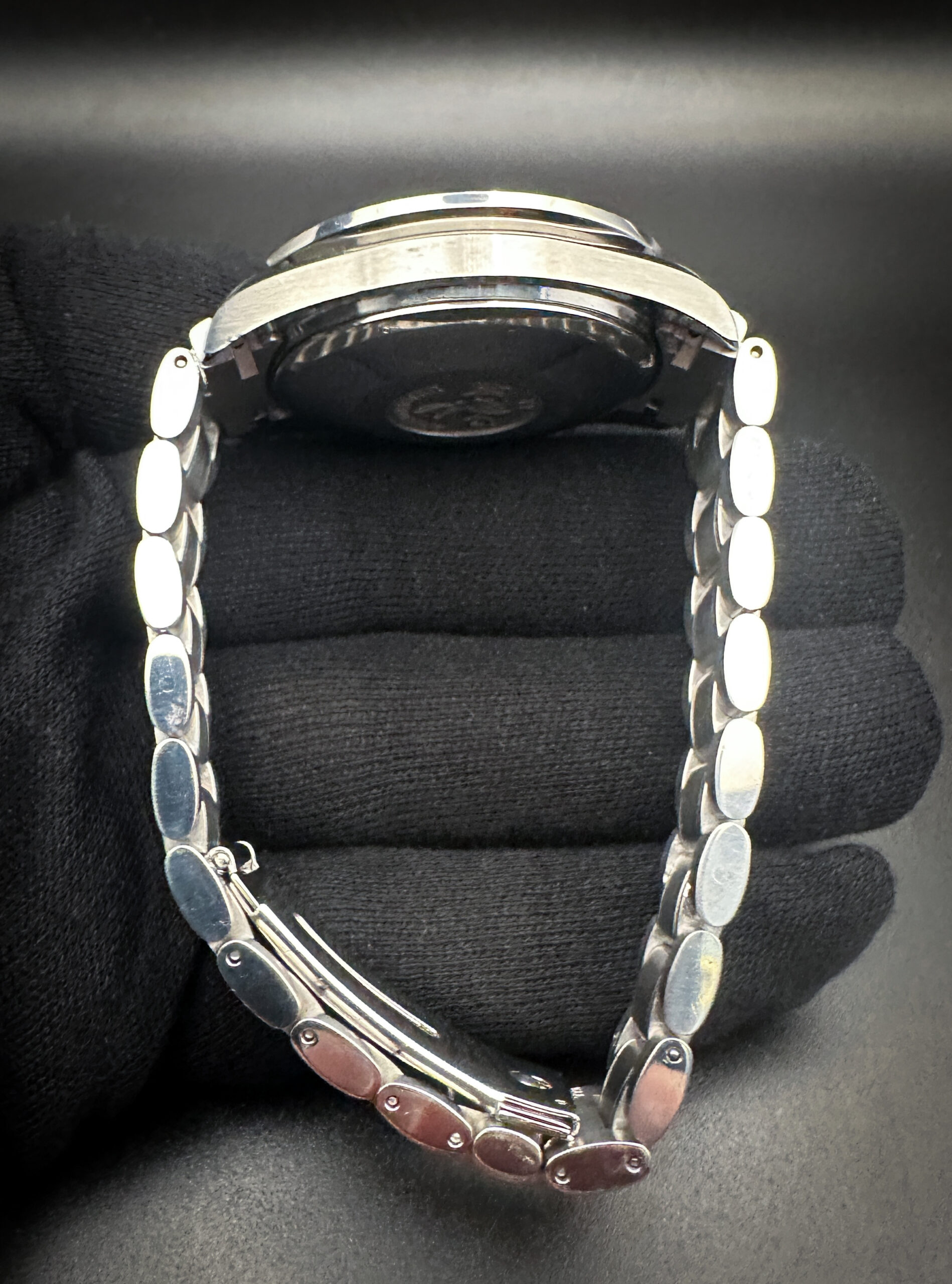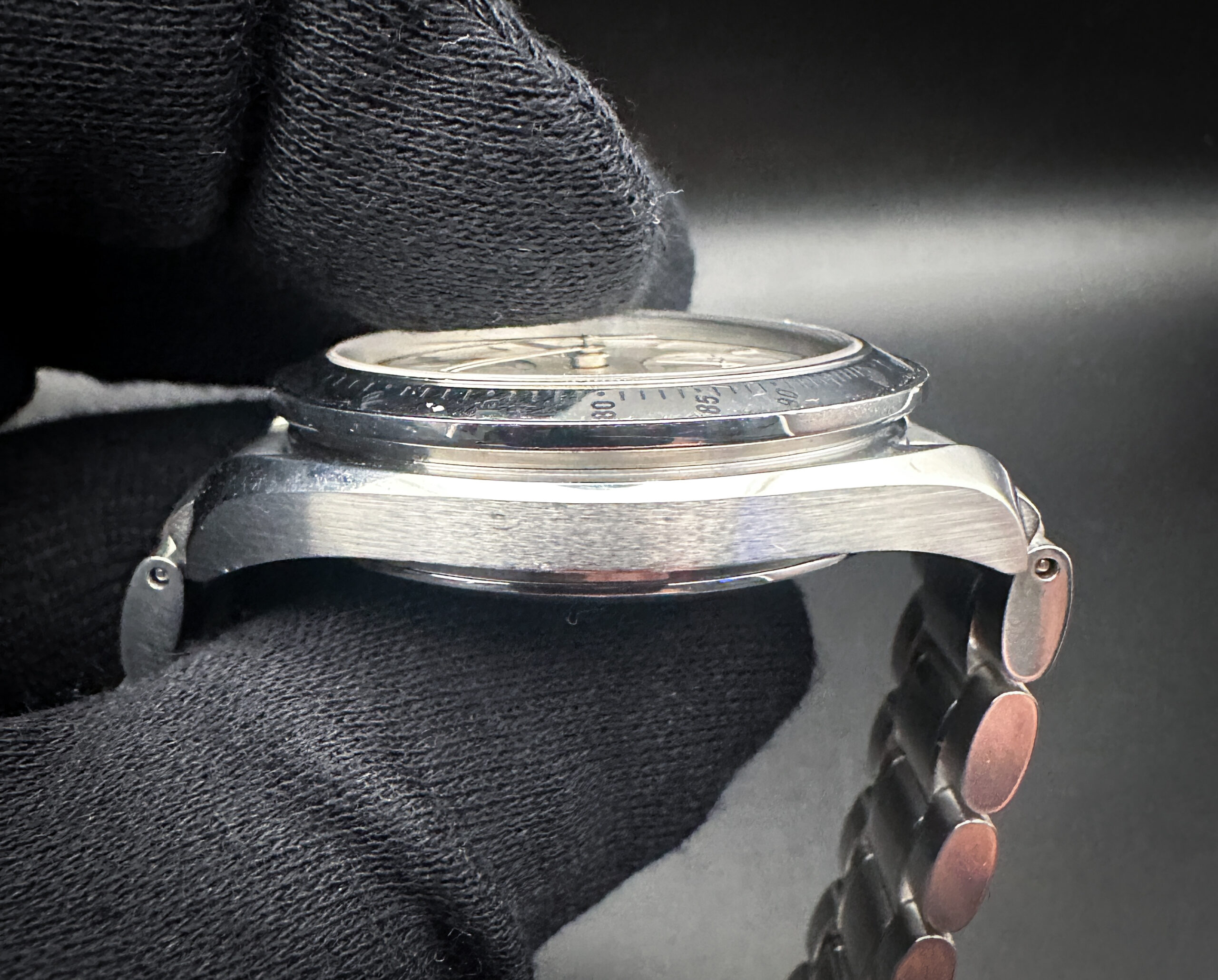 The sapphire crystal is clear and free of scratches or edge-chips. The original hands and dial are beautiful, with not stains or discoloration. The bright steel tachymetre bezel is clean, with a few faint spider lines, and clear crisp text. Overall the case is in wonderful condition with a few faint lines consistent with age and careful use, but no significant scratches, mars, or dents.