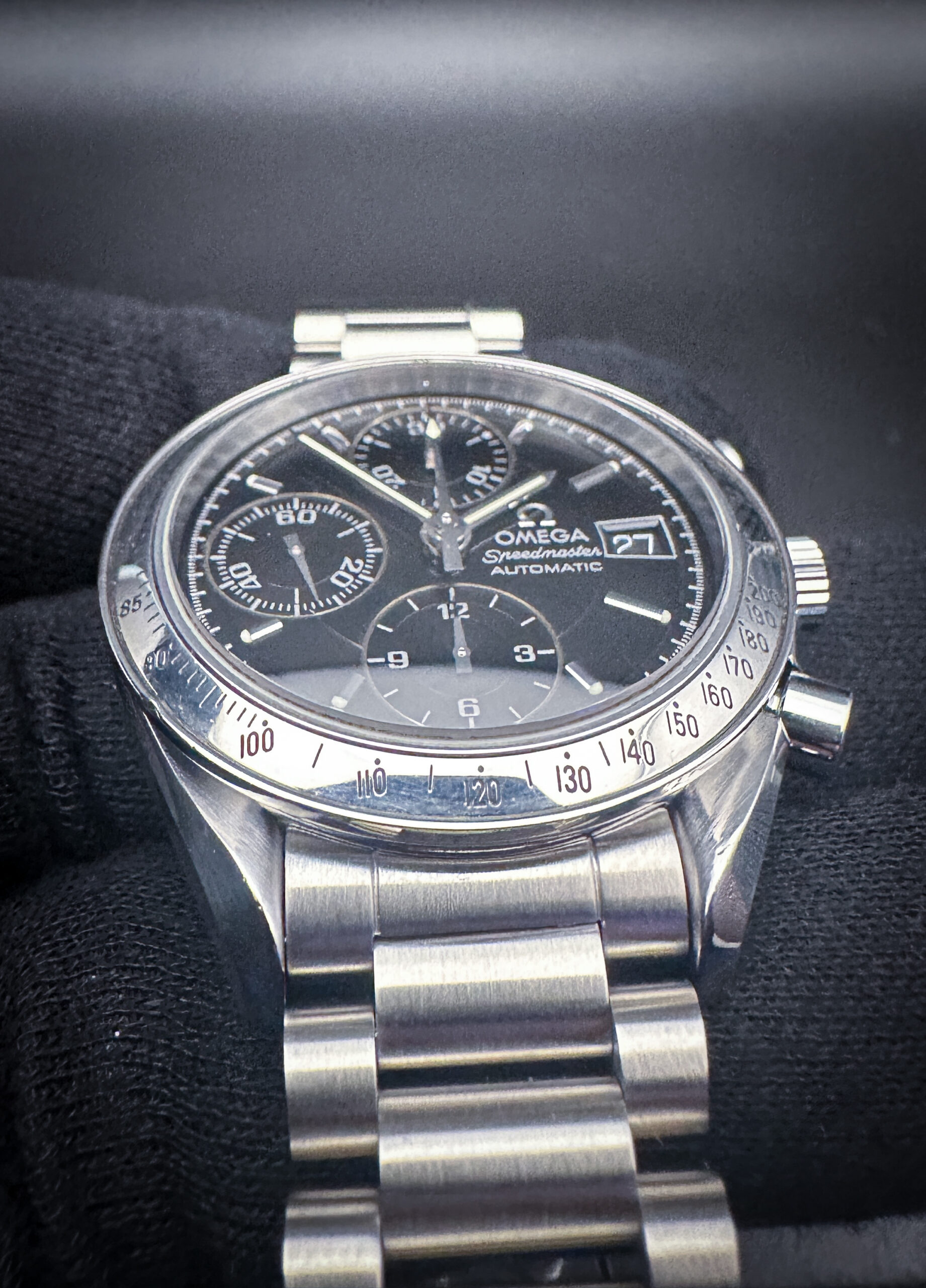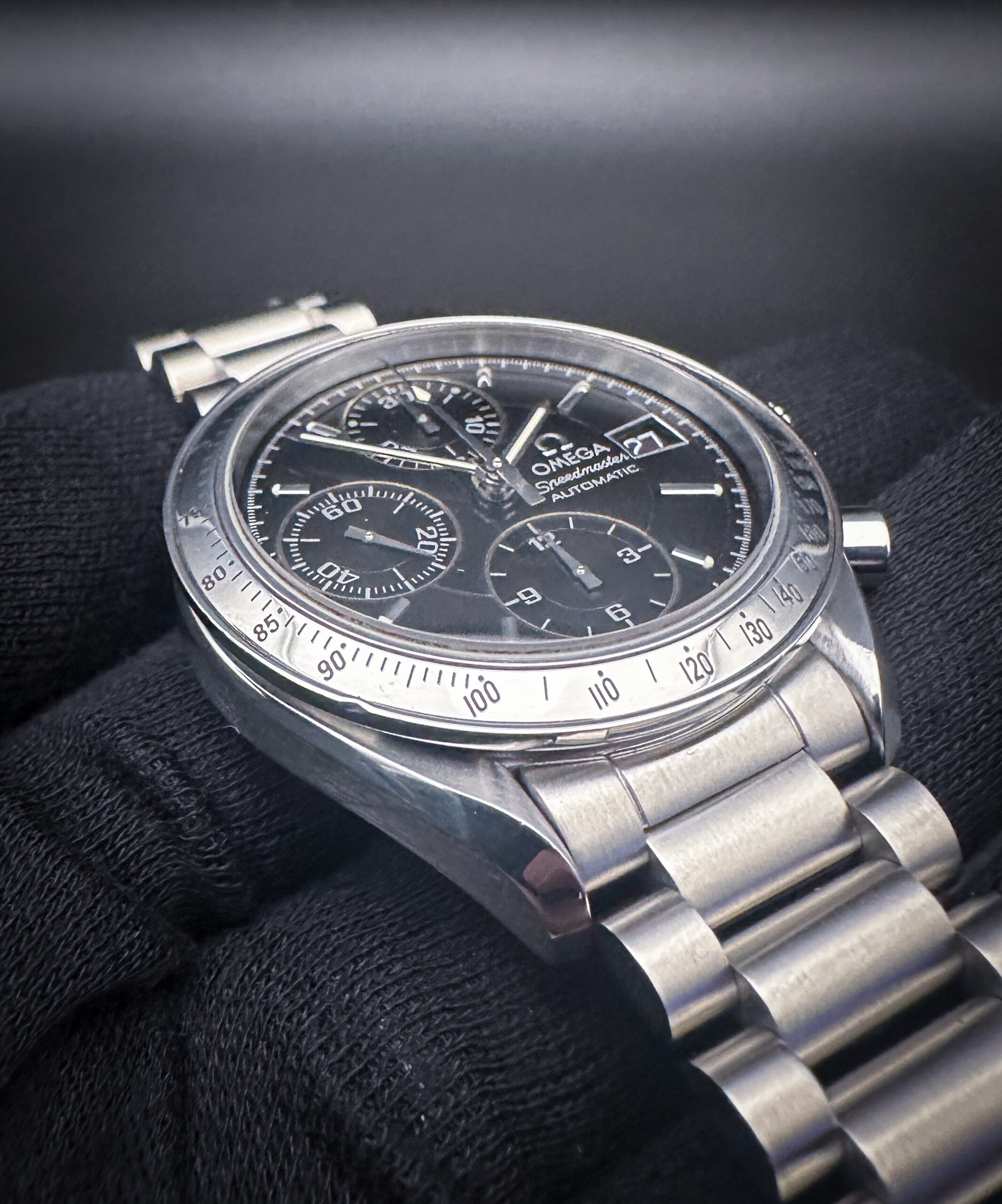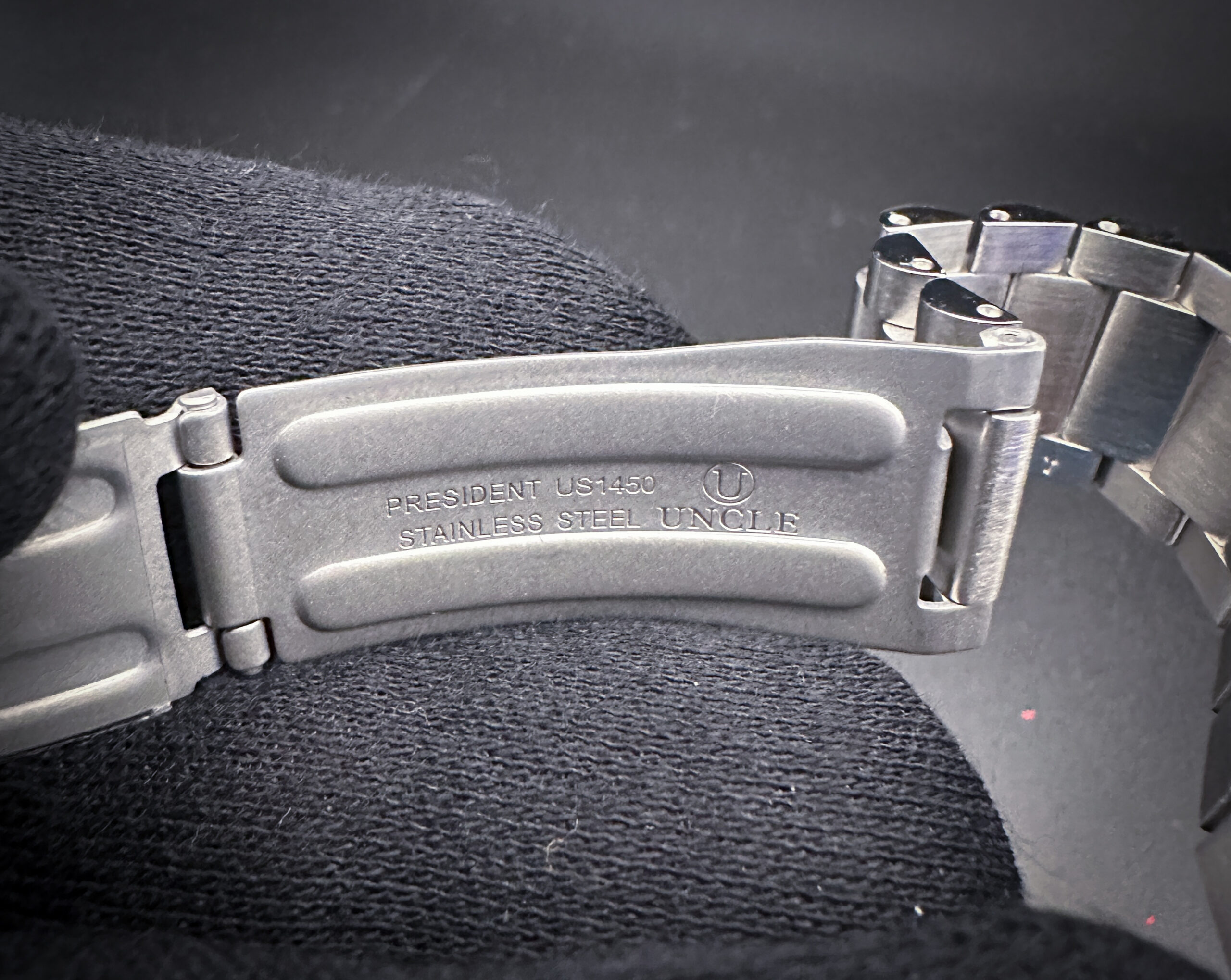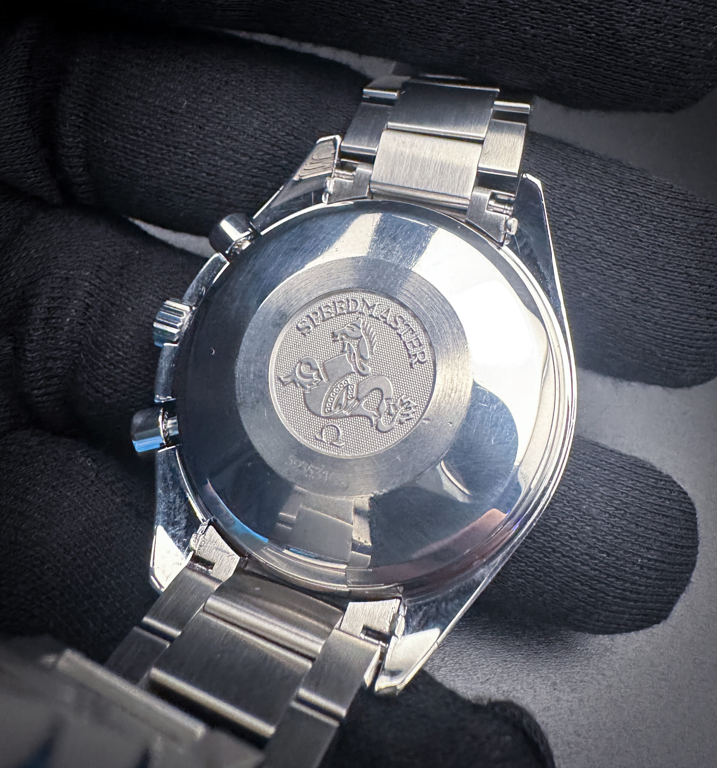 This Speedmaster is paired with a new, unworn UNCLE President 1450 stainless steel bracelet. The bracelet has nine (9) removable links currently installed and will fit up to an 8.5 inch wrist.