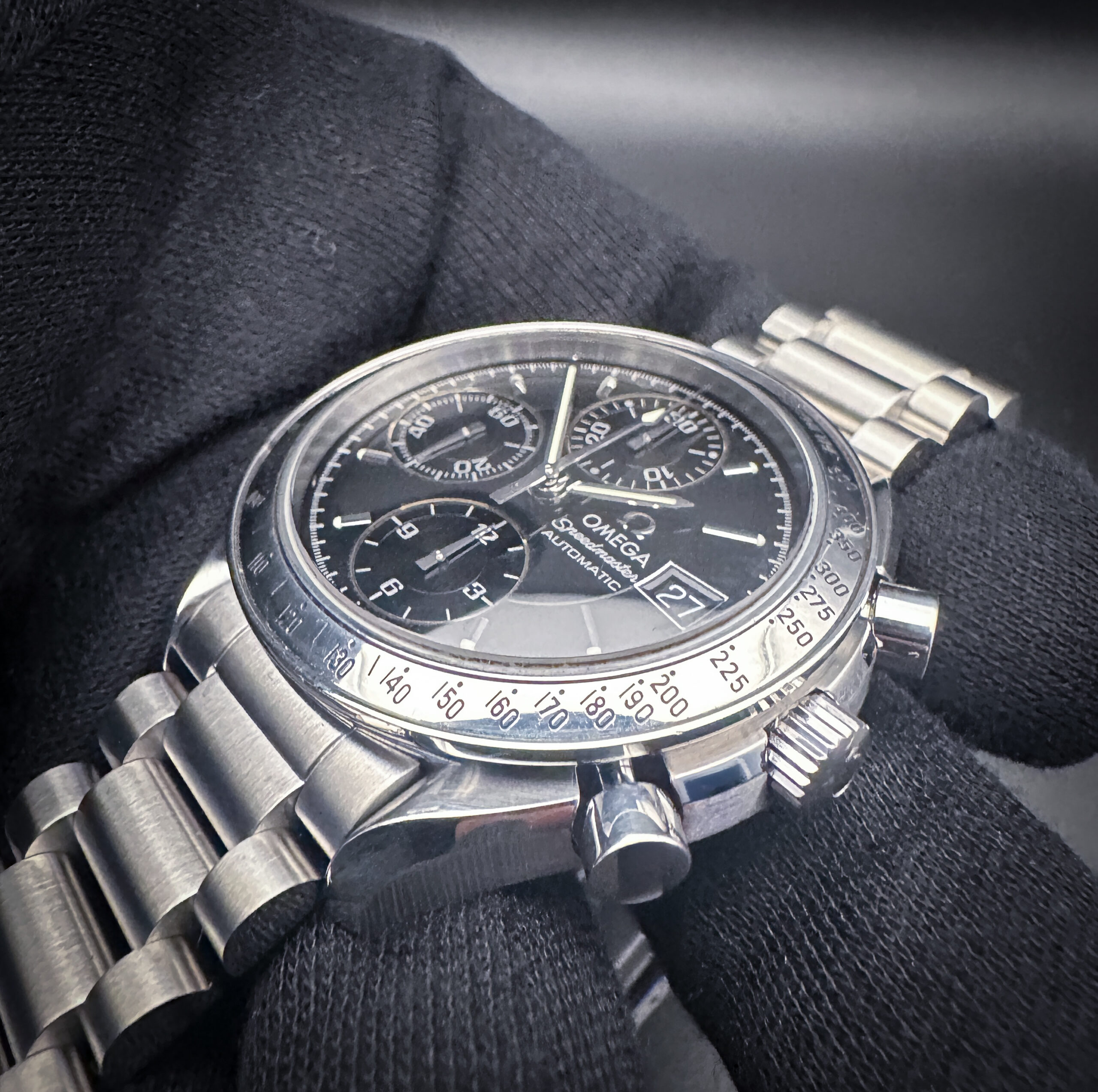 Vintage c. 1998 Omega Speedmaster Date 3513.50.00 in a 39mm stainless steel case, featuring the Omega calibre 1152 automatic movement. This Omega has been tested in excellent working order and is ready for wear or to add to a collection. Includes: outer box; inner case, instruction booklet; leatherette wallet; serial-matching hang-tag; open warranty card; and pictogram card. Please note that the leatherette wallet and case are flaking as common with these vintage accessories.