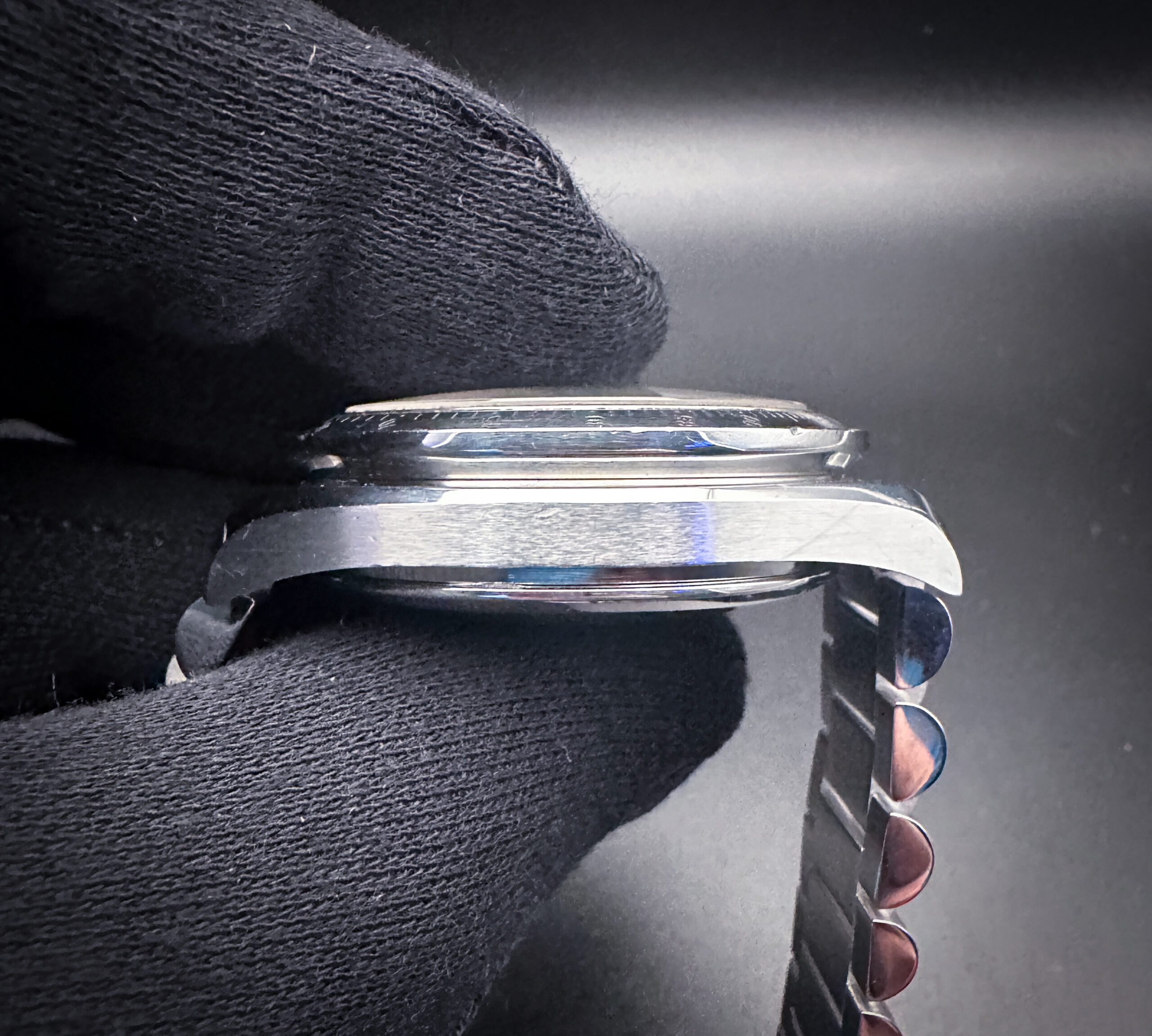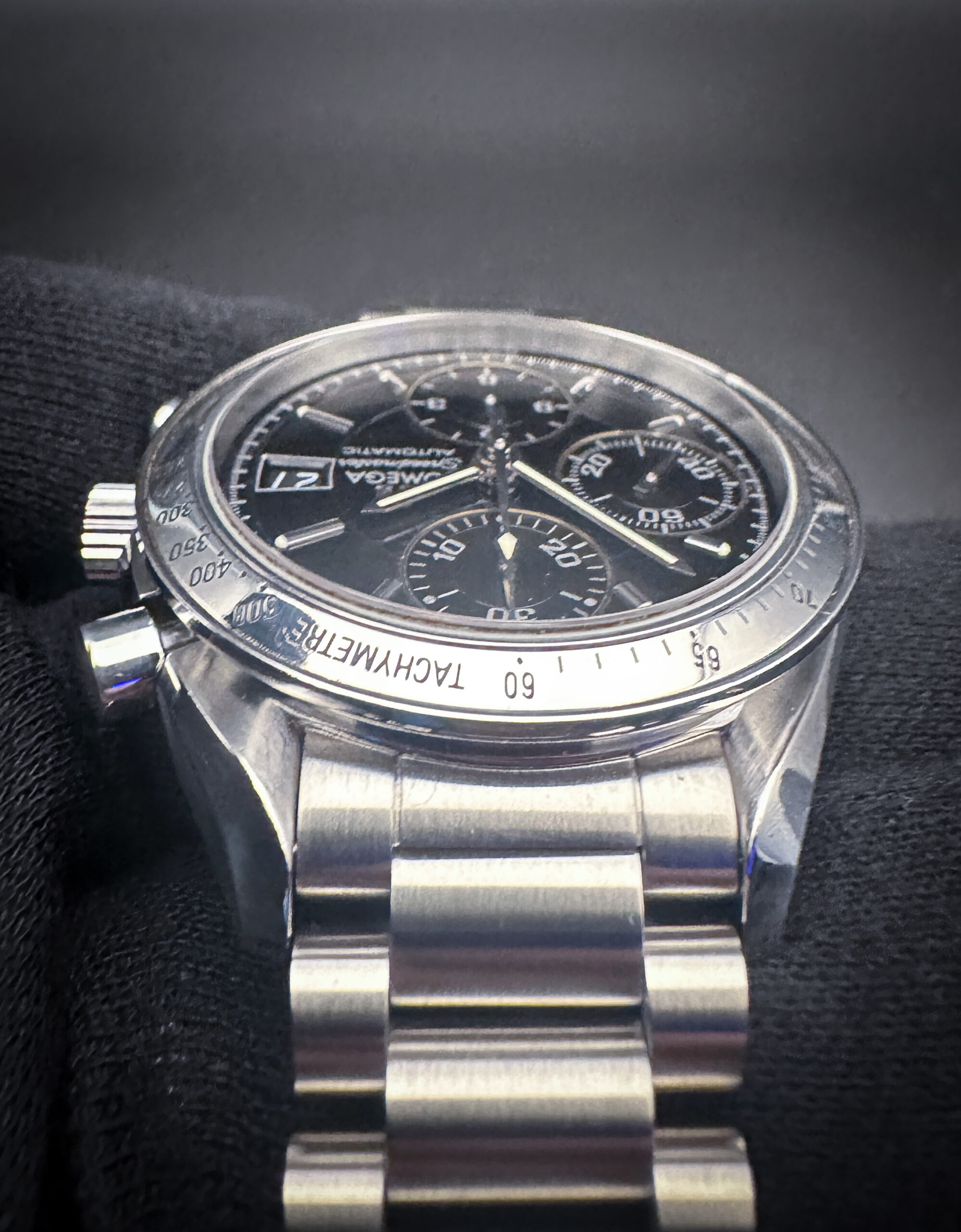 The sapphire crystal is clear and free of scratches or mars. The original dial and hands are beautiful with light patina around the sub-dial circles under magnification. The tachymetre bezel is clean, with clear script and very faint marks consistent with age. The bezel has one mark at the 8 o’clock position. Overall the case is in excellent condition with light spider lines consistent with age and careful use.