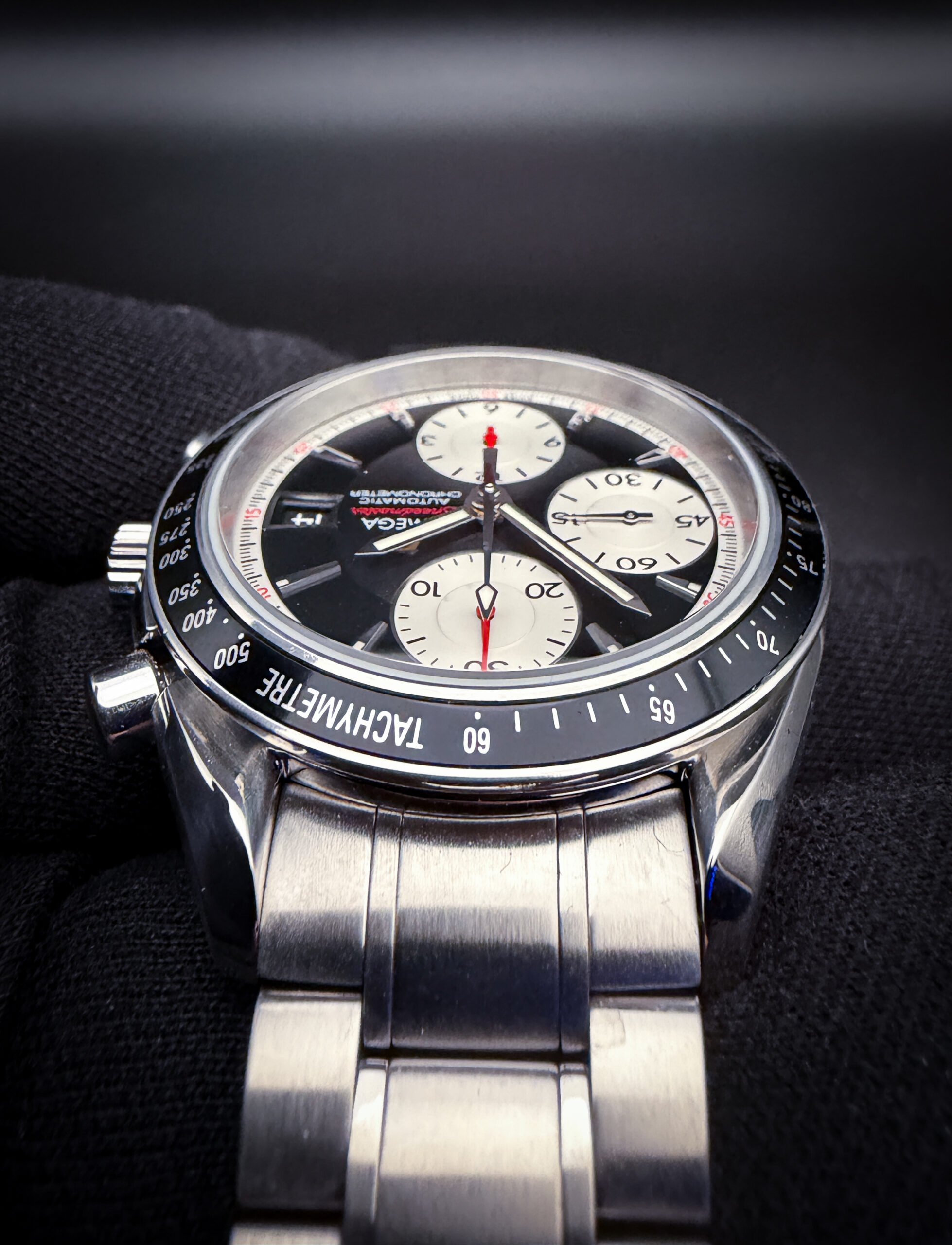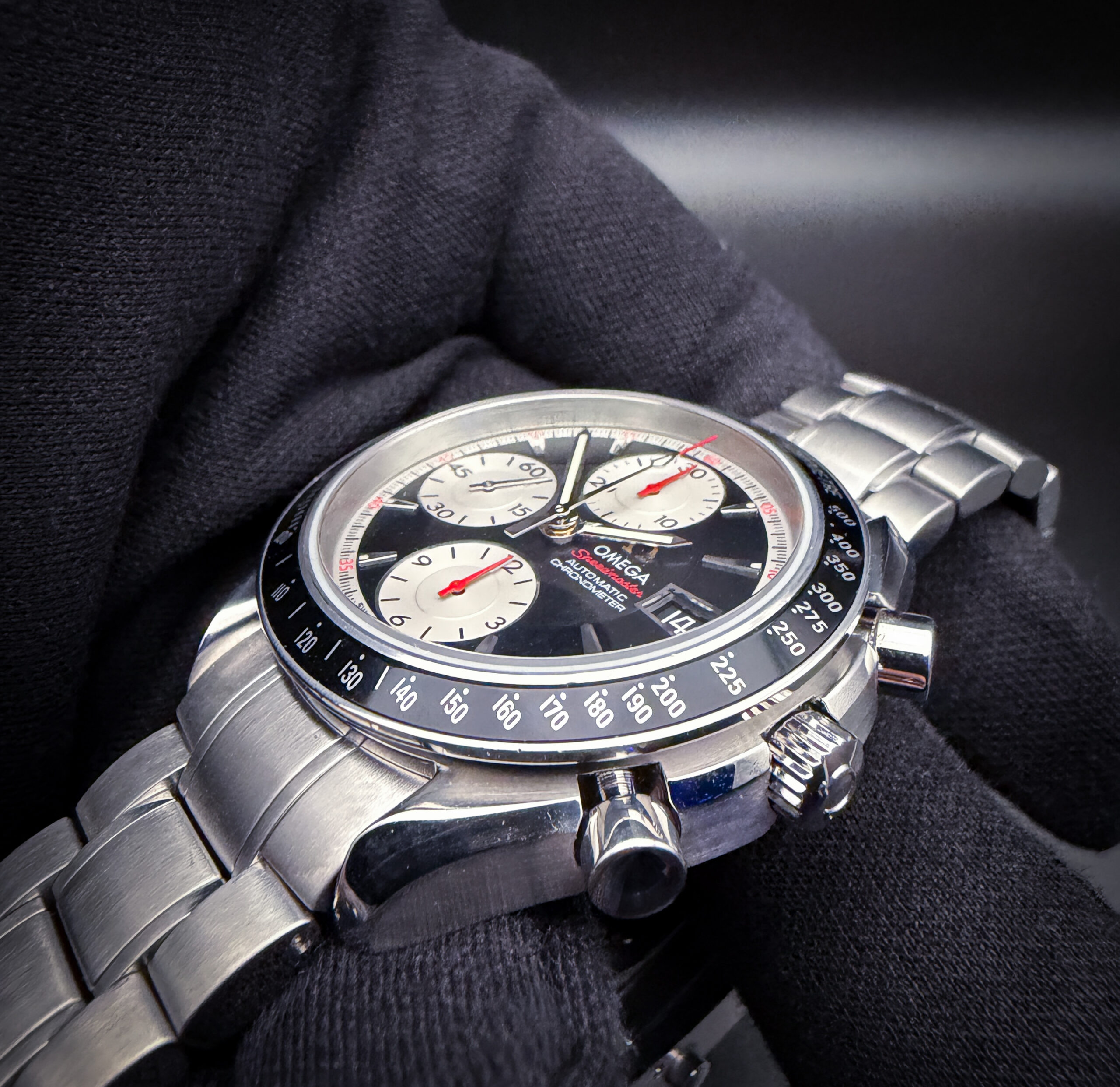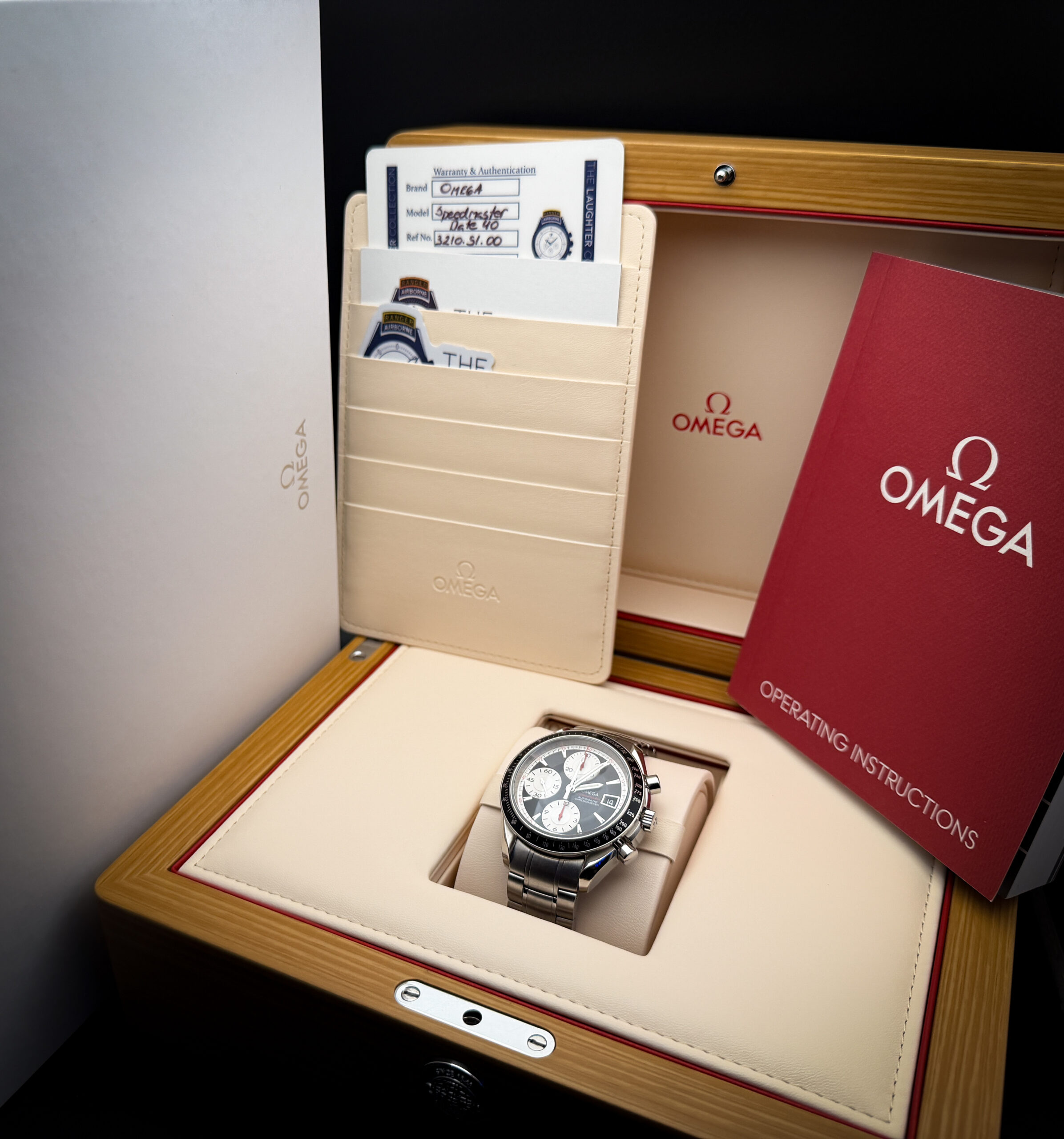 Offered here is the Omega Speedmaster Date 40mm Ref. 3210.51.00, a bold and highly legible automatic chronograph that blends classic Speedmaster DNA with modern sport styling. This example features a striking black dial with contrasting silver sub-dials in a panda-style configuration. The dial is accented with red chronograph details, including the central seconds hand and red script “Speedmaster” text, giving the watch a dynamic, motorsport-inspired presence. Applied luminous hour markers and broad arrow-style hands ensure excellent readability.