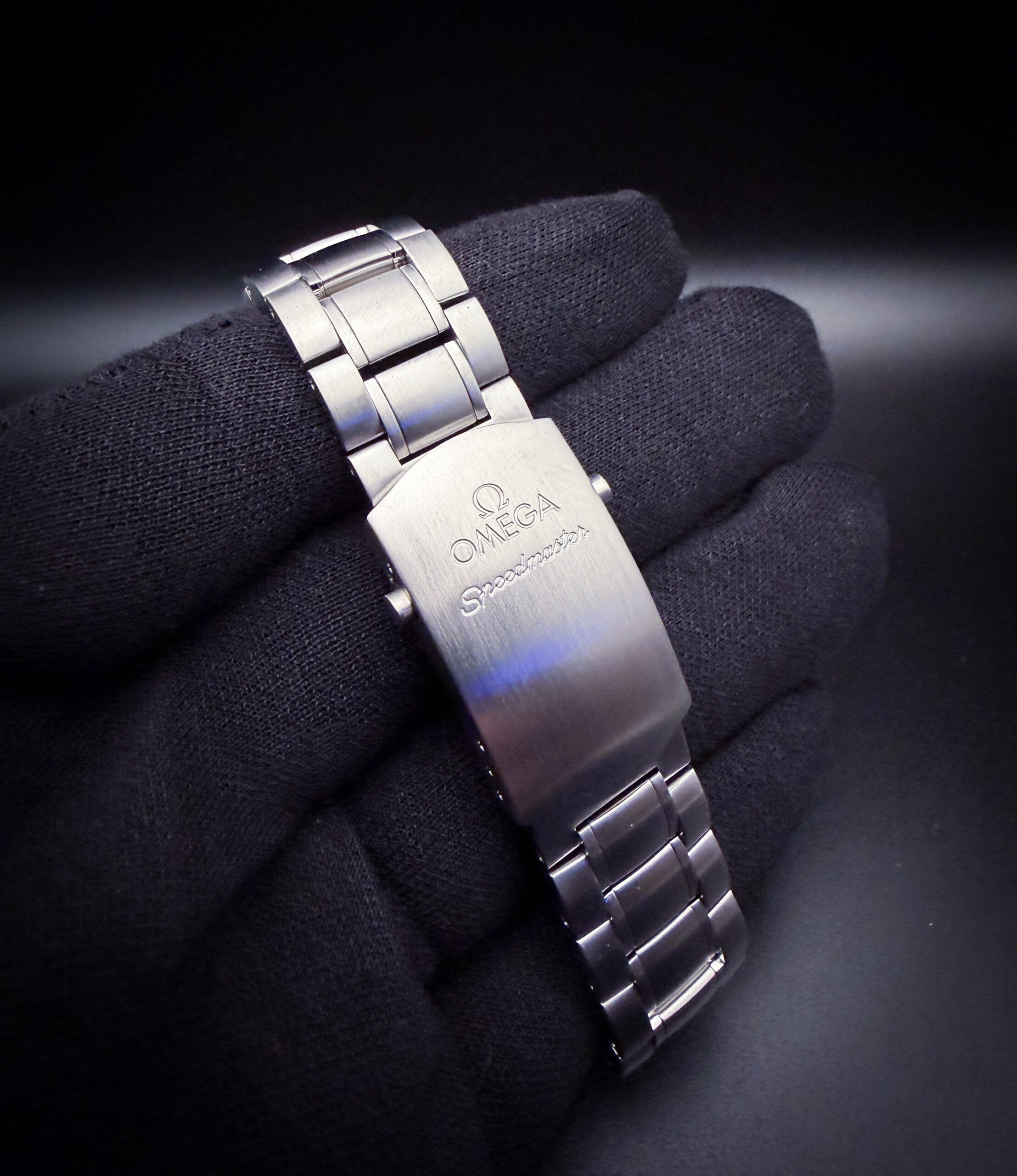 The 40mm stainless steel case is paired with a black tachymeter bezel, staying true to the Speedmaster heritage while offering a slightly more compact and versatile wear compared to the Professional models. The date window is positioned at 3 o’clock and integrates cleanly into the dial layout.